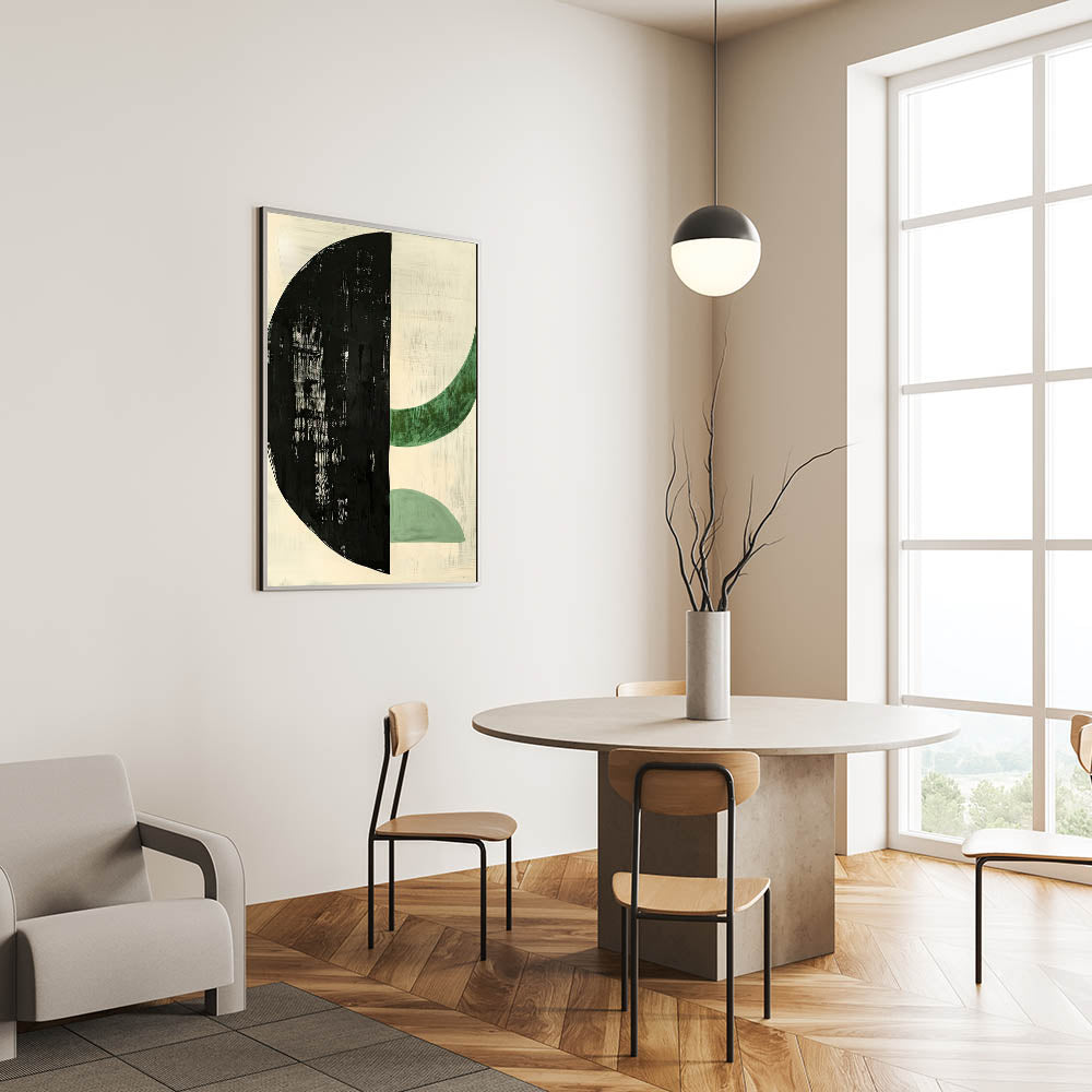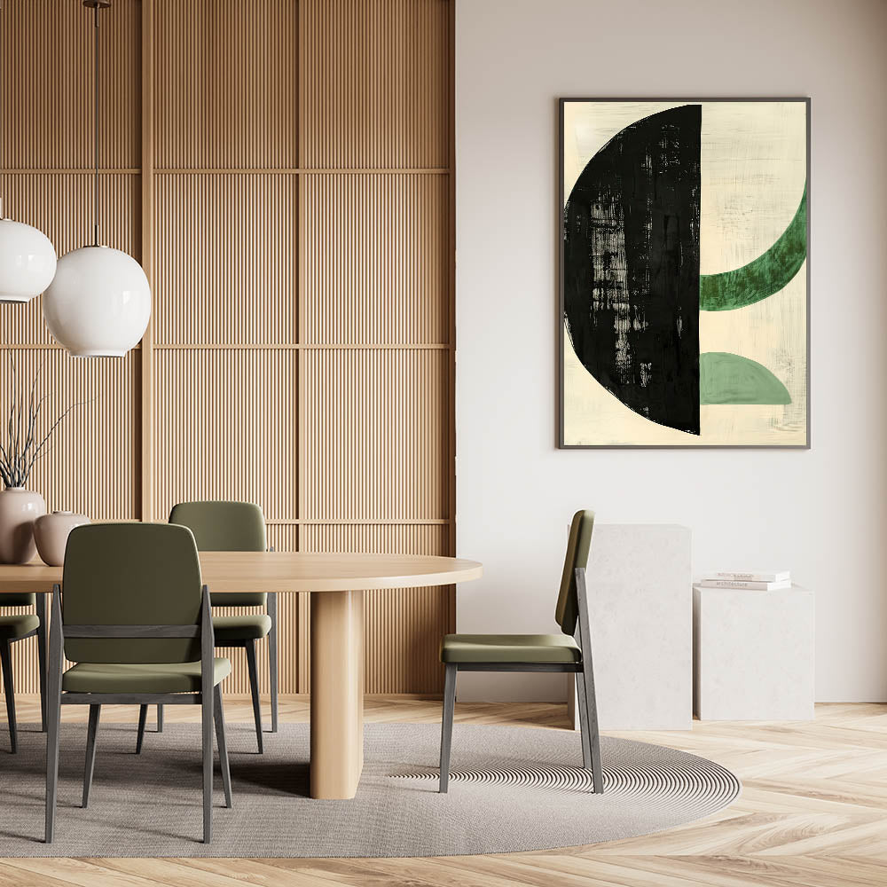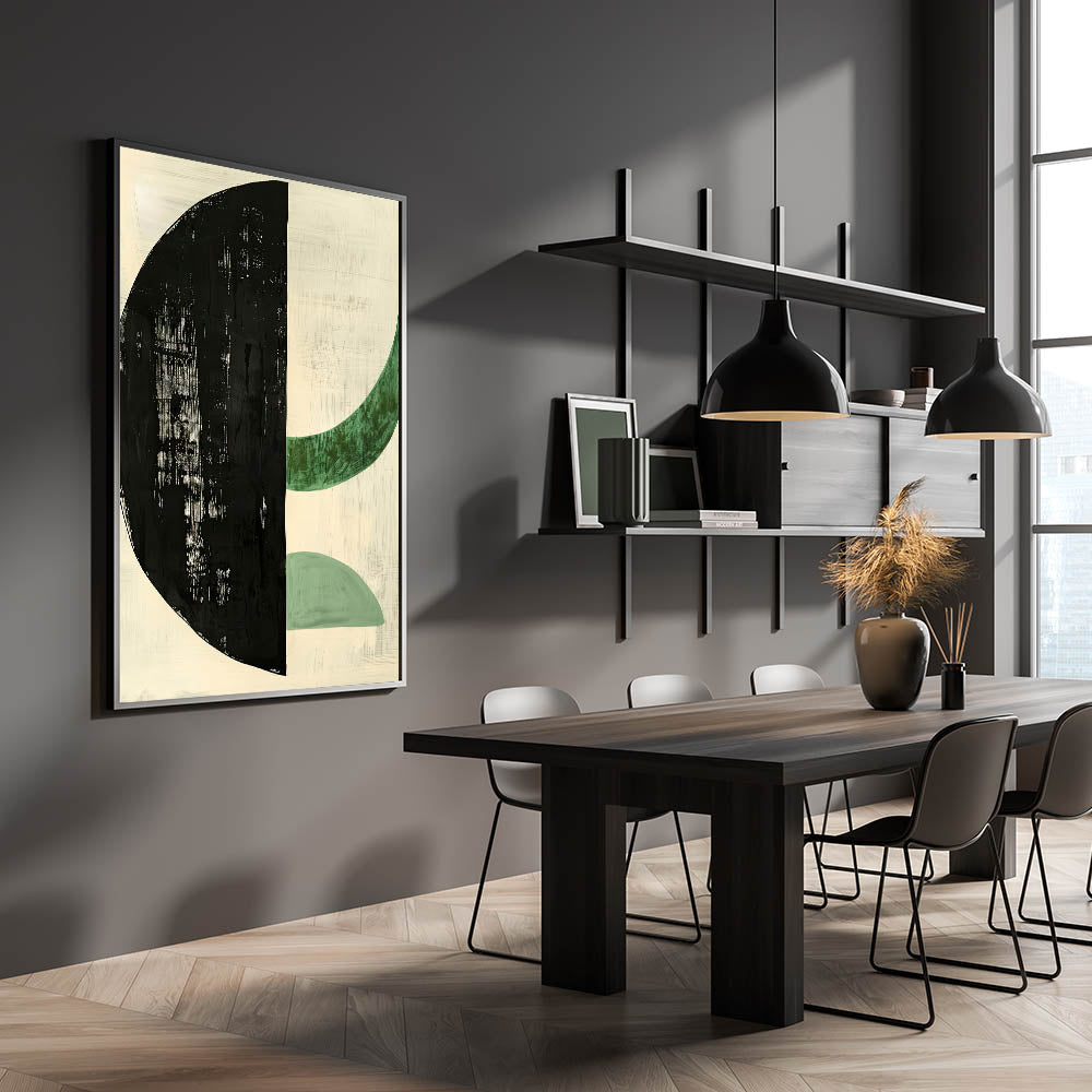 Add a touch of modern sophistication to your dining space with this elegant dining room wall art, featuring a bold geometric composition in black and green. The striking contrast between the deep black half-circle and soft green curved forms creates a balanced, contemporary aesthetic. Perfect for minimalist, modern, or Scandinavian-inspired interiors, this artwork enhances your dining area with artistic flair.
