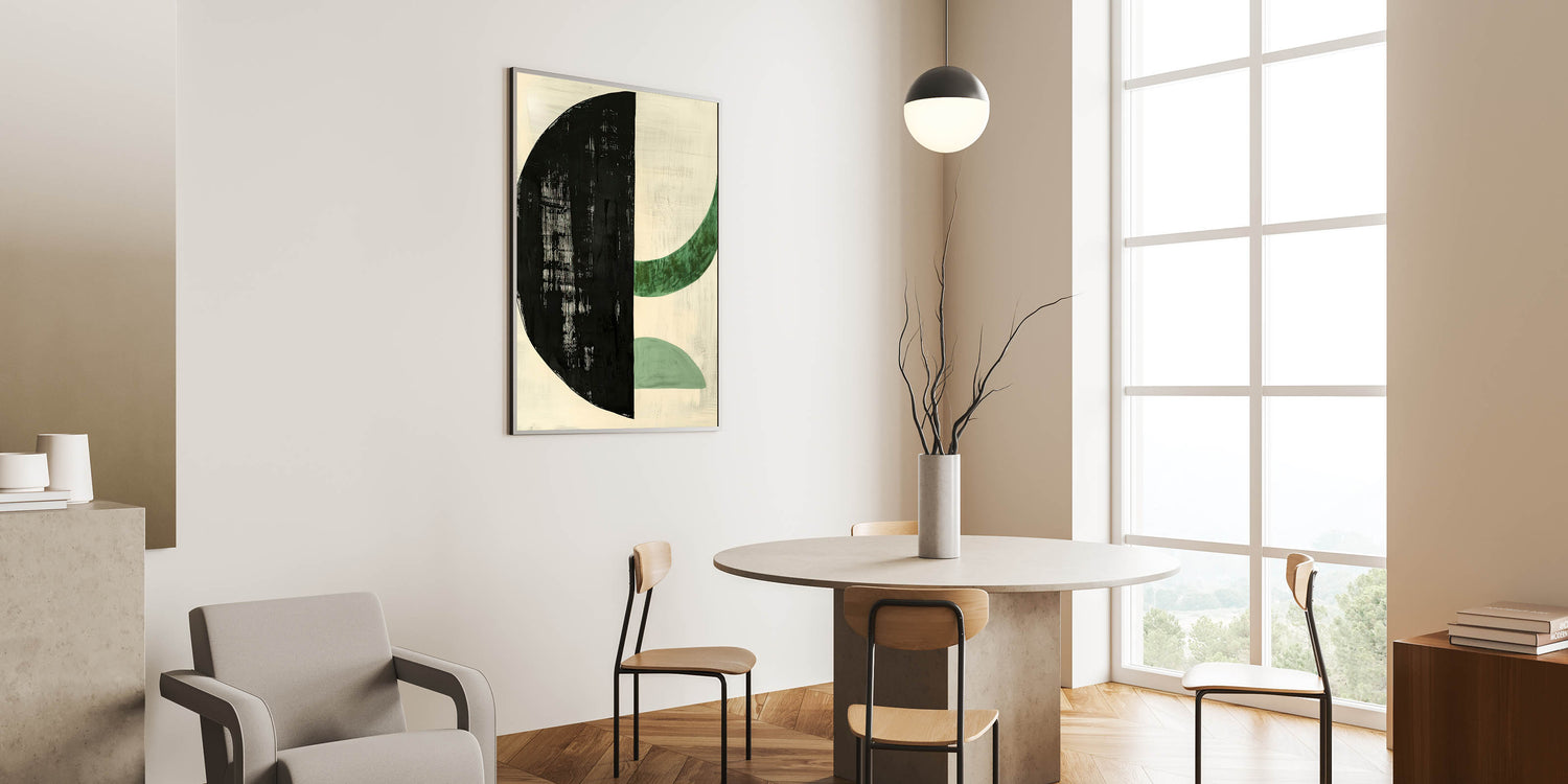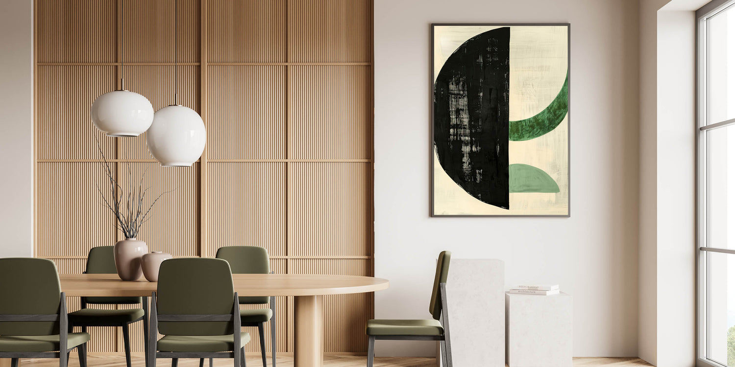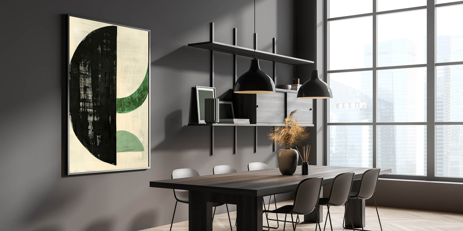 Add a touch of modern sophistication to your dining space with this elegant dining room wall art, featuring a bold geometric composition in black and green. The striking contrast between the deep black half-circle and soft green curved forms creates a balanced, contemporary aesthetic. Perfect for minimalist, modern, or Scandinavian-inspired interiors, this artwork enhances your dining area with artistic flair.