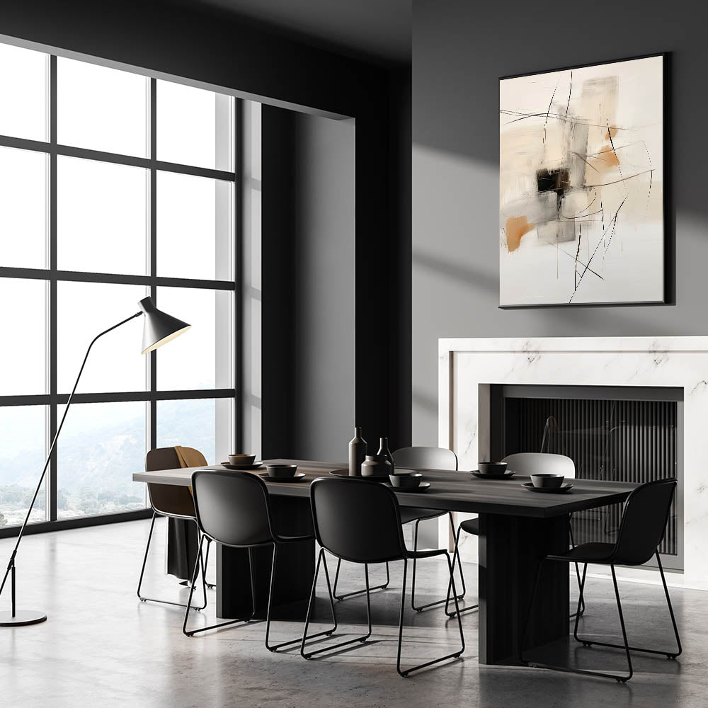 Upgrade your dining space with this elegant dining room wall art, featuring a sophisticated abstract design in black, beige, gray, and orange. The expressive brushstrokes and intricate linework create a dynamic yet refined aesthetic, making it a perfect choice for modern dining room art lovers.