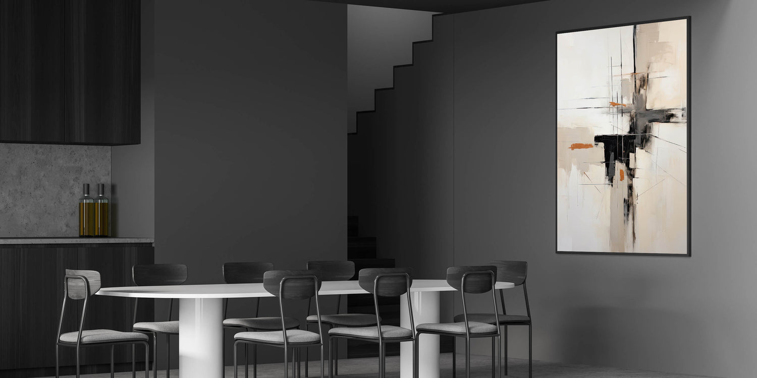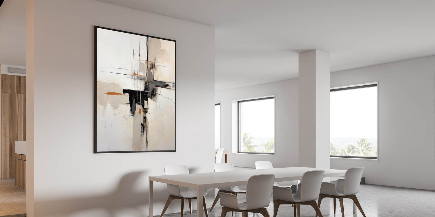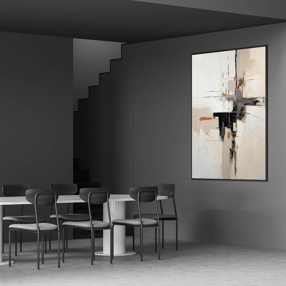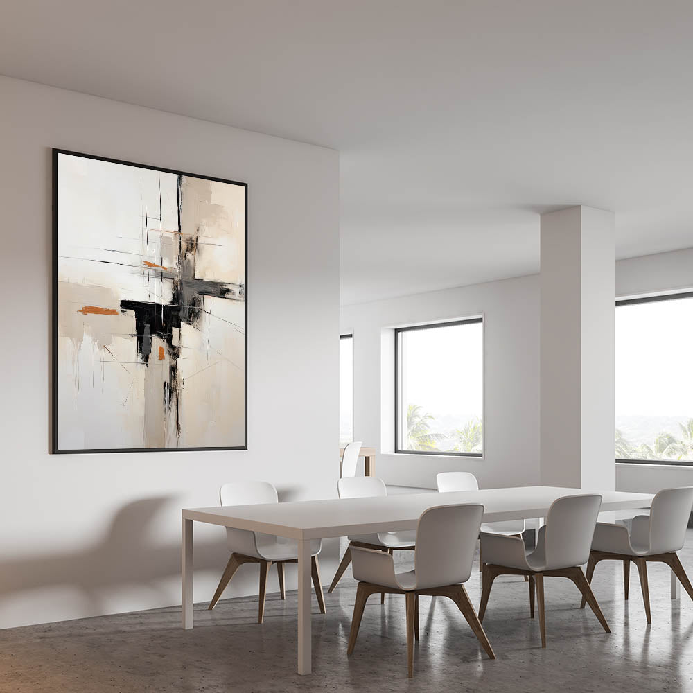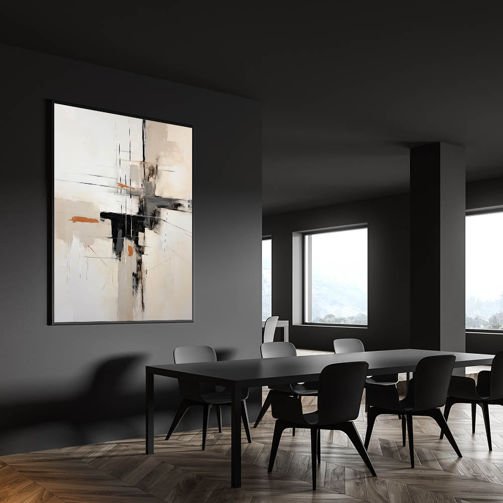 Transform your dining area with this elegant dining room wall art, designed to elevate modern and contemporary spaces. The black, beige, and subtle orange accents create a refined yet striking aesthetic, making it an ideal choice for modern dining room art lovers. The abstract composition features delicate lines and textured brushstrokes, bringing depth and sophistication to your décor.