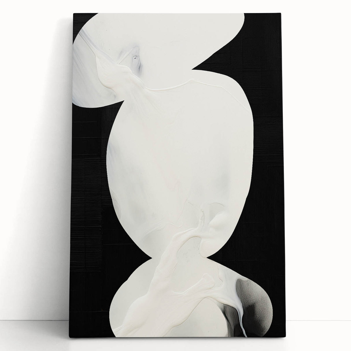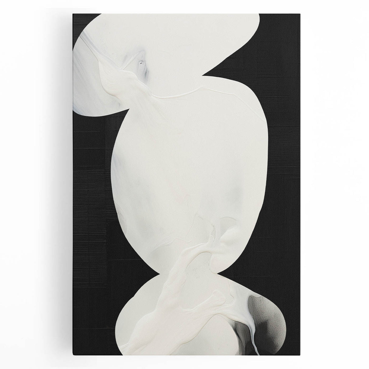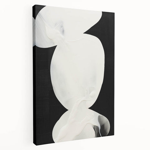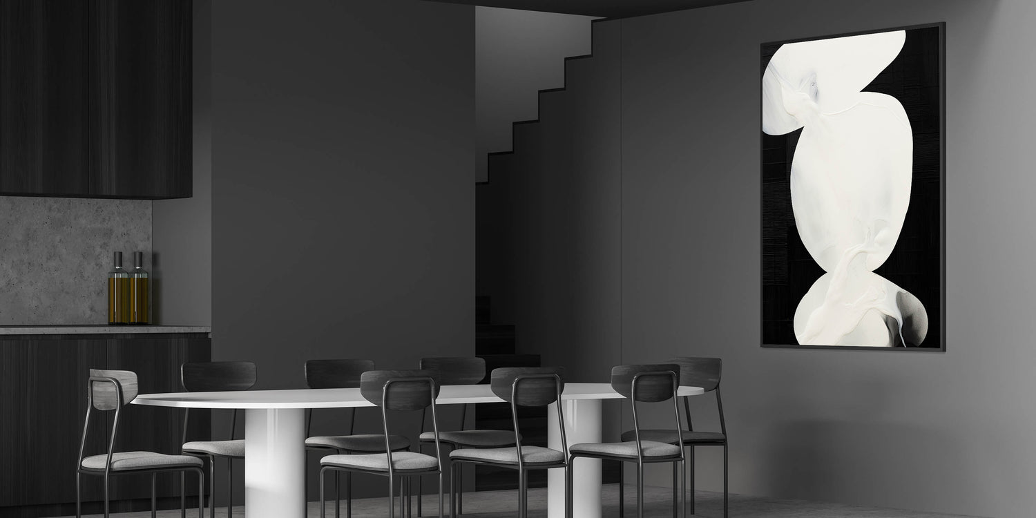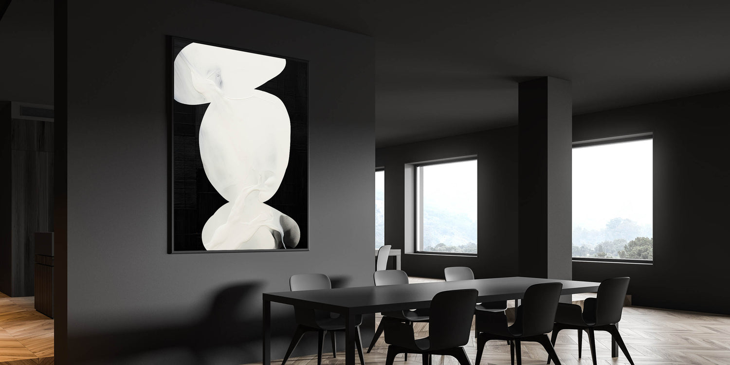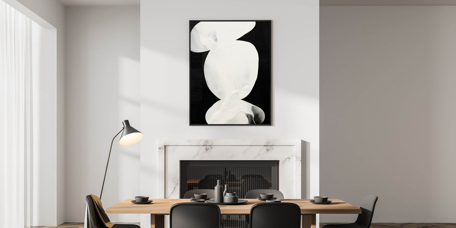 Create a modern and sophisticated dining space with this contemporary dining art piece, featuring an abstract black and white composition with fluid, organic shapes. The striking contrast of dark and light tones adds an elegant, high-end aesthetic to any dining area.