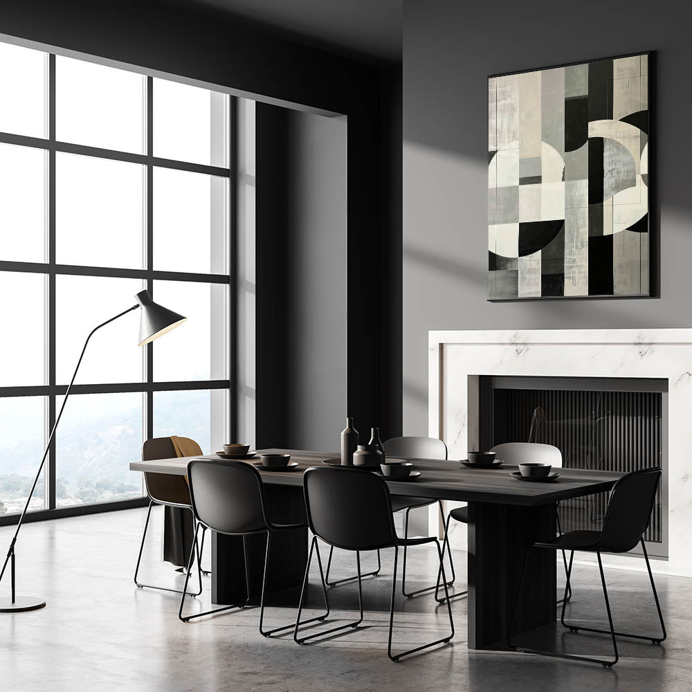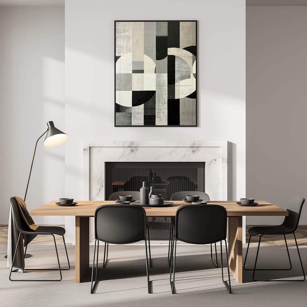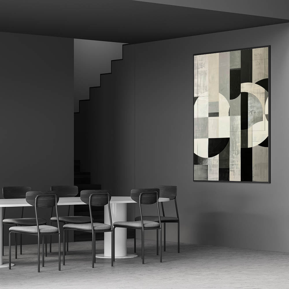 Upgrade your dining space with this contemporary dining art piece, featuring a monochrome geometric design in black, white, and gray. The sleek, layered composition adds depth and modern elegance, making it an ideal framed dining room print for sophisticated interiors. Whether your décor is modern, industrial, or minimalist, this canvas art for dining areas complements a variety of styles.