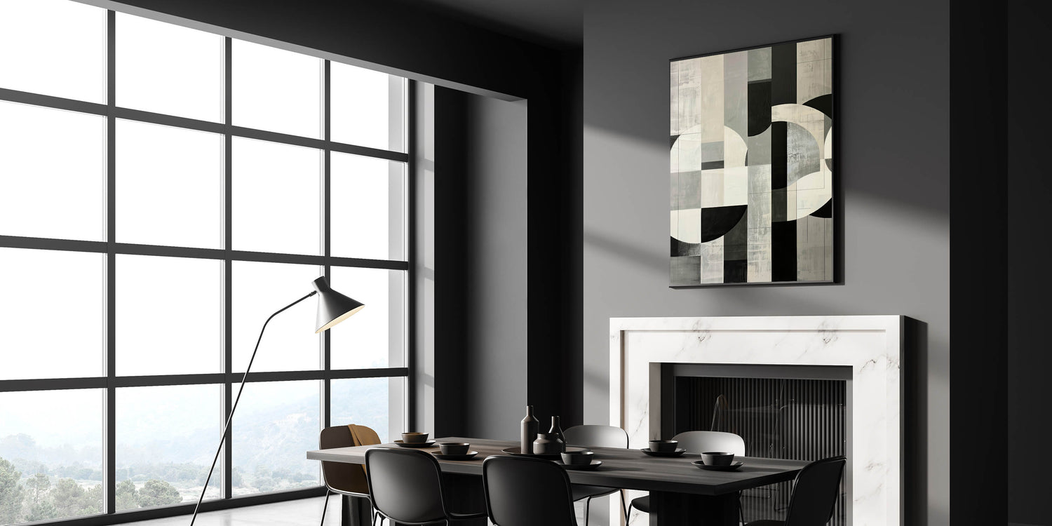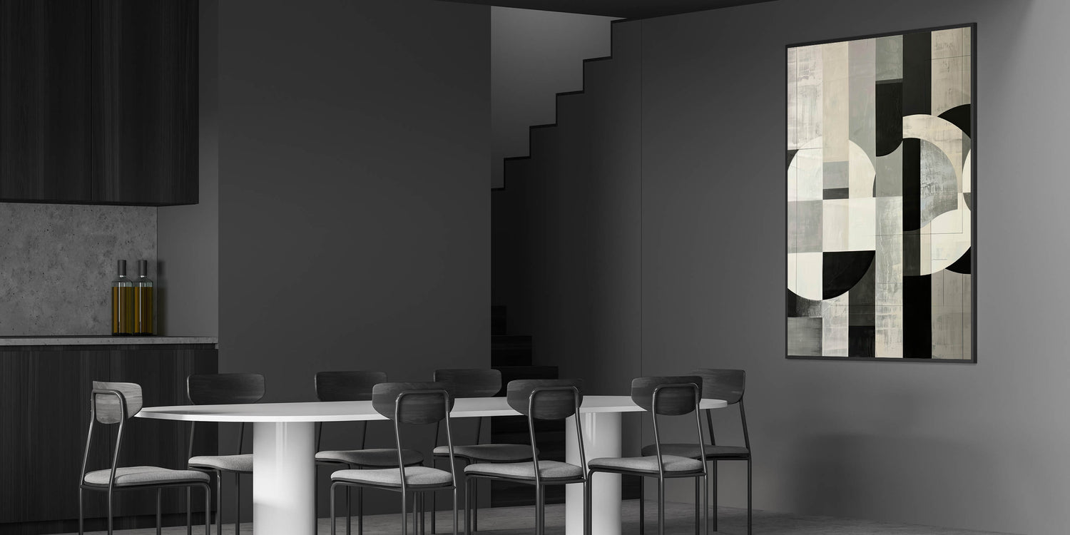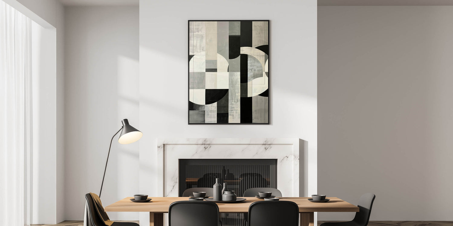 Upgrade your dining space with this contemporary dining art piece, featuring a monochrome geometric design in black, white, and gray. The sleek, layered composition adds depth and modern elegance, making it an ideal framed dining room print for sophisticated interiors. Whether your décor is modern, industrial, or minimalist, this canvas art for dining areas complements a variety of styles.