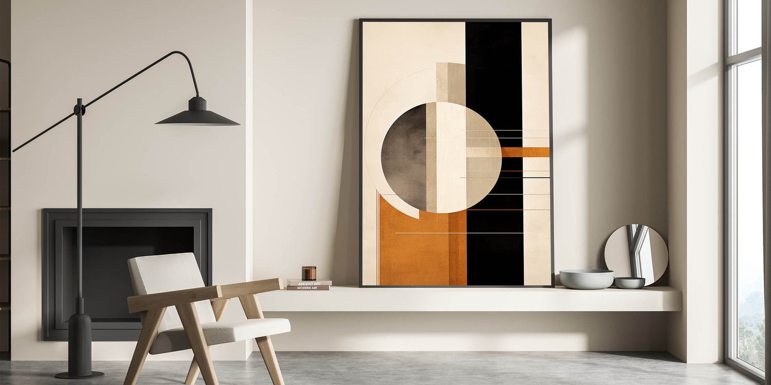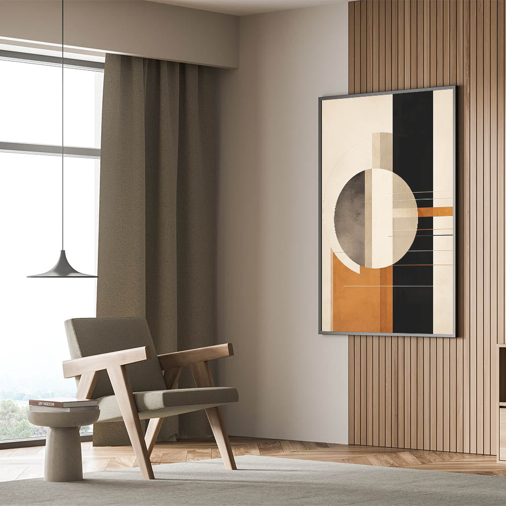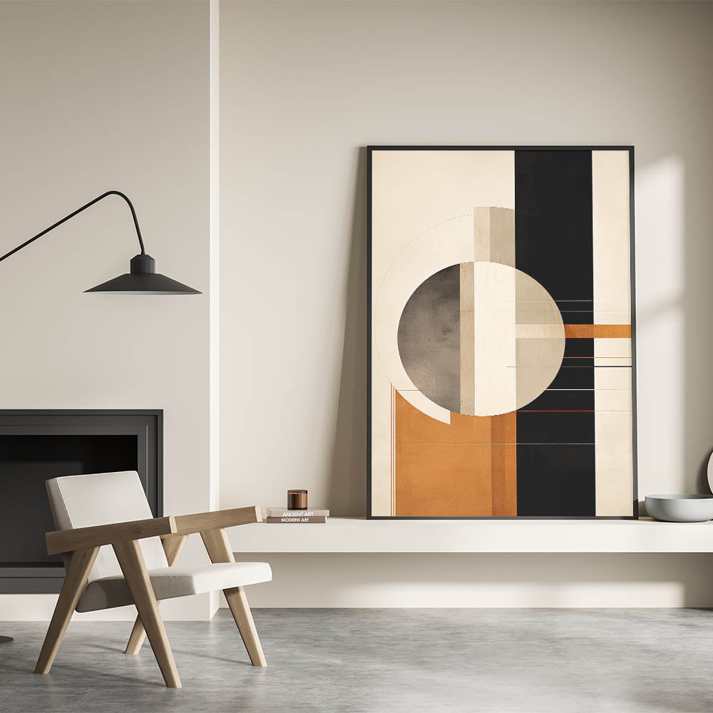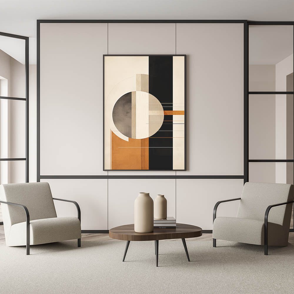 Make a bold statement with this high-quality geometric minimalist abstract wall art, designed for interiors that embrace structure and sophistication. With intersecting lines, layered shapes, and a neutral palette of black, beige, brown, and warm orange, this artwork brings balance and modern elegance to any space.