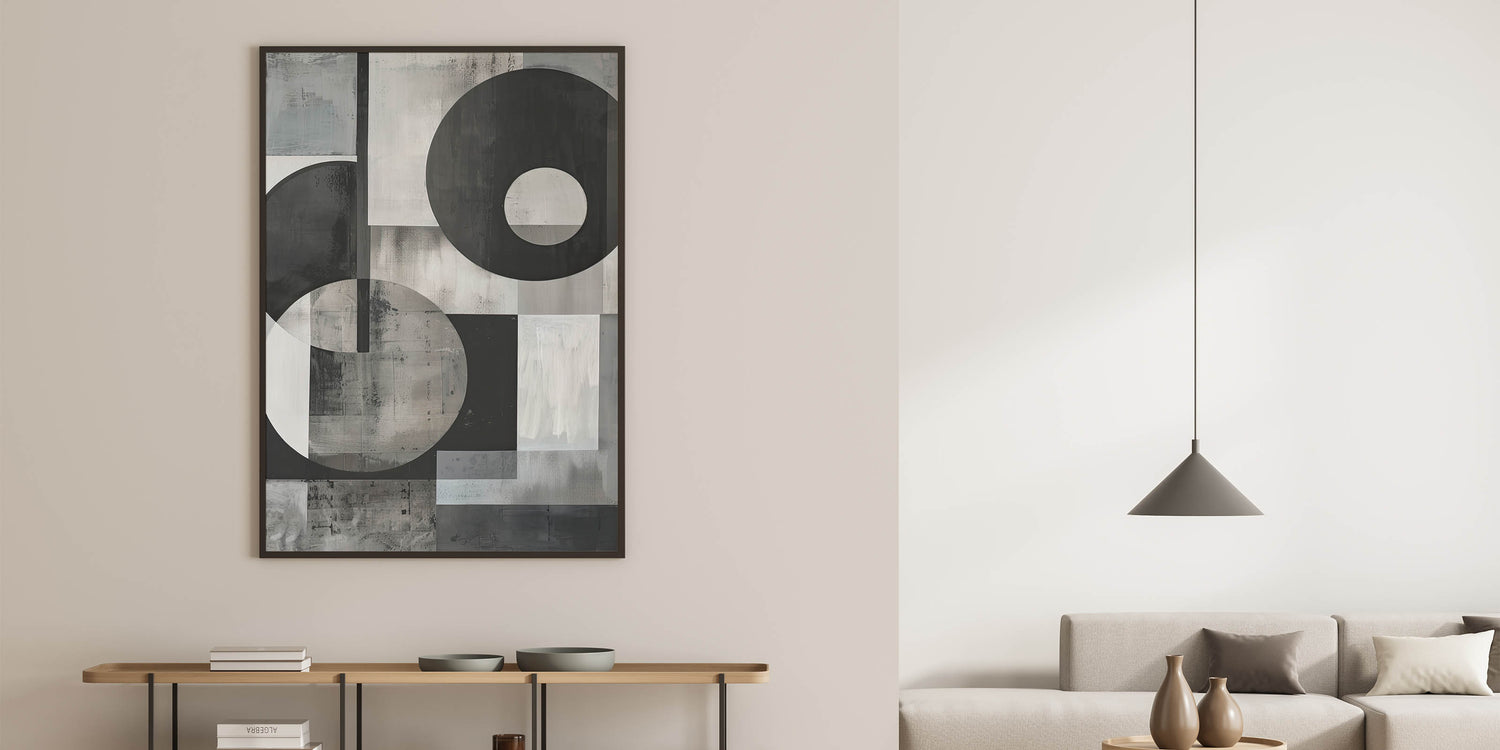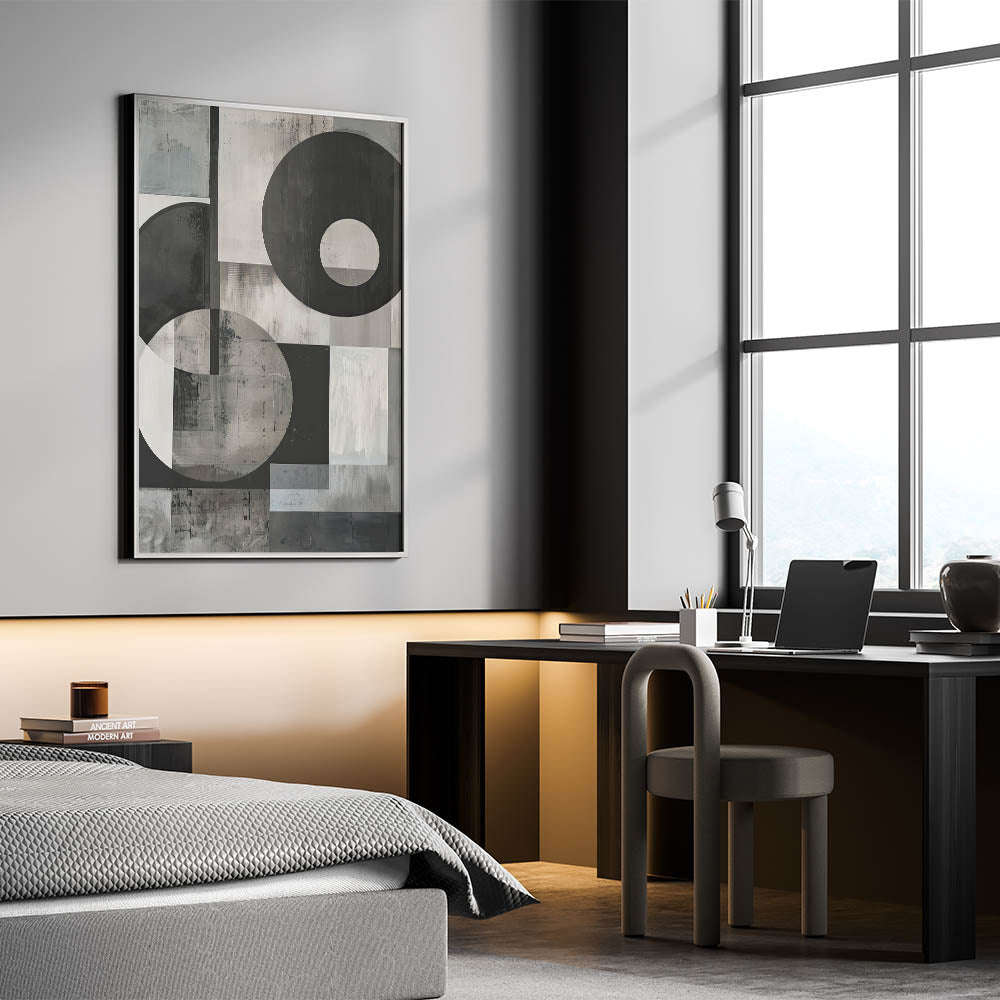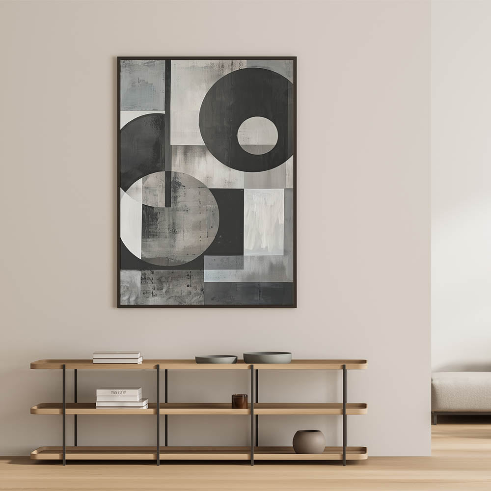 Enhance your interior with this striking geometric minimalist abstract wall art, featuring a bold arrangement of black, white, and gray tones. With overlapping circles and rectangles, this piece showcases a powerful balance of structure, texture, and visual depth. Its modern layout and monochromatic palette make it a versatile choice for both residential and professional spaces.