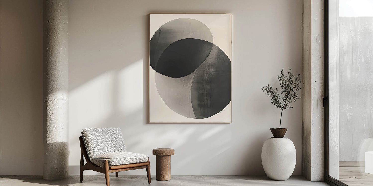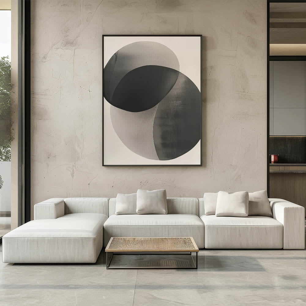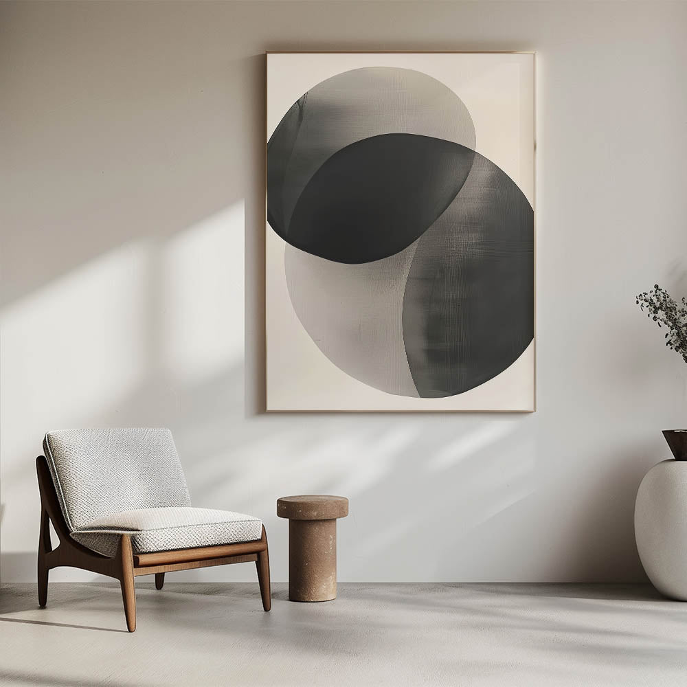 Introduce quiet sophistication with this high-quality geometric minimalist abstract wall art, featuring two softly overlapping circular shapes in gradient tones of black and gray. The semi-transparent layering creates depth and harmony, making this piece an ideal addition to serene, modern interiors.