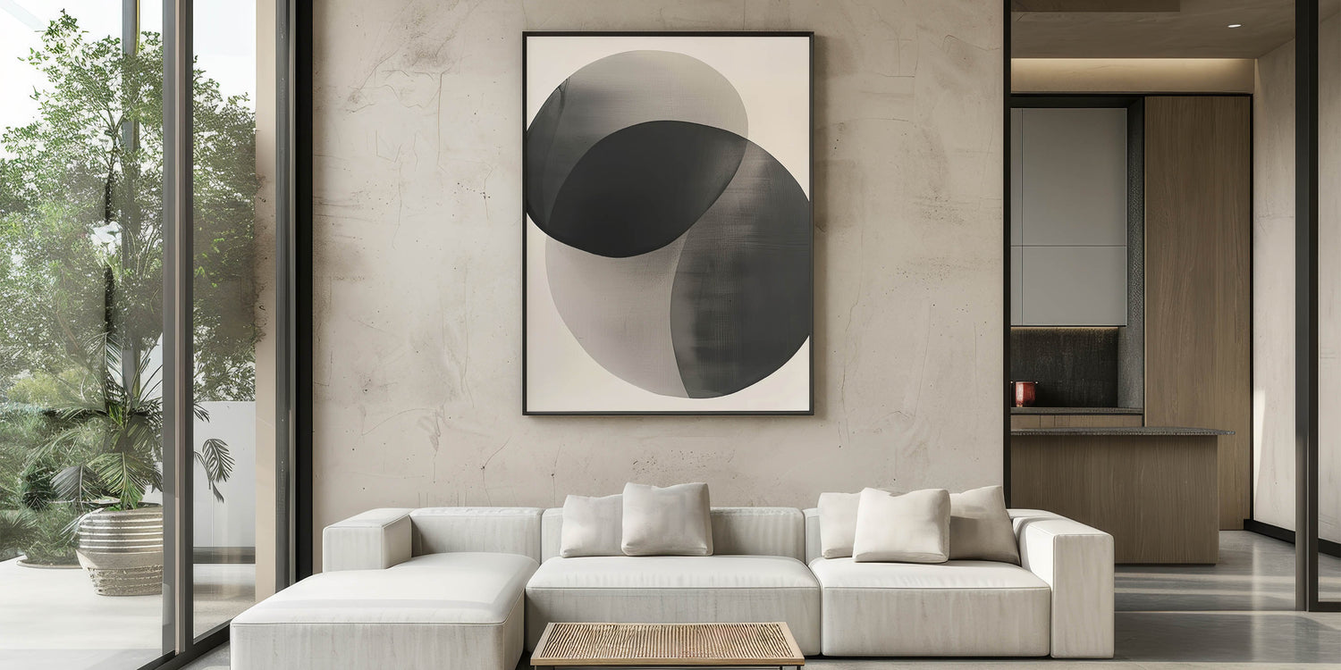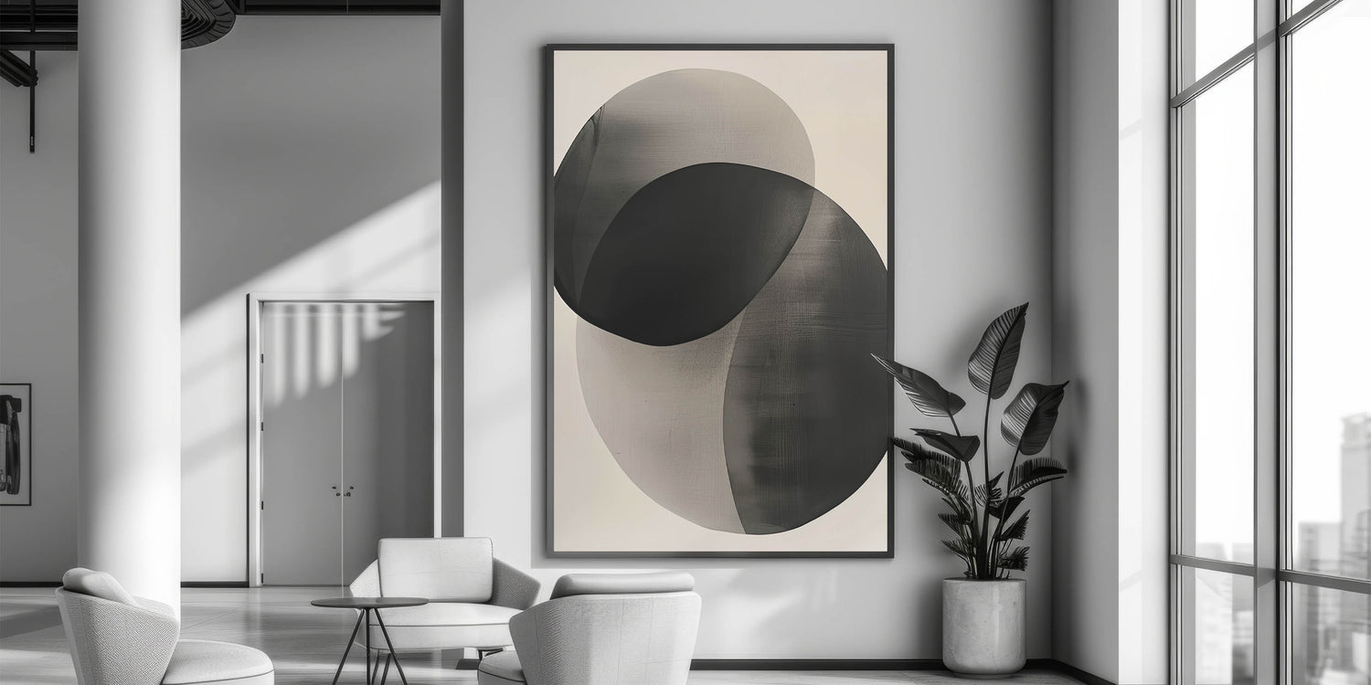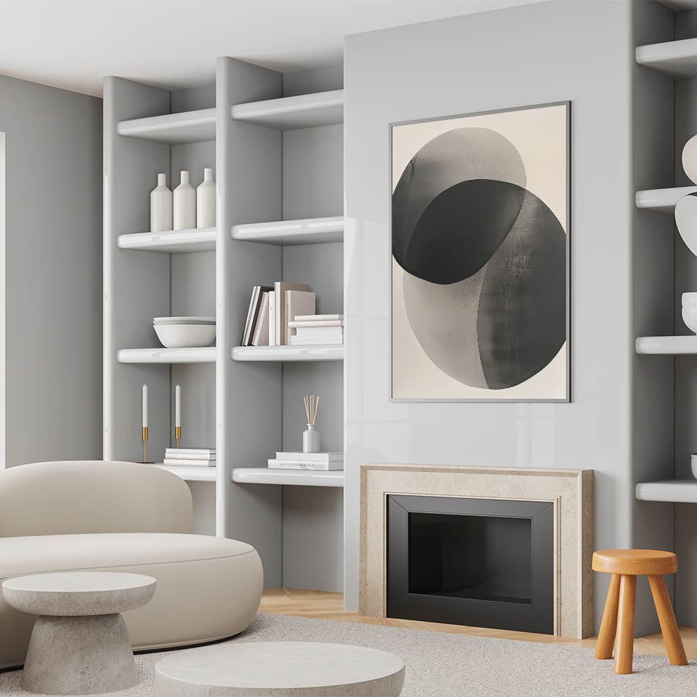 Introduce quiet sophistication with this high-quality geometric minimalist abstract wall art, featuring two softly overlapping circular shapes in gradient tones of black and gray. The semi-transparent layering creates depth and harmony, making this piece an ideal addition to serene, modern interiors.