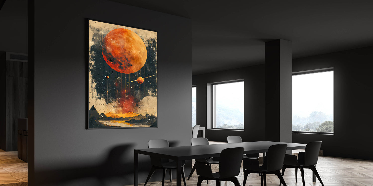 Create a sophisticated and otherworldly ambiance with this elegant dining room wall art. Ideal for contemporary interiors, it enhances your dining room wall decor with a touch of cosmic grandeur.