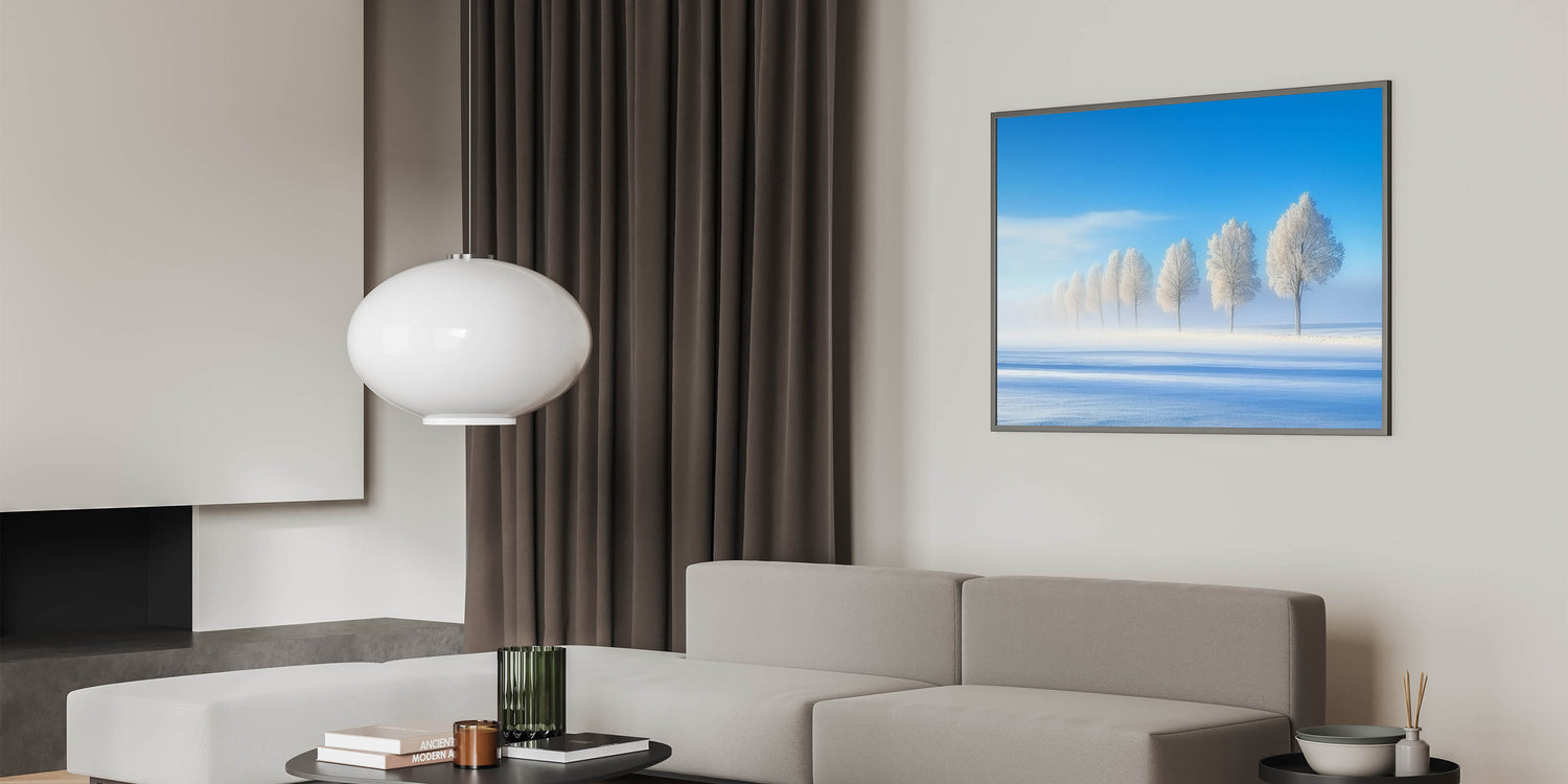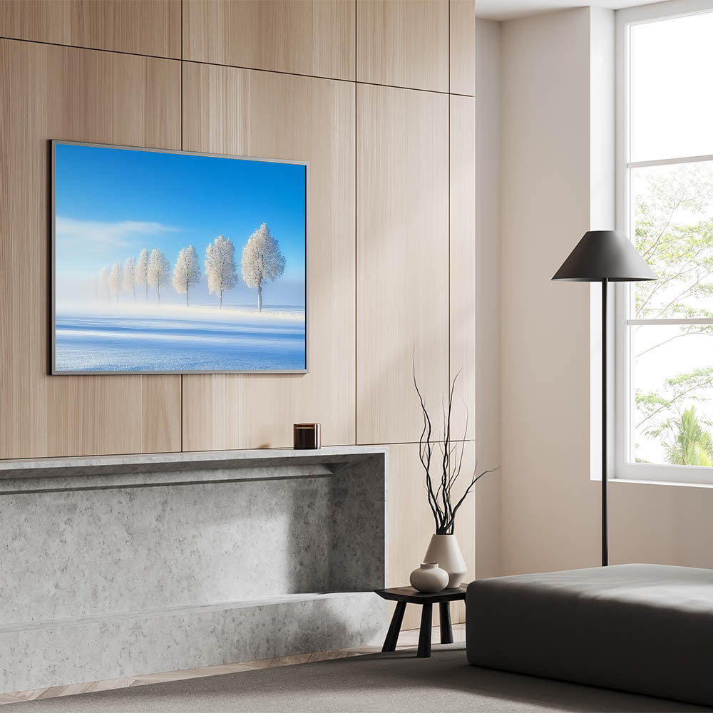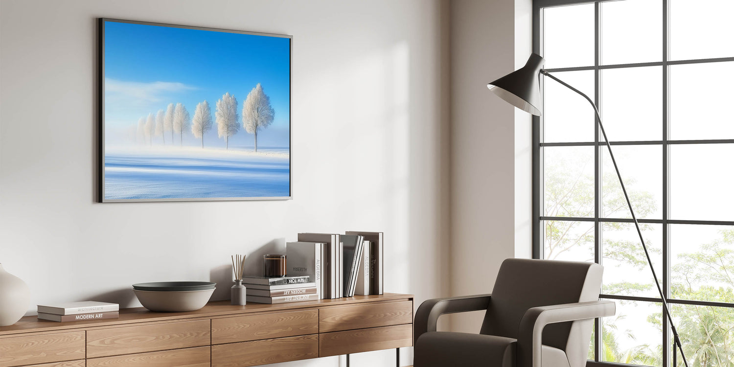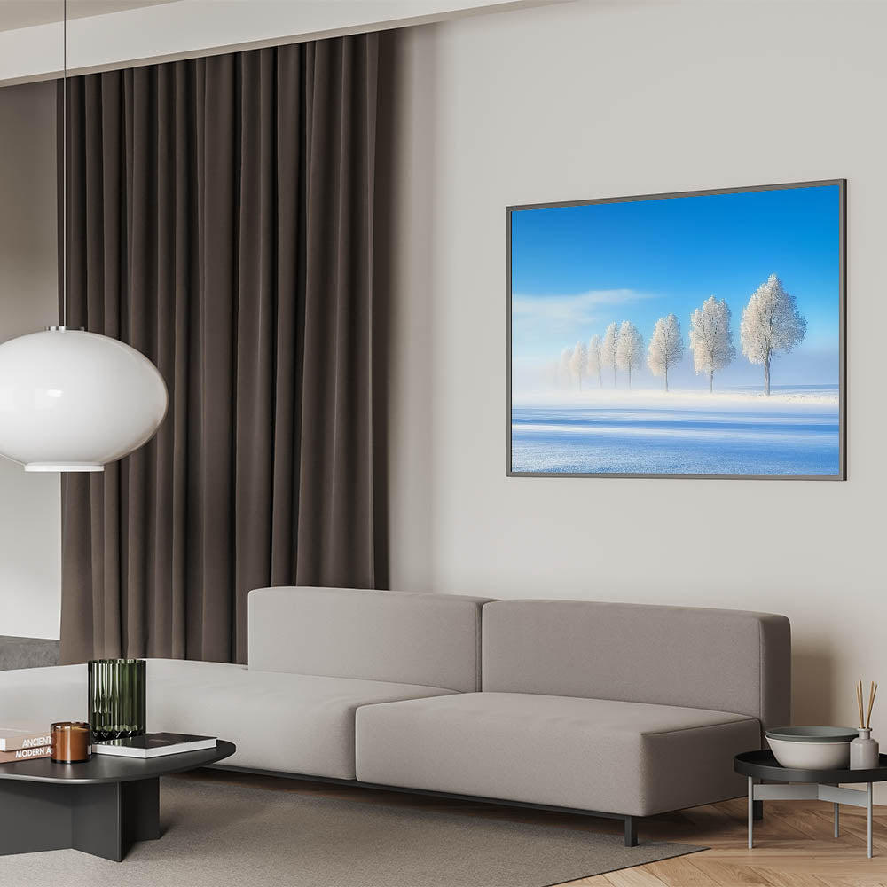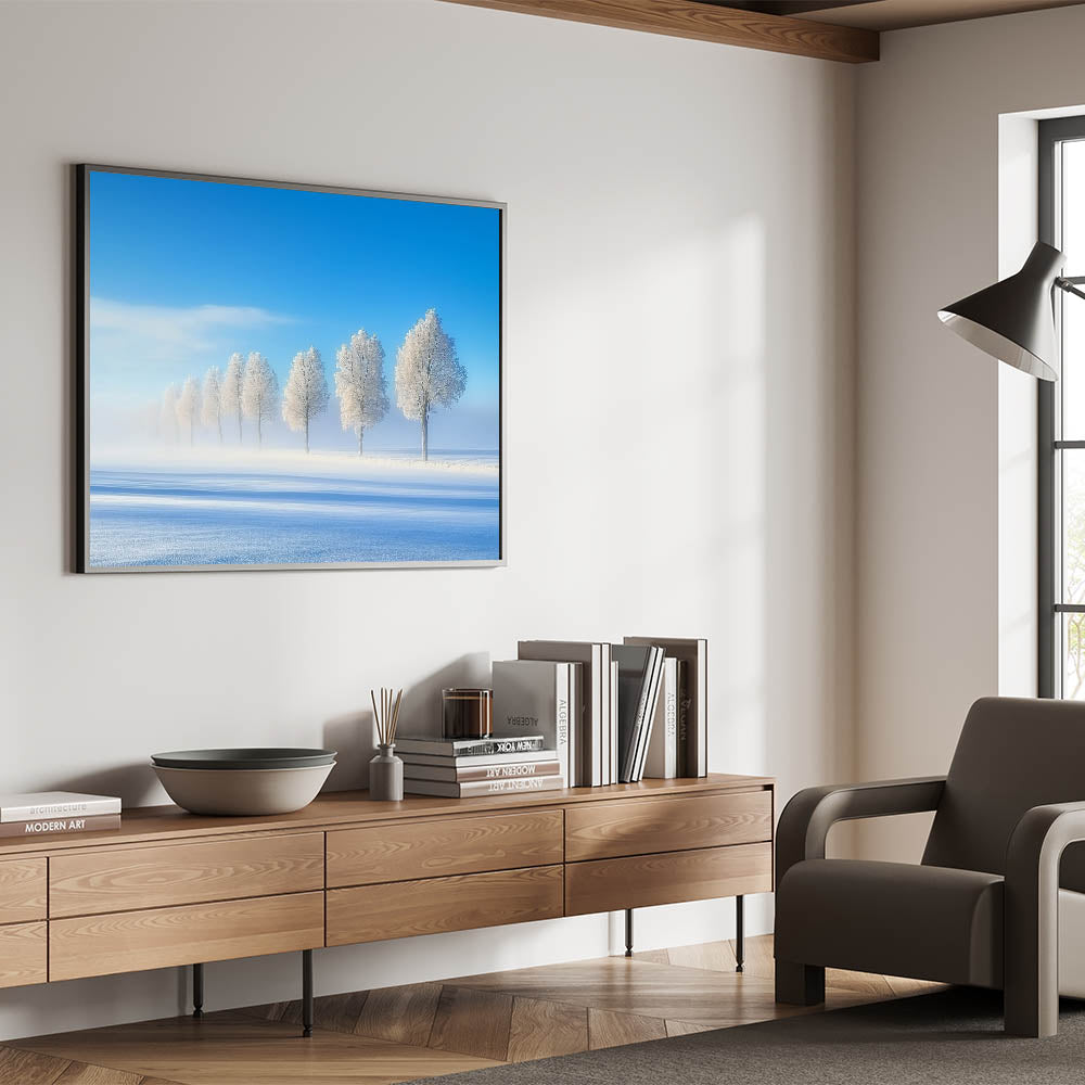 Celebrate the crisp beauty of winter with this Countryside Framed Art featuring a row of frosty white trees standing tall under a bright blue sky. The serene, snow-covered landscape and the soft play of light create a tranquil and refreshing scene that brings a touch of seasonal charm to your home. This artwork perfectly captures the elegance and purity of rural winters, making it an ideal choice for any decor style.