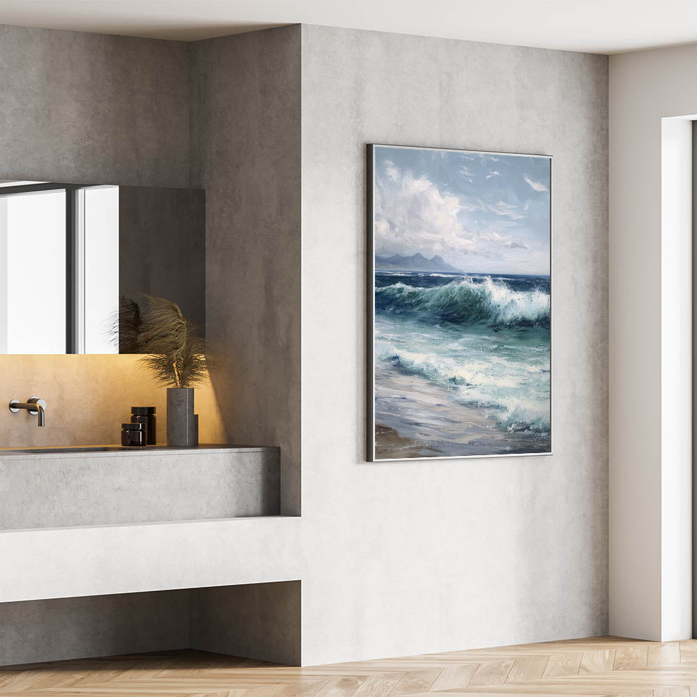 Immerse yourself in the untamed beauty of the ocean with this striking ocean wave landscape canvas print. Featuring dynamic waves crashing along the shore with a backdrop of majestic mountains and a serene blue sky, this artwork captures the raw power and tranquility of nature. Its rich blue and teal hues bring a refreshing coastal vibe to any room, perfect for modern, nautical, or beach-inspired interiors.