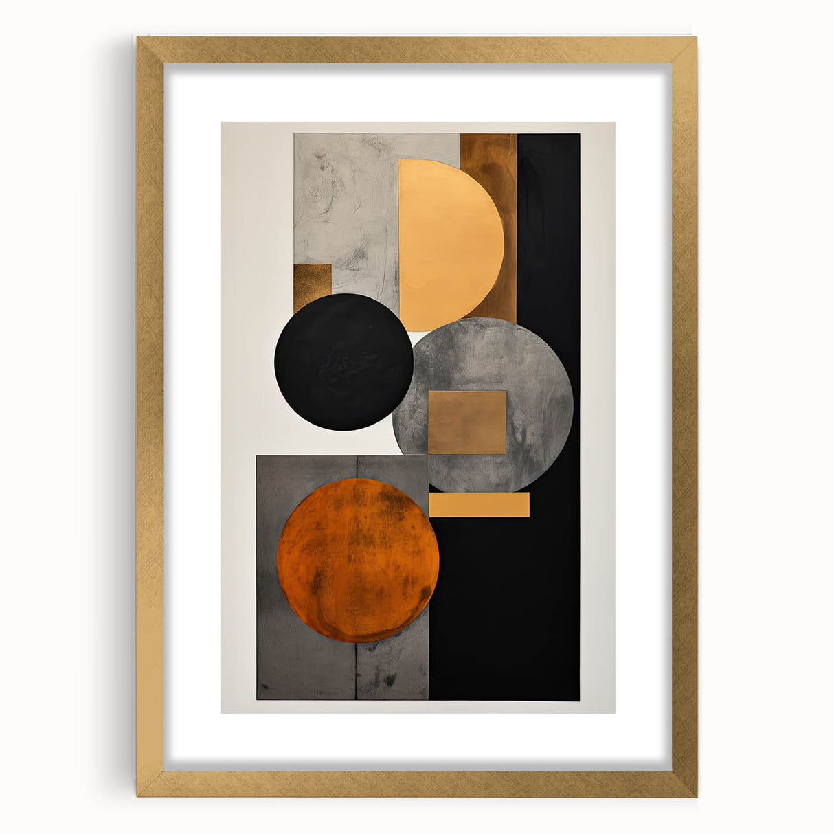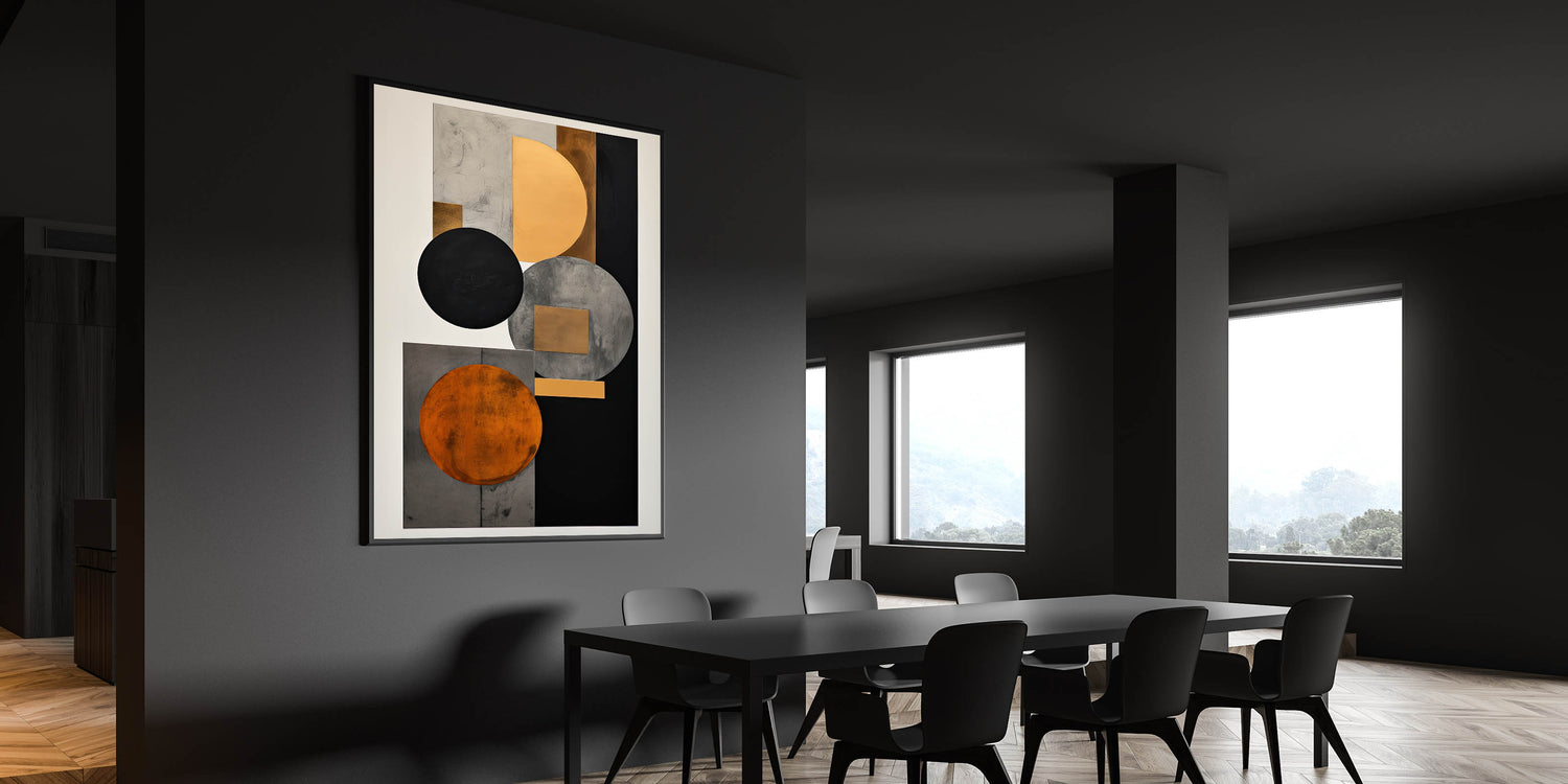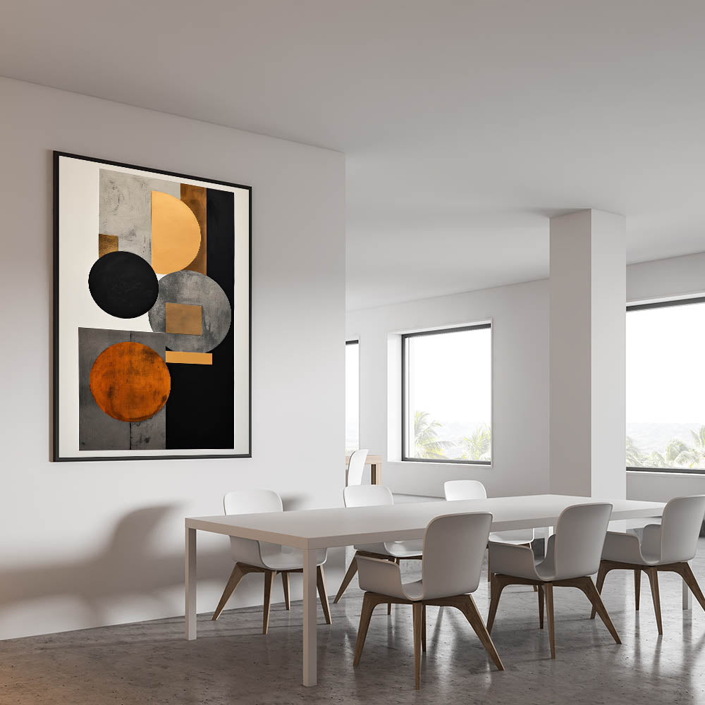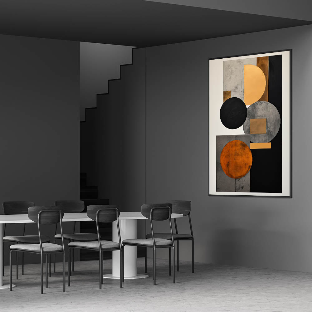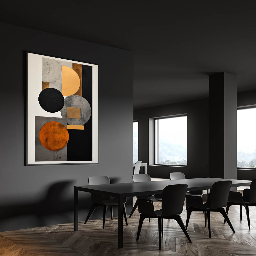 Enhance your dining space with this customizable dining area print, featuring a stunning black, gold, and gray geometric design. The combination of bold circles, sharp angles, and metallic tones creates a sophisticated visual impact, making this piece ideal for modern and luxury dining interiors. Its sleek contrast and structured layout add depth and elegance to your dining room wall décor.
