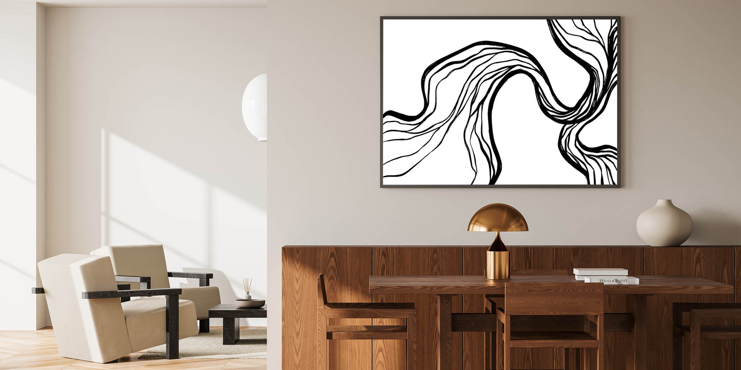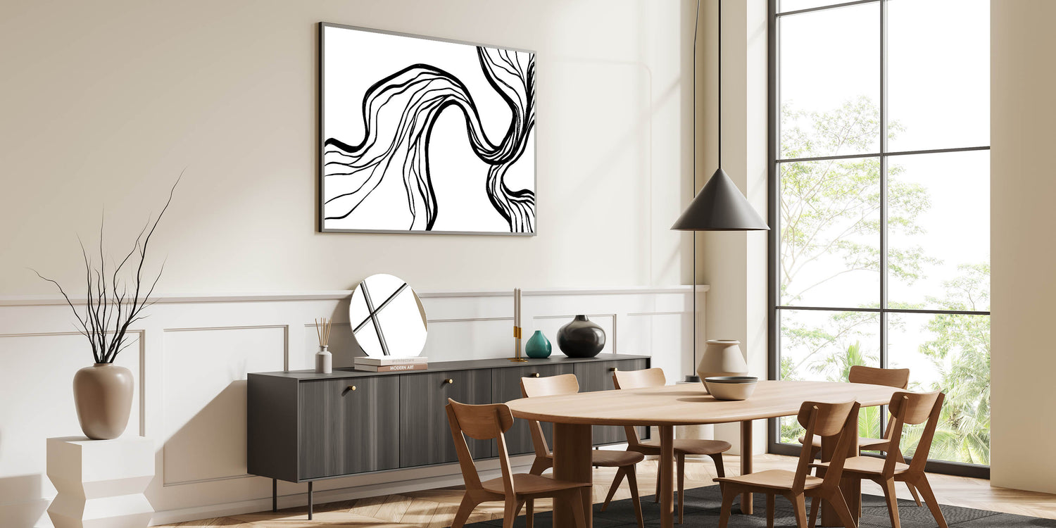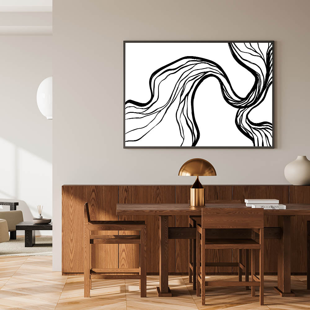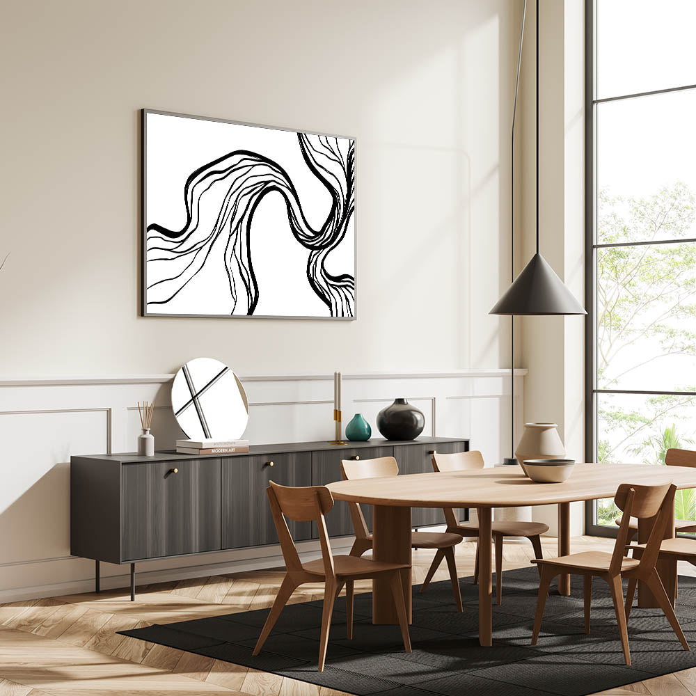 Enhance your dining space with this modern dining room art, featuring a dynamic black and white abstract flow design. The organic, free-flowing lines create a sense of movement, bringing a bold yet elegant touch to contemporary interiors. Whether used as a framed dining room print or a sleek canvas, this artwork complements modern, minimalist, and monochrome decor styles effortlessly.