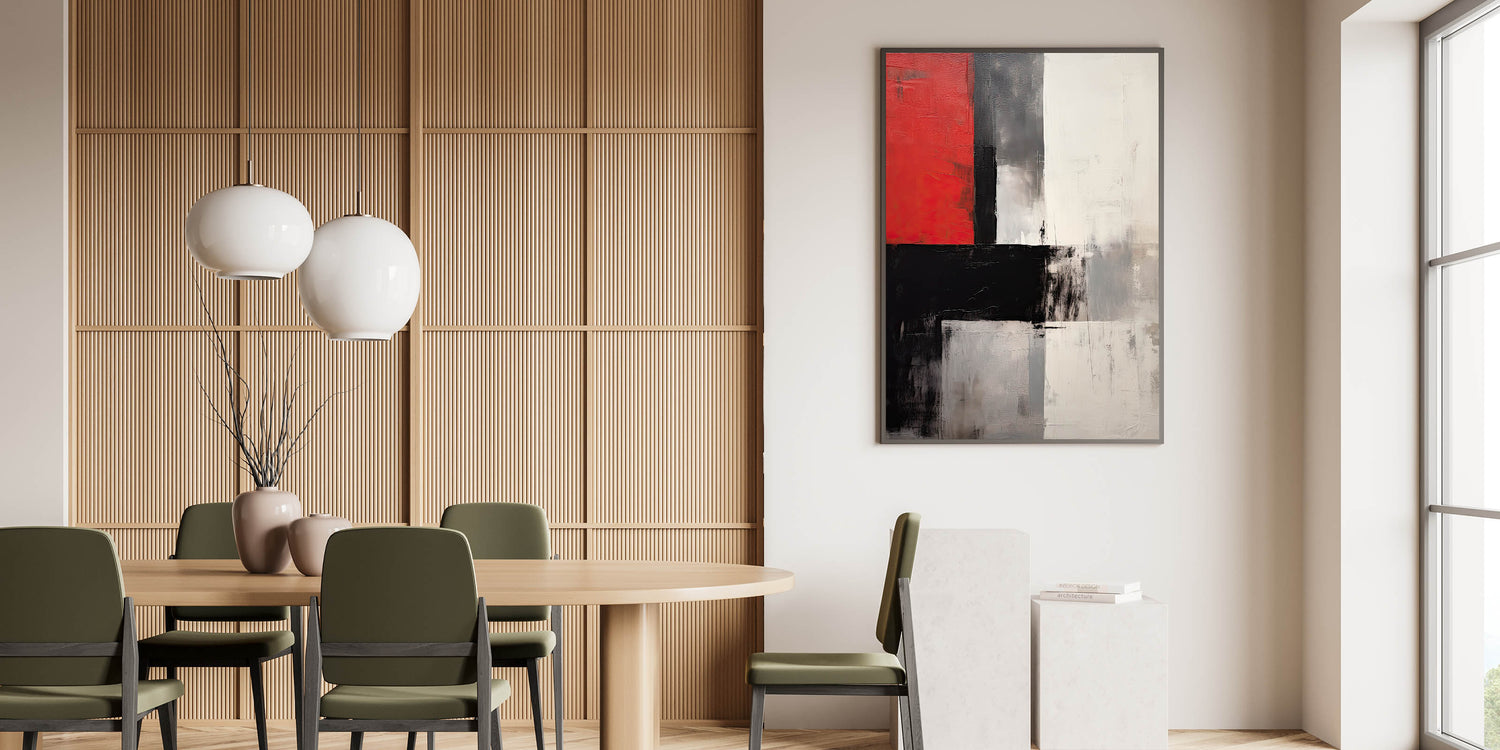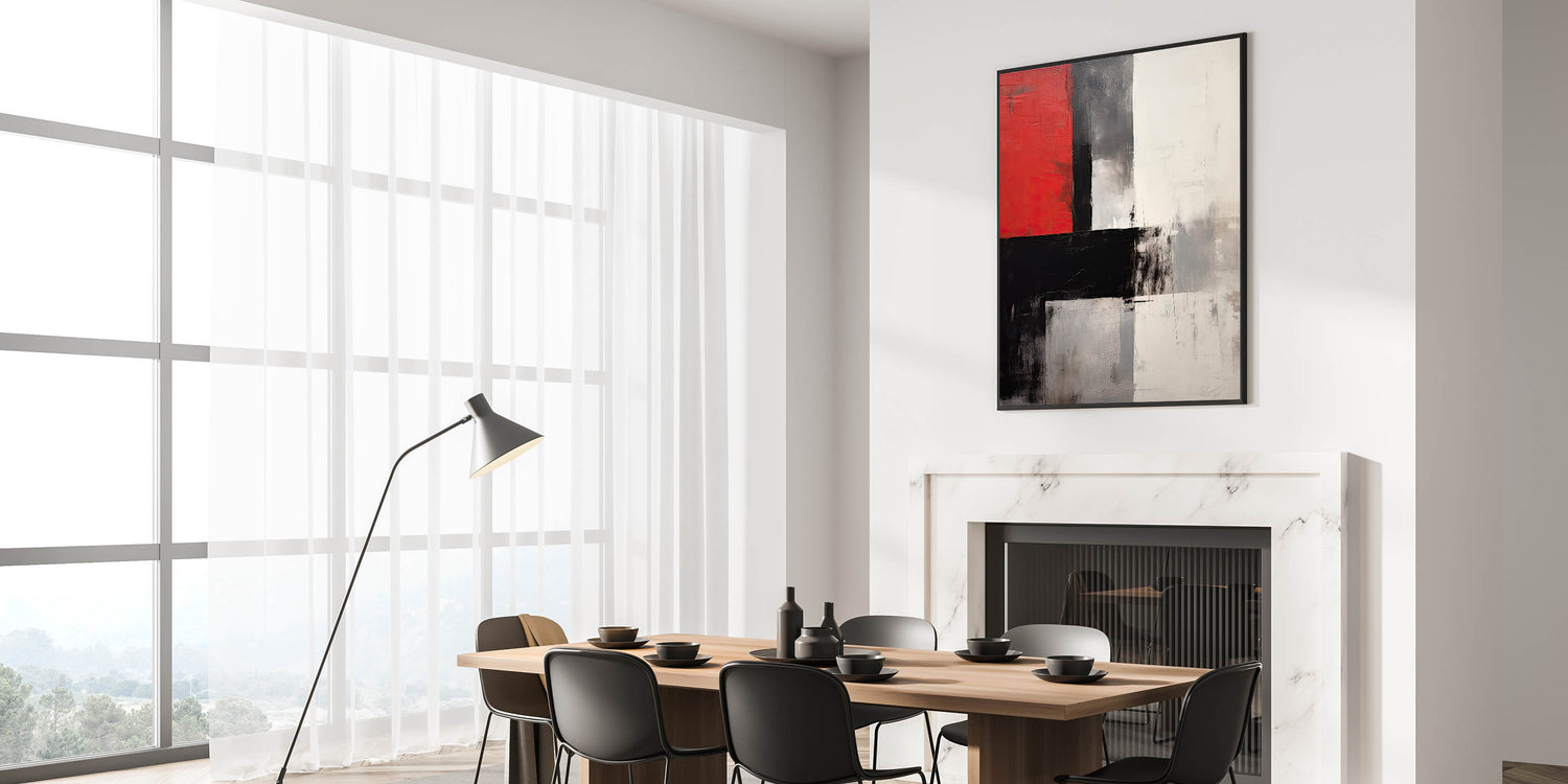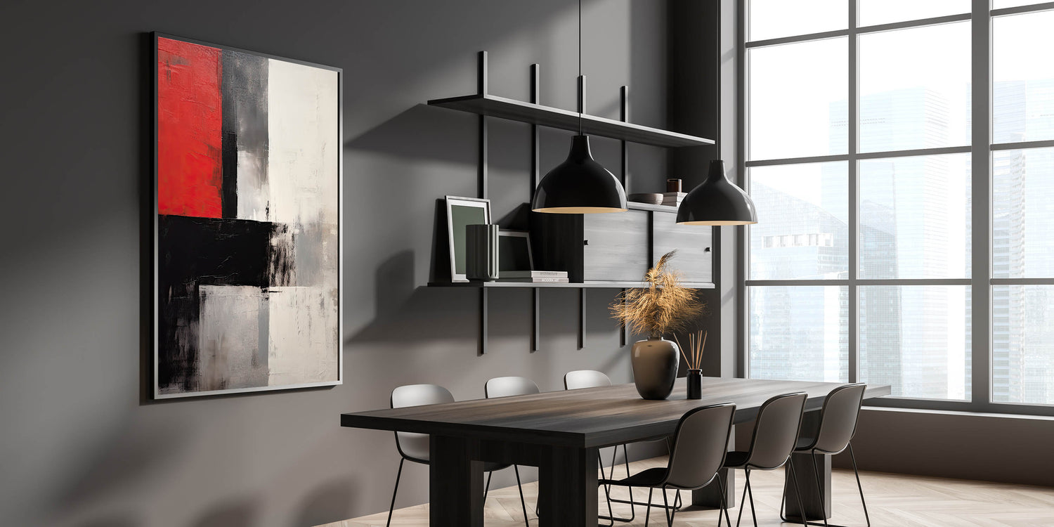 Make a statement in your space with this elegant dining room wall art, featuring a powerful mix of red, black, and white tones. This modern dining room art captivates with its bold abstract design, creating an eye-catching focal point for your dining area.