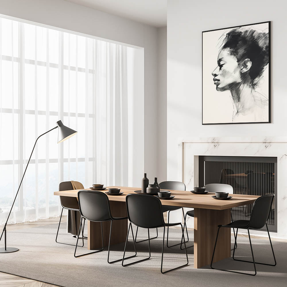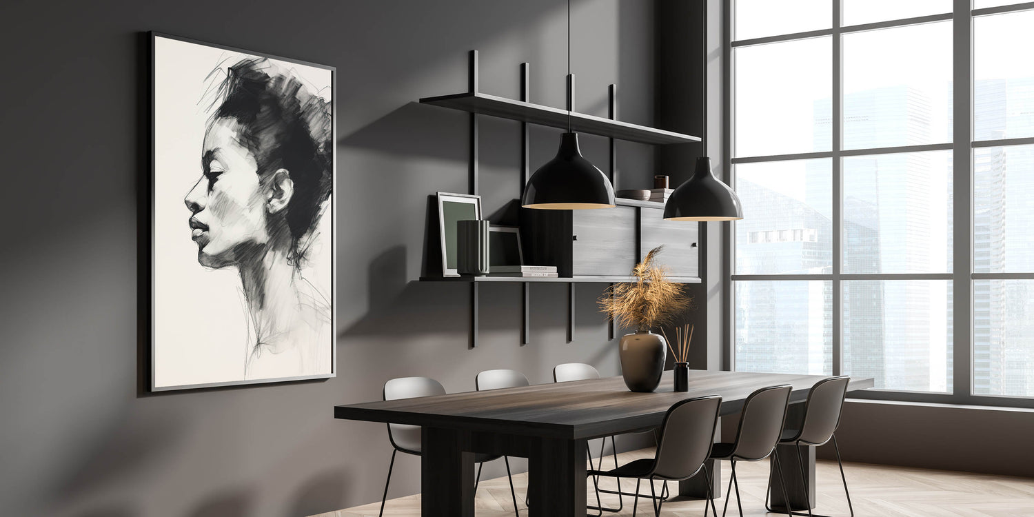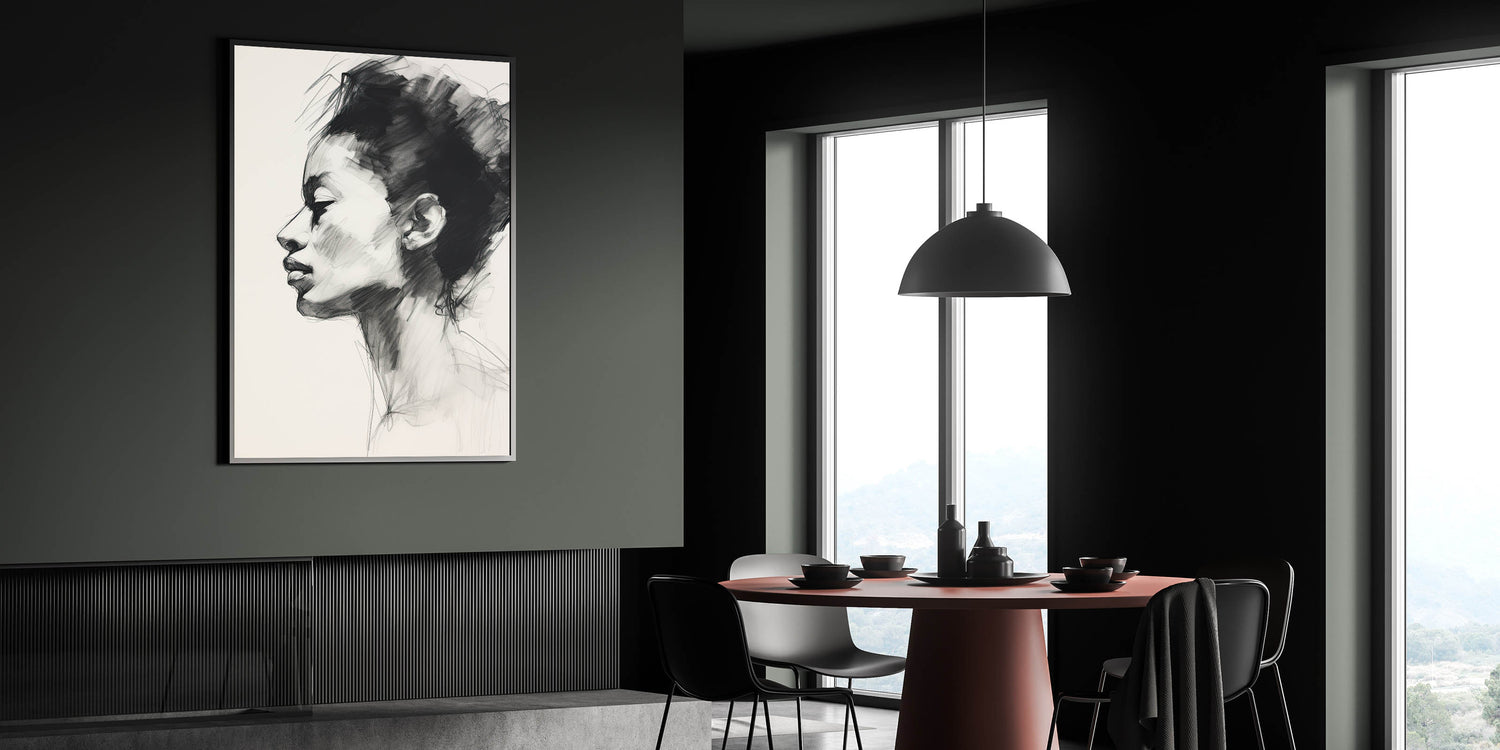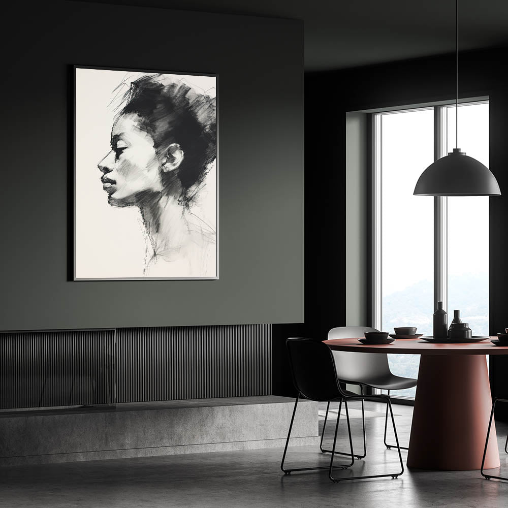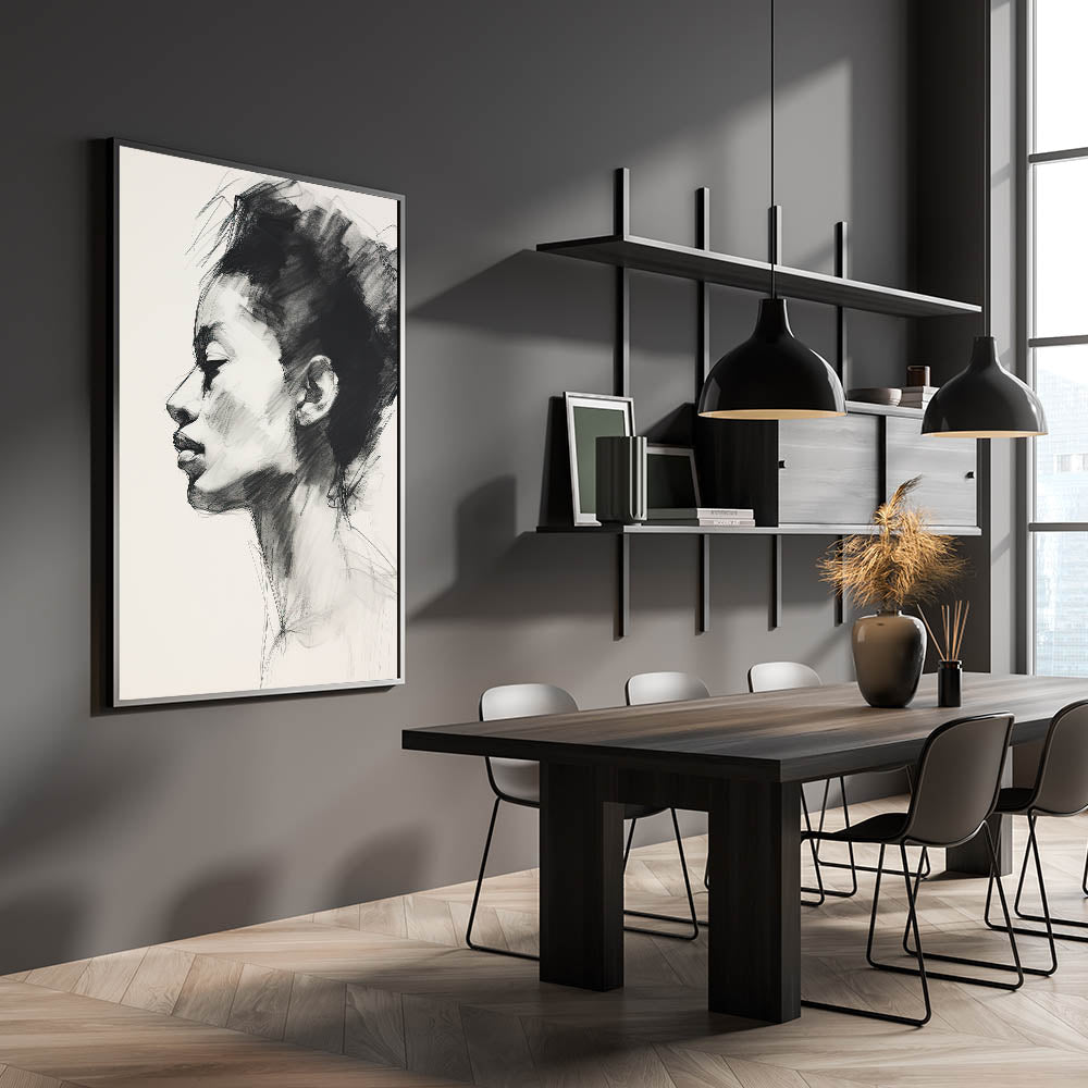 Enhance your dining space with this elegant dining room wall art, featuring a striking black and white portrait sketch. This expressive artwork captures a sense of movement and emotion with delicate shading and fine pencil strokes, making it a perfect statement piece for modern dining room décor. The monochrome aesthetic offers a timeless and sophisticated look, complementing contemporary, minimalist, and industrial interiors.