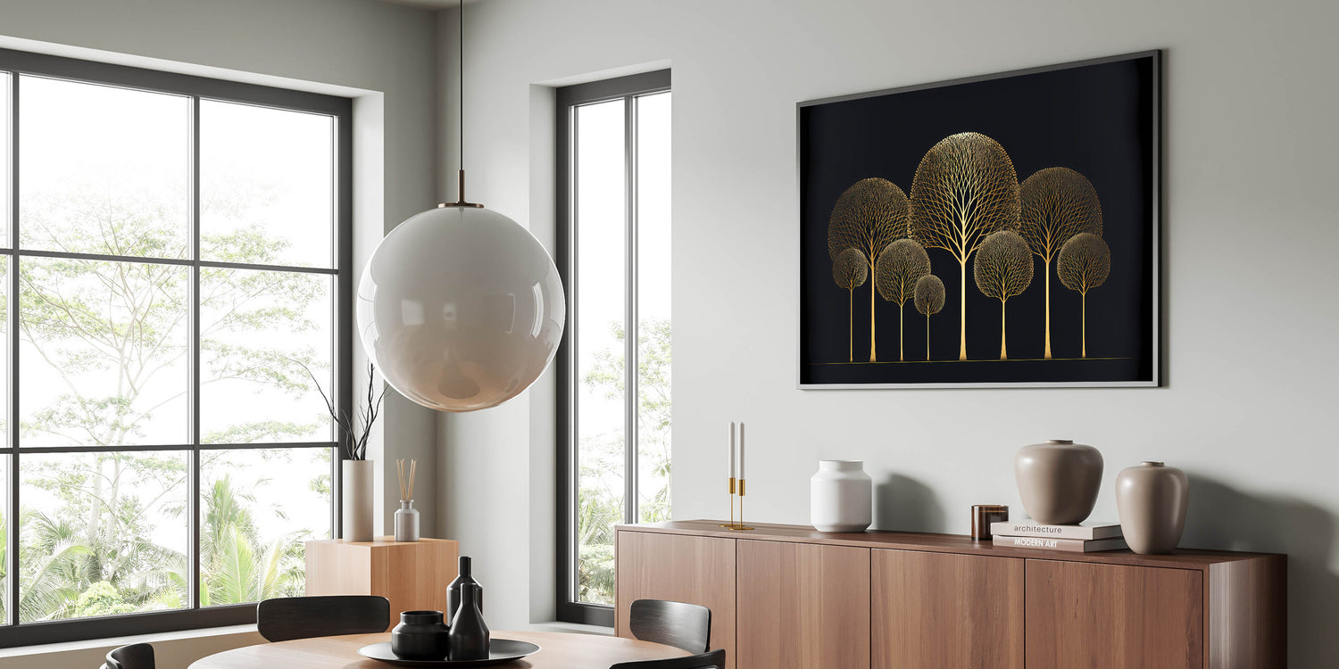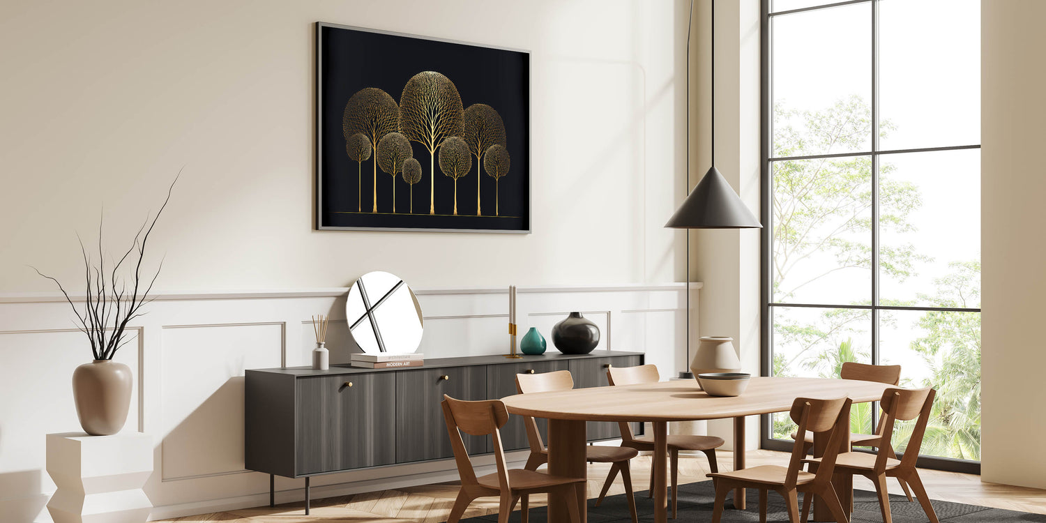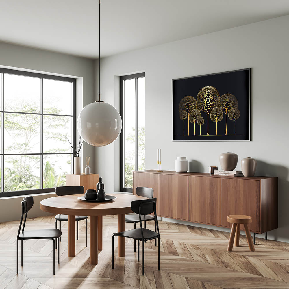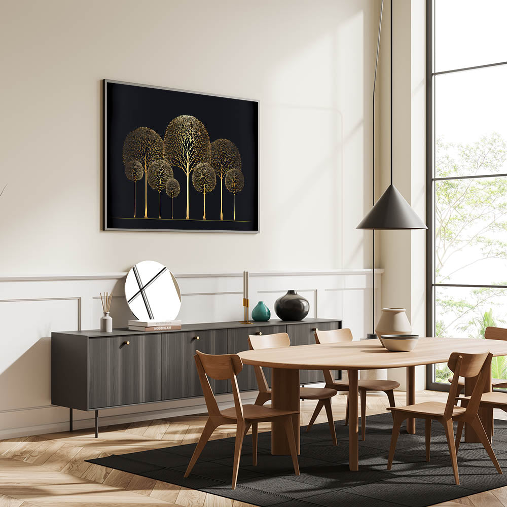 Enhance your dining space with this elegant dining room wall art, featuring a sophisticated golden tree design set against a deep black background. This contemporary piece exudes luxury and warmth, making it the perfect focal point for any modern dining area. The intricate detailing of the golden branches adds depth and elegance, creating a visually stunning composition.
