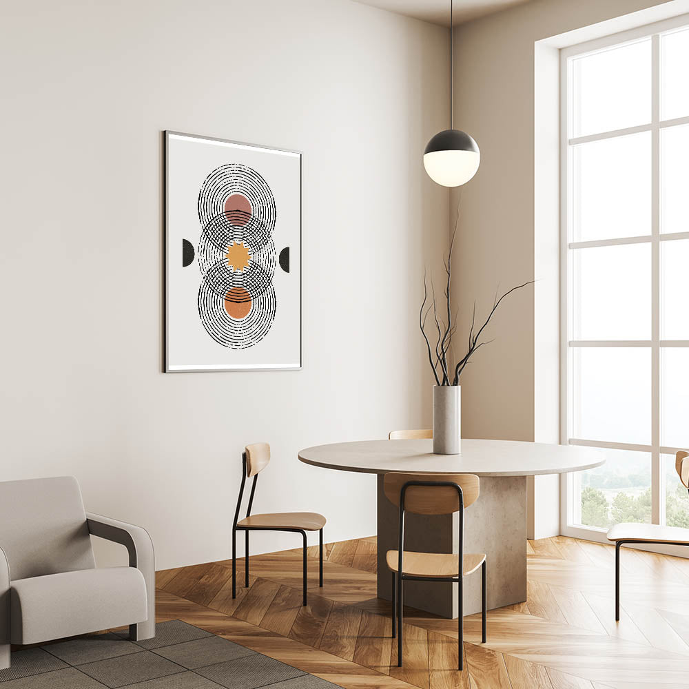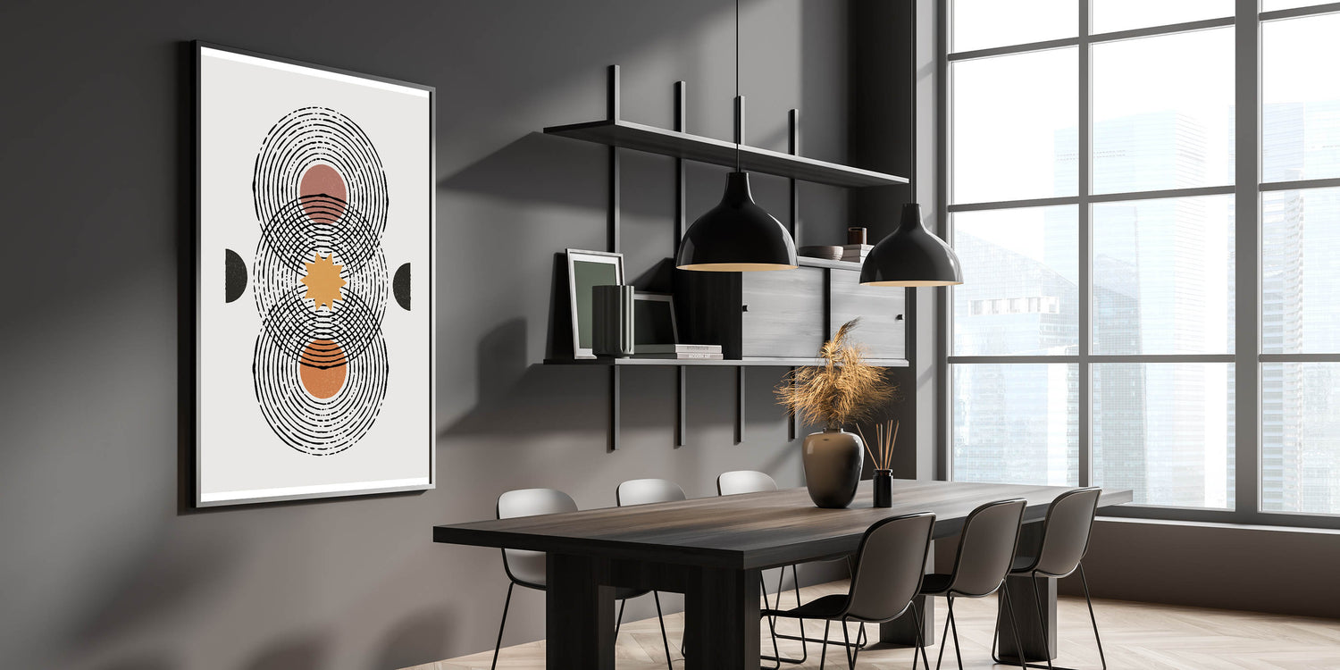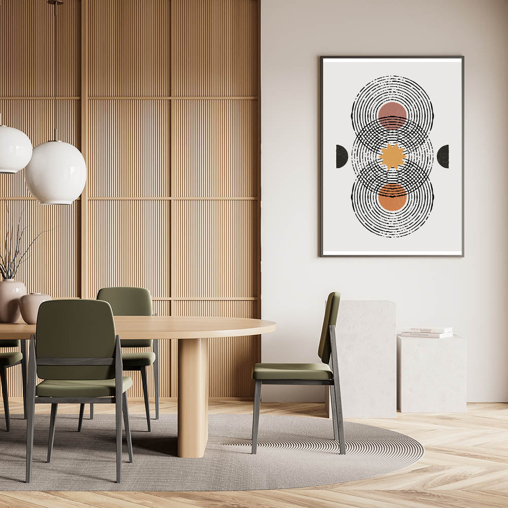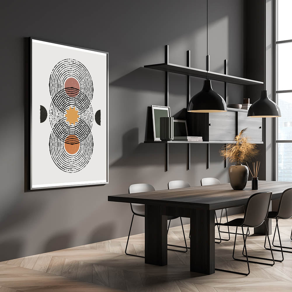 Enhance your dining space with this dining room wall decor, featuring a stunning abstract geometric composition. The intricate circular patterns, bold black elements, and warm earthy tones create a harmonious balance between structure and artistic expression. This minimalist yet eye-catching artwork is ideal for modern, bohemian, or contemporary dining interiors.