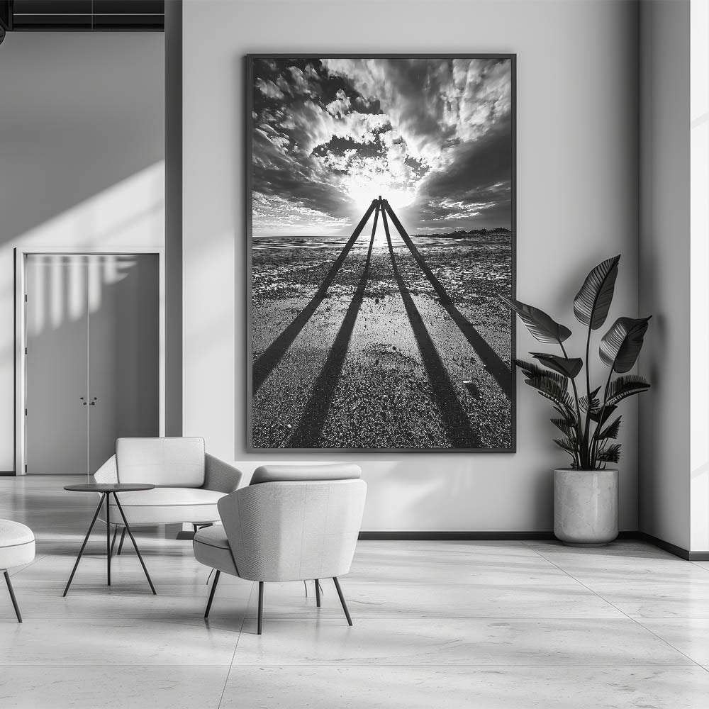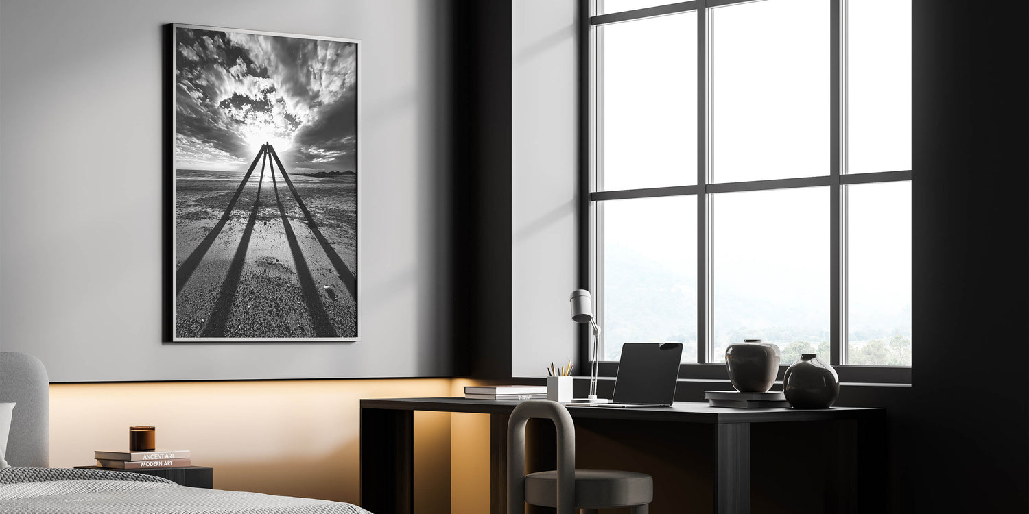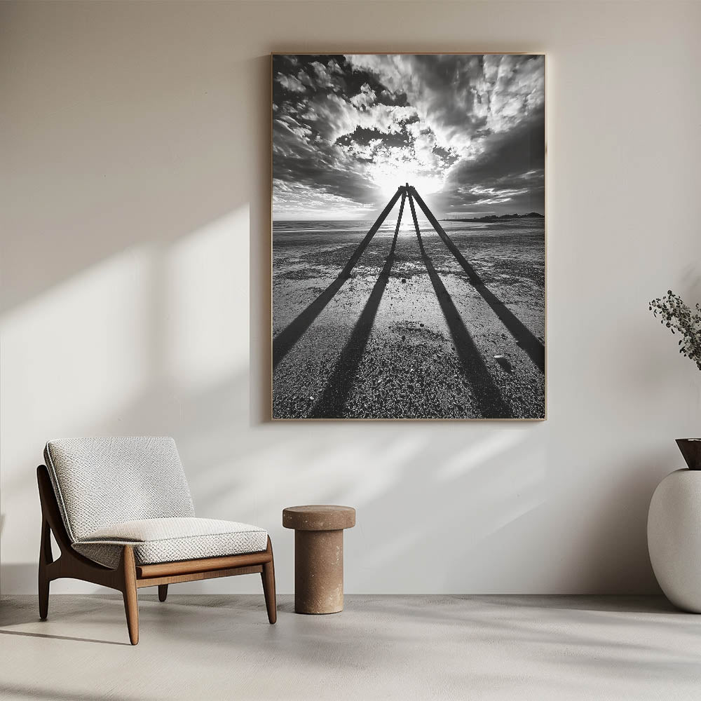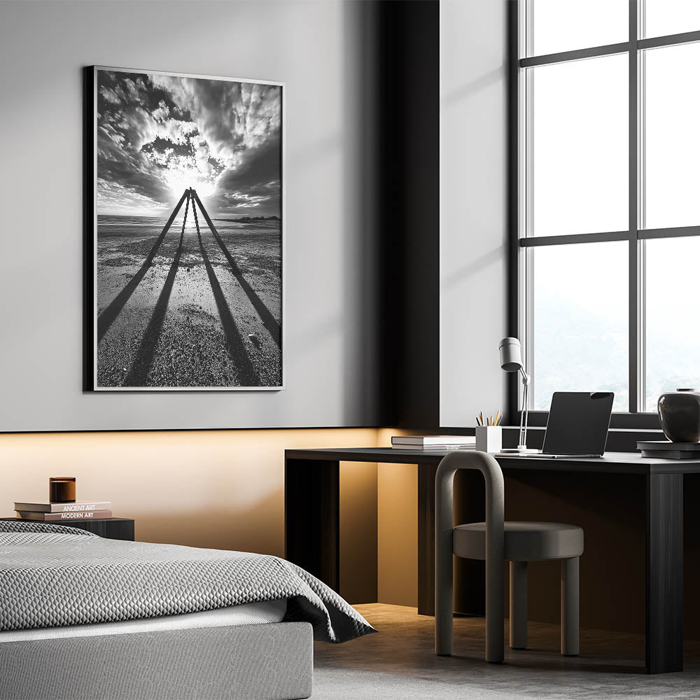 Bring bold sophistication to your space with this dramatic black-and-white abstract landscape. This striking artwork features a powerful composition of silhouetted geometric structures against a vivid backdrop of a cloudy sky and glowing sunlight. Capturing the essence of light, shadow, and contrast, this piece evokes a sense of mystery and timelessness. Its monochrome palette ensures versatility, making it an ideal fit for minimalist, industrial, or contemporary interiors.