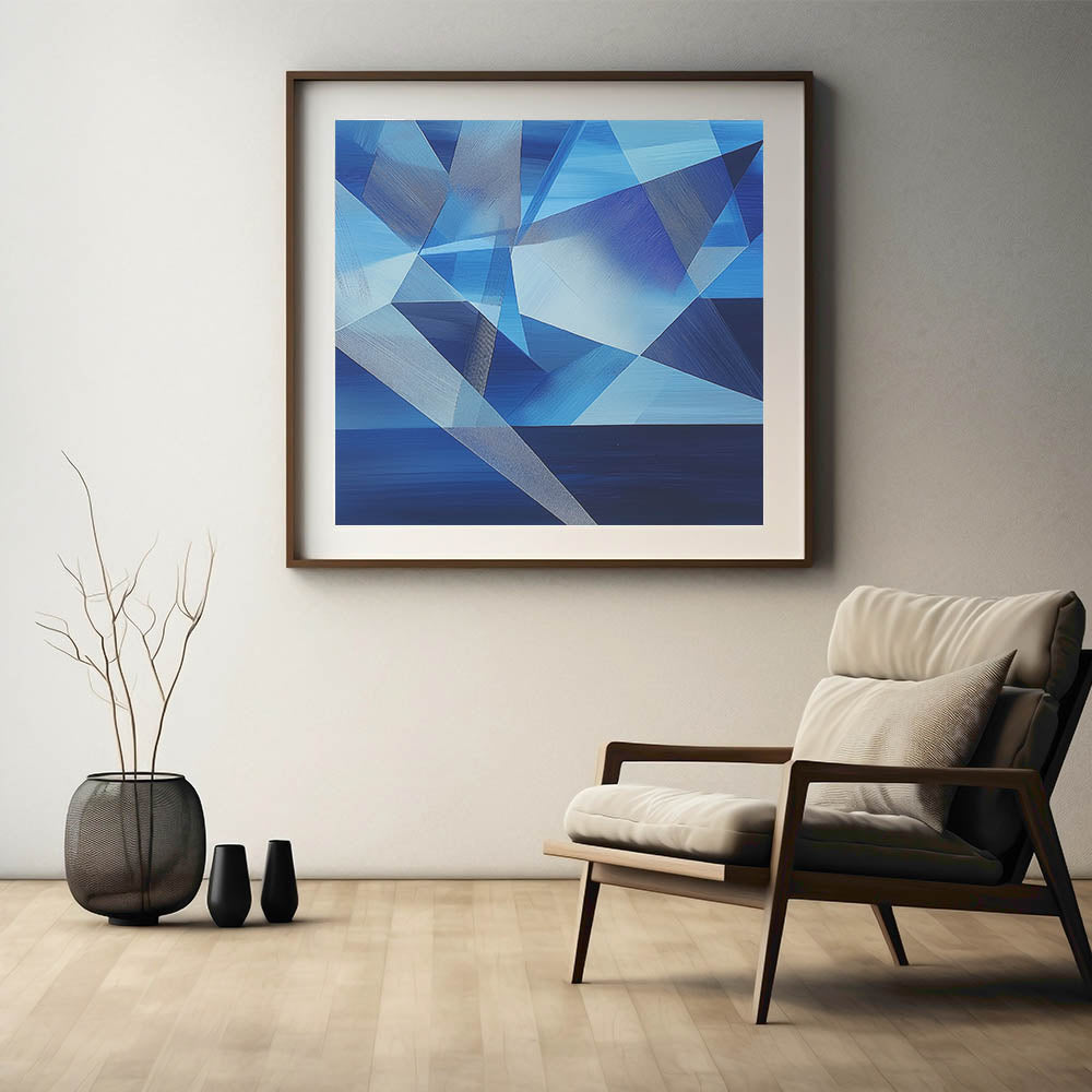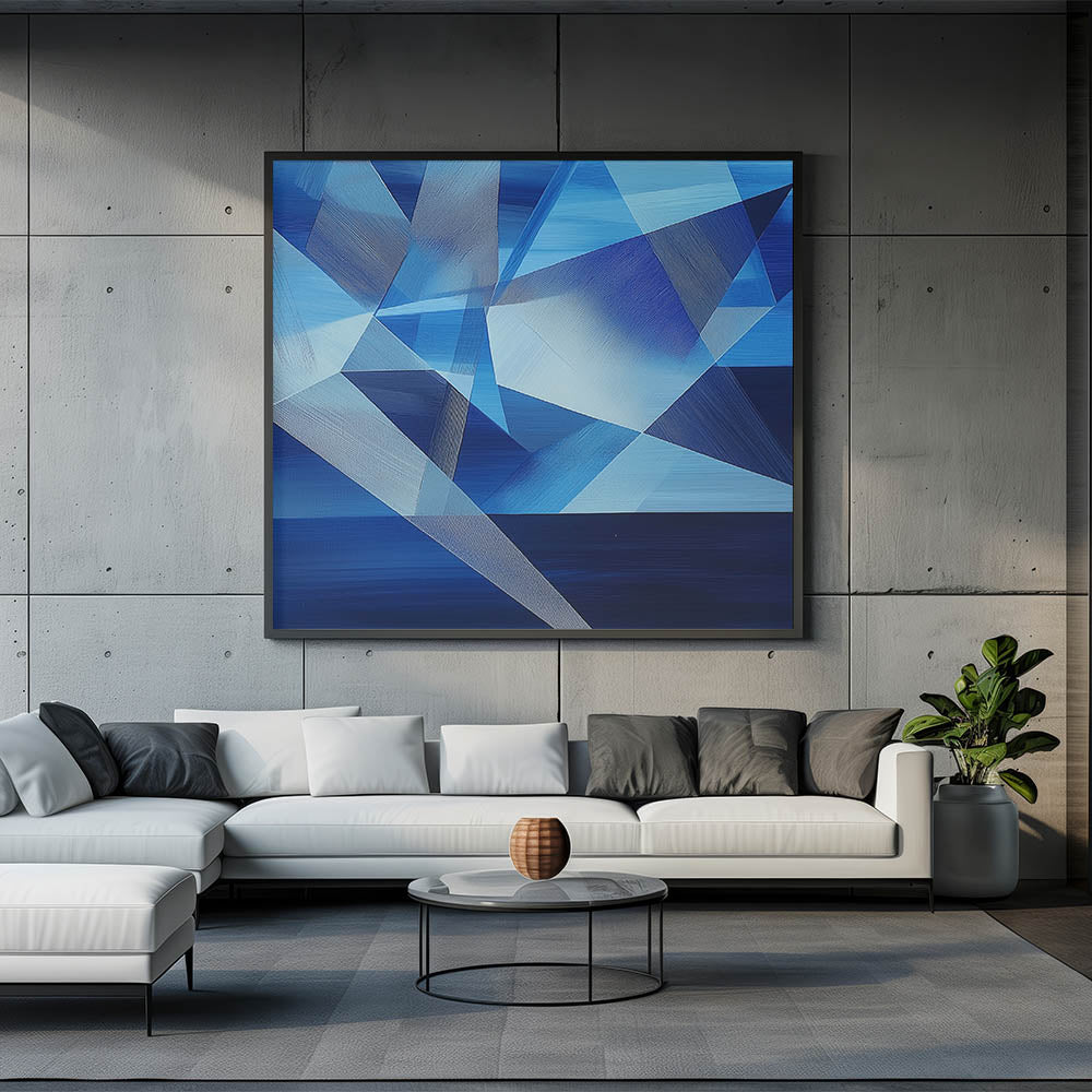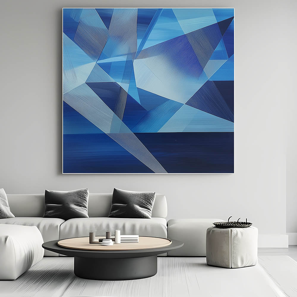 Immerse your space in the calming yet striking beauty of this Geometric Abstract Wall Art, featuring dynamic angular shapes in shades of blue and navy. This artwork plays with light and depth, creating a visual effect that evokes serenity and sophistication. Perfect for contemporary, minimalist, or industrial interiors, this piece is ideal for living rooms, offices, or creative spaces seeking a bold yet harmonious statement.