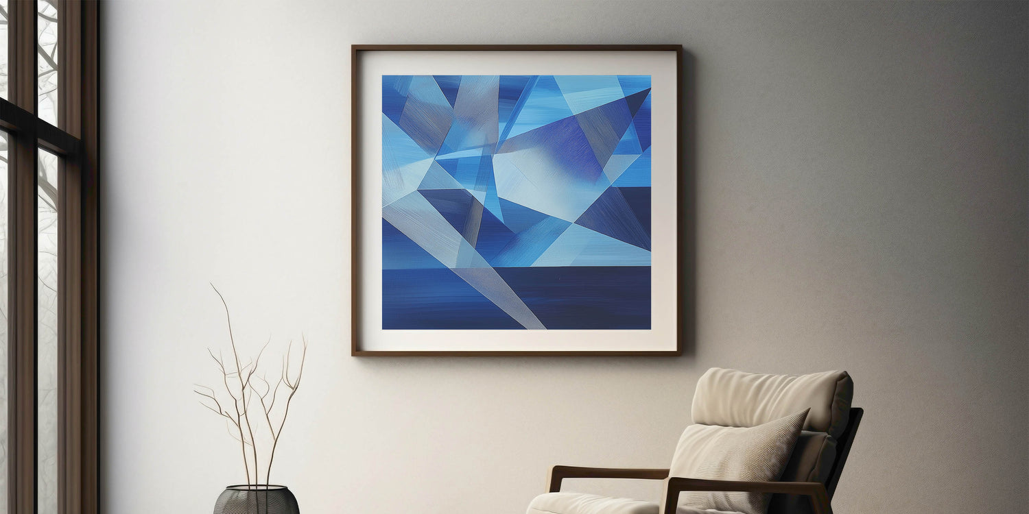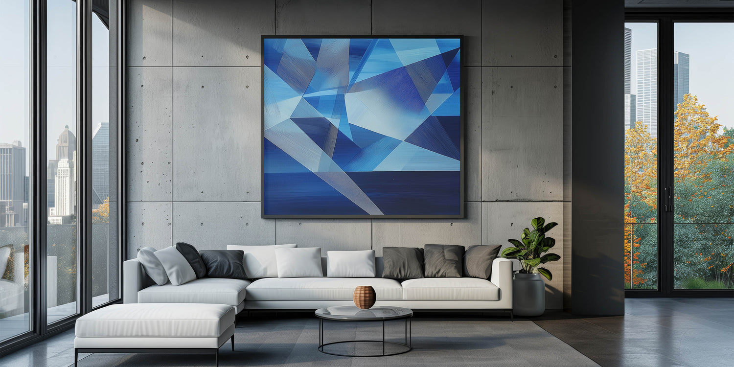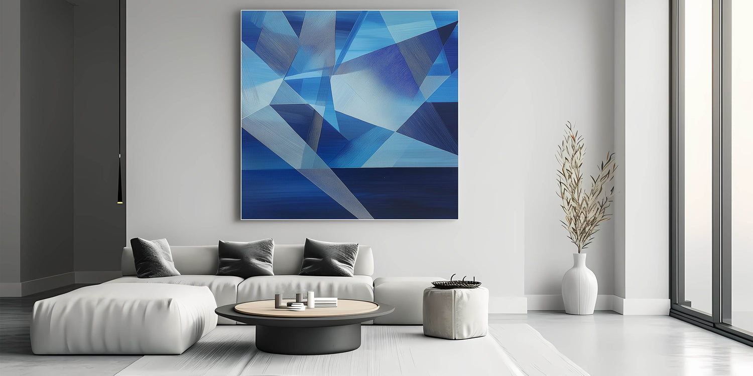 Immerse your space in the calming yet striking beauty of this Geometric Abstract Wall Art, featuring dynamic angular shapes in shades of blue and navy. This artwork plays with light and depth, creating a visual effect that evokes serenity and sophistication. Perfect for contemporary, minimalist, or industrial interiors, this piece is ideal for living rooms, offices, or creative spaces seeking a bold yet harmonious statement.