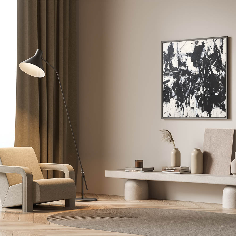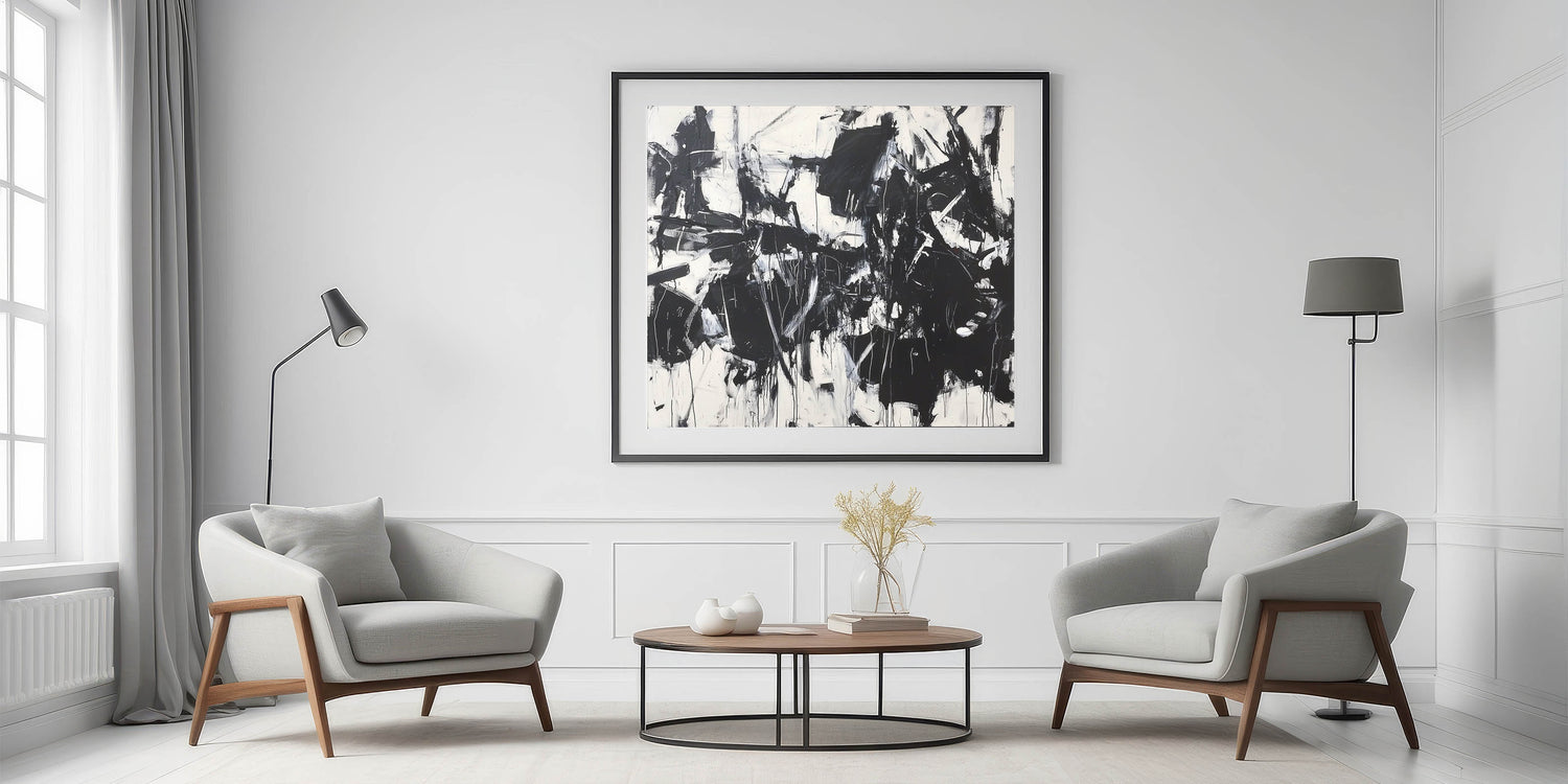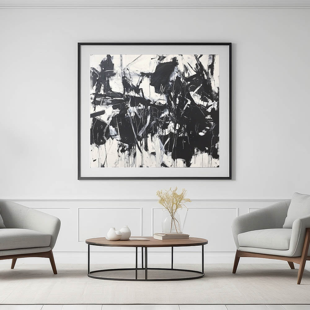 Make a bold statement with this Dynamic Monochrome Abstract Art. Featuring powerful black brushstrokes and splatters contrasted against a crisp white background, this artwork embodies raw energy and modern sophistication. Its chaotic yet balanced composition captures the essence of abstract expressionism, making it an ideal choice for minimalist or industrial-style interiors.