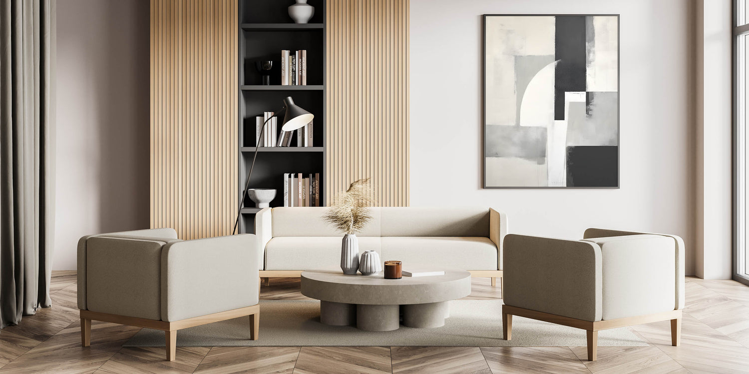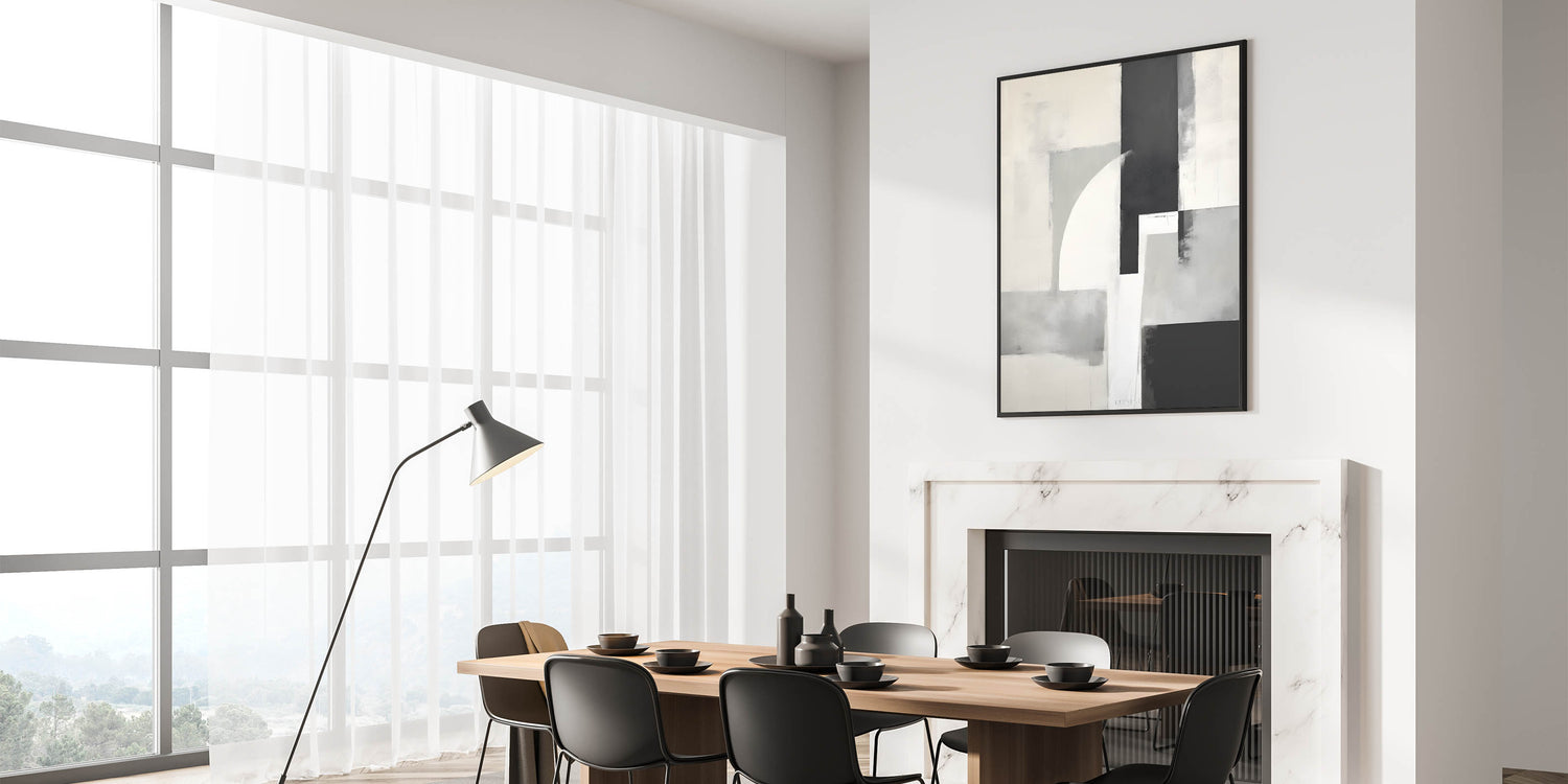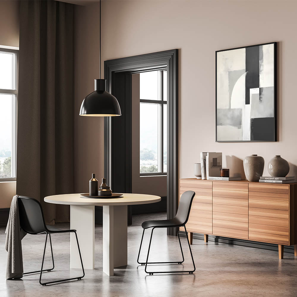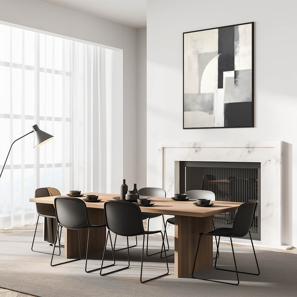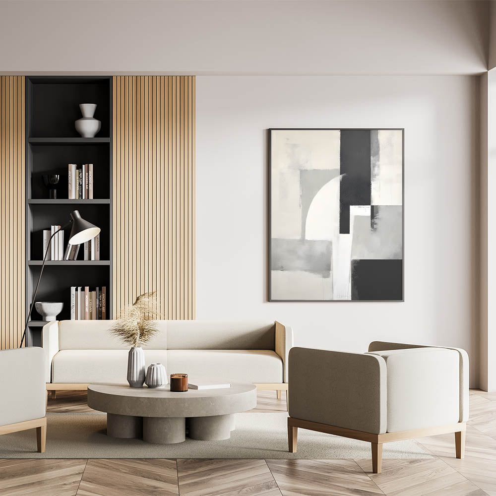 Elevate your space with this sleek design from the Abstracts in Earthen Harmony collection. Composed of intersecting shapes in black, gray, white, and beige, this piece offers a modern, architectural take on minimalist wall decor. Its soft textures and bold contrast strike the perfect balance between structure and subtlety.