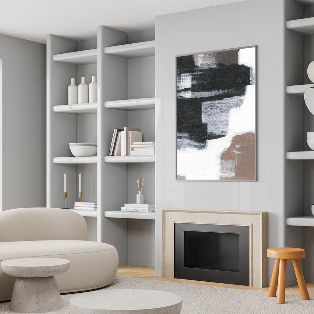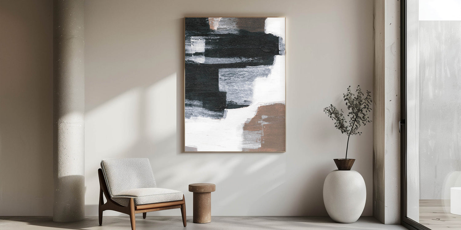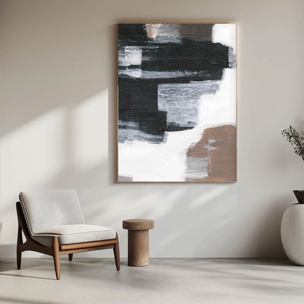 This design from the Earthen Harmony Abstracts collection brings bold contrast to life through expressive brushstrokes. Deep black, crisp white, and earthy brown tones form a structured yet organic composition. Its abstract layout captures raw energy while staying grounded in minimalist design. Perfect for those seeking modern abstract art with graphic elegance and warmth.