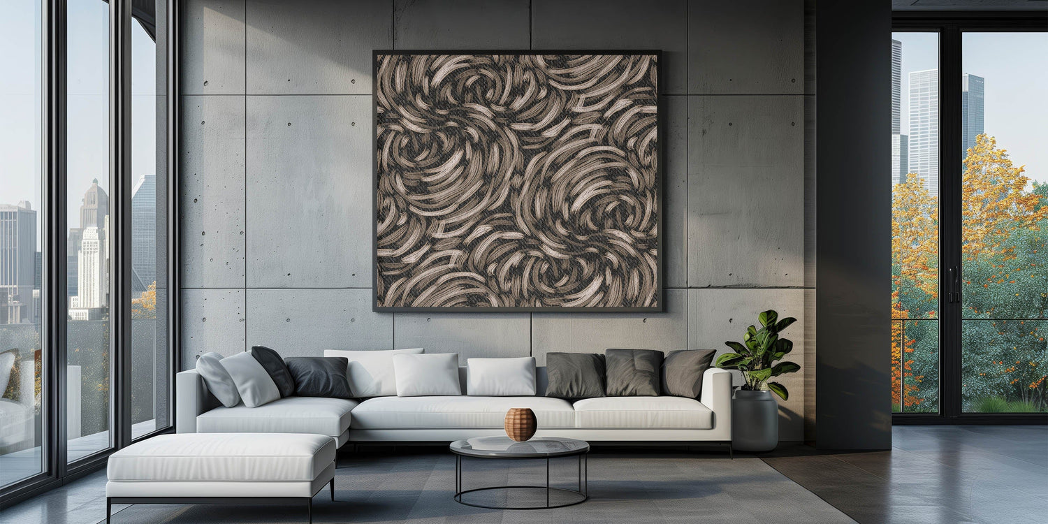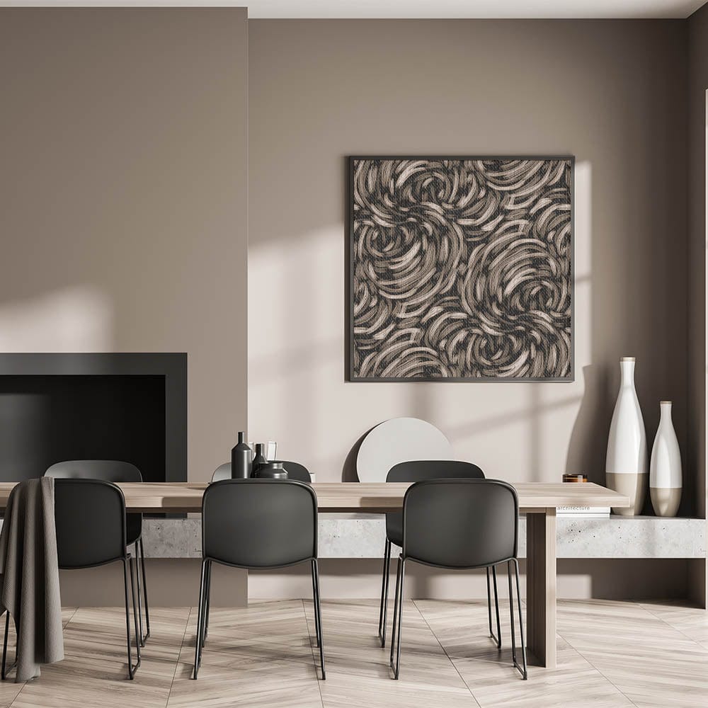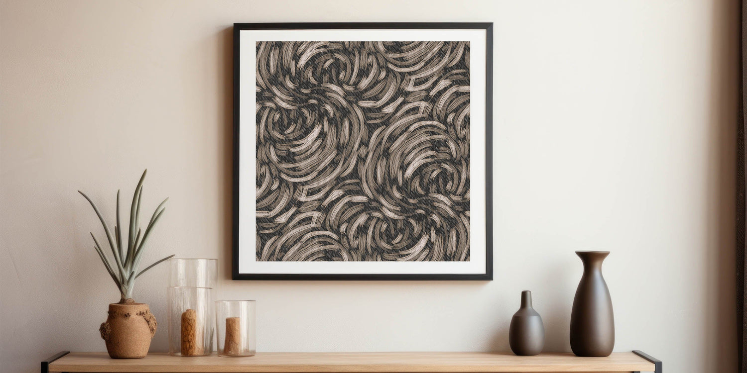 This captivating piece from our Abstracts in Earthen Harmony collection combines fluid, swirling lines in earthy tones of beige and black. The organic motion of the design evokes a sense of harmony and energy, making it an ideal addition to contemporary and minimalist spaces.