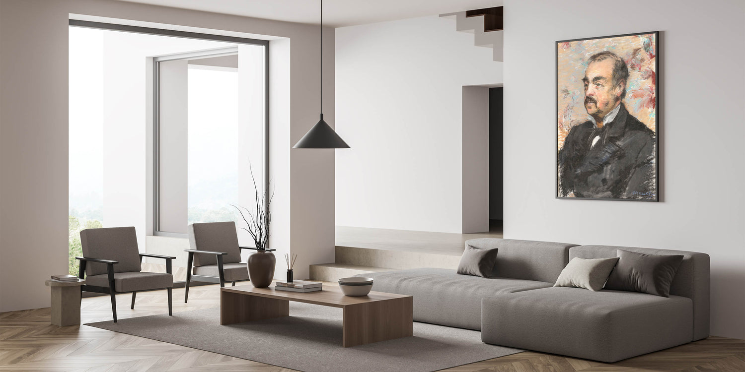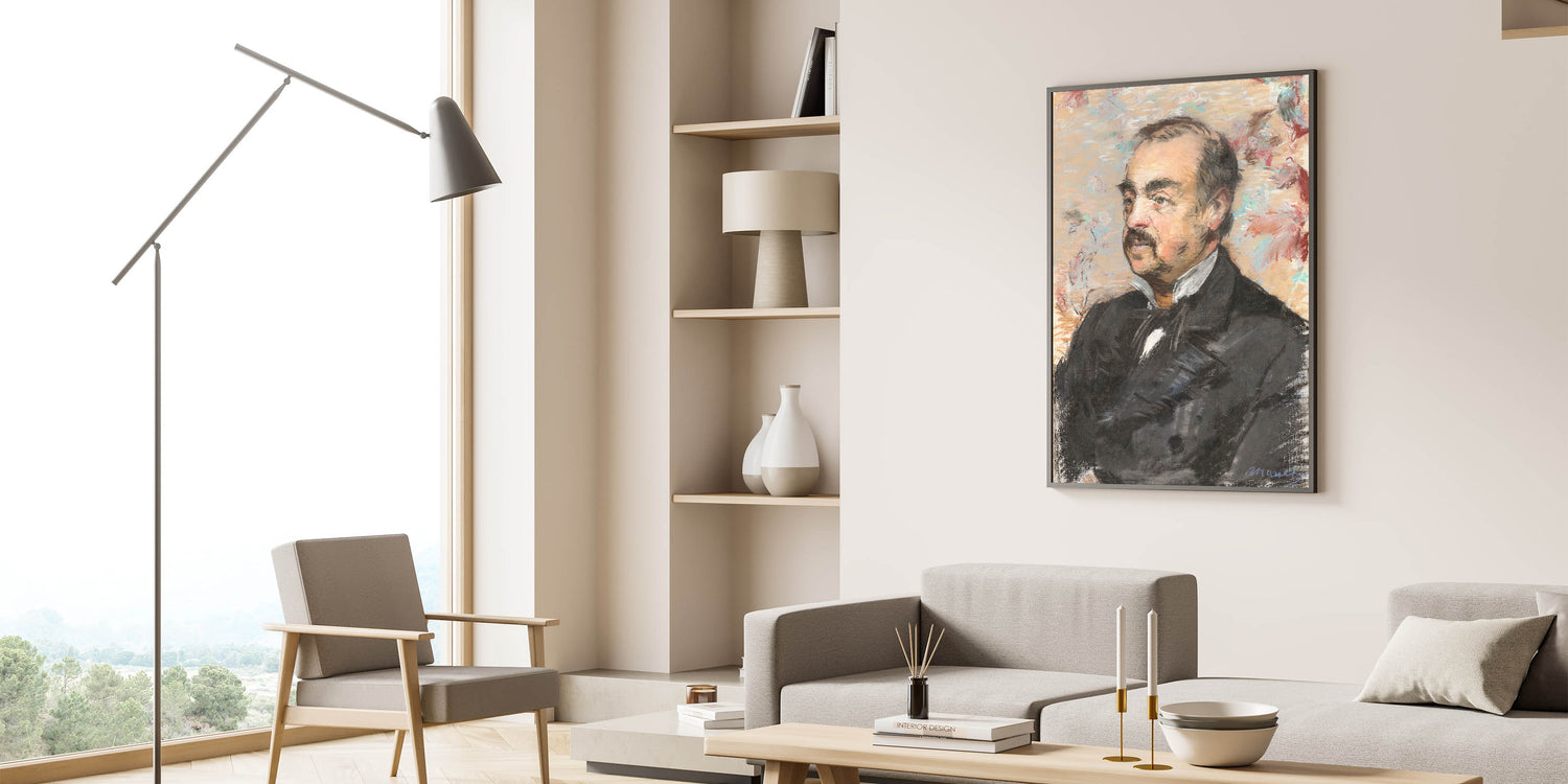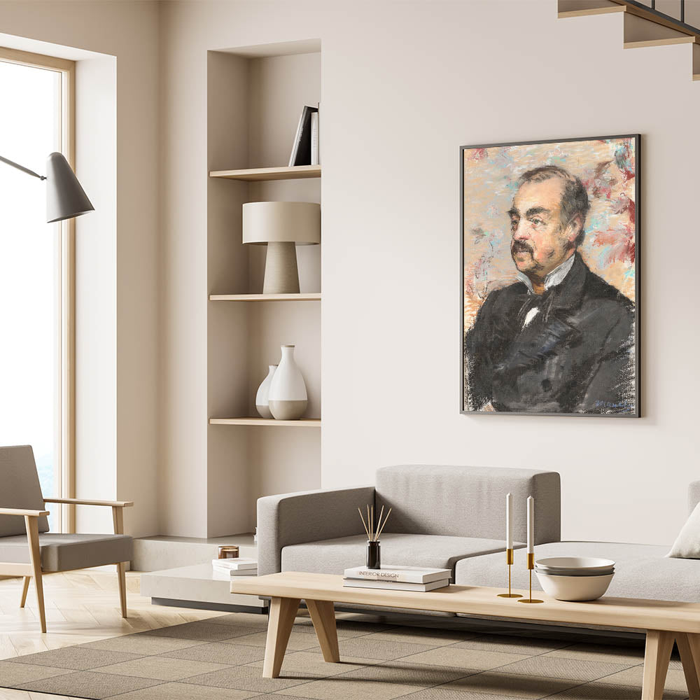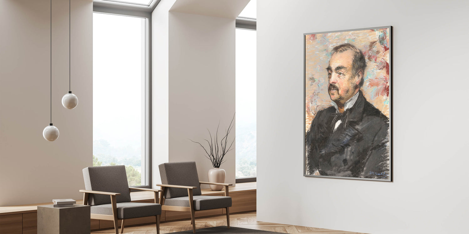 Add a touch of sophistication to your home with Édouard Manet’s "Portrait of Julien de la Rochenoire" (1882). This elegant pastel portrait highlights Manet’s exceptional ability to capture character and style. The subject, Julien de la Rochenoire, is depicted in a formal black coat, set against a beautifully textured background of soft pastels and florals. The juxtaposition of bold and delicate strokes brings a dynamic energy to this timeless masterpiece.