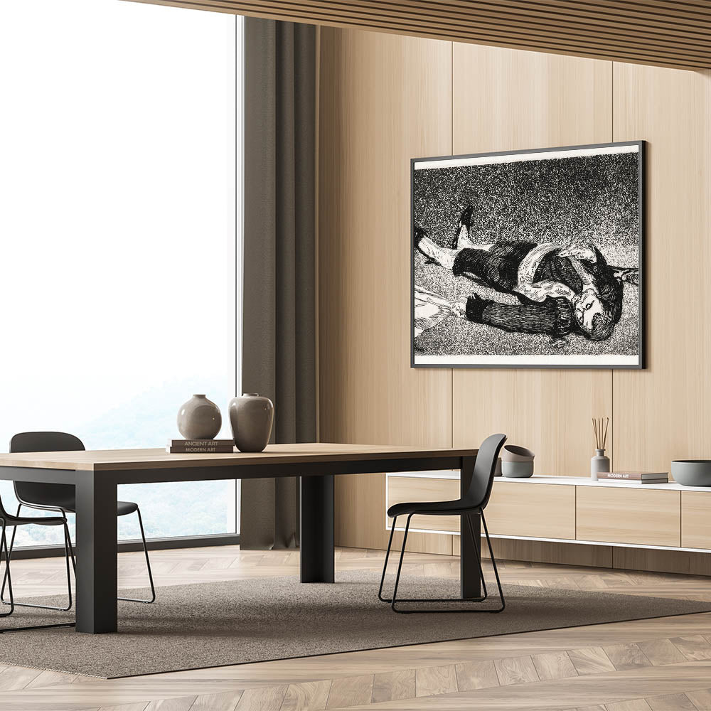 This monochromatic rendition of Édouard Manet’s Dead Toreador brings a stark, dramatic effect to the original scene of a fallen matador. The use of black and white emphasizes the somber atmosphere, creating a striking visual impact that resonates with Manet’s realist approach. Ideal for those who appreciate art that delves into themes of mortality and heroism, this piece adds depth and sophistication to any collection.