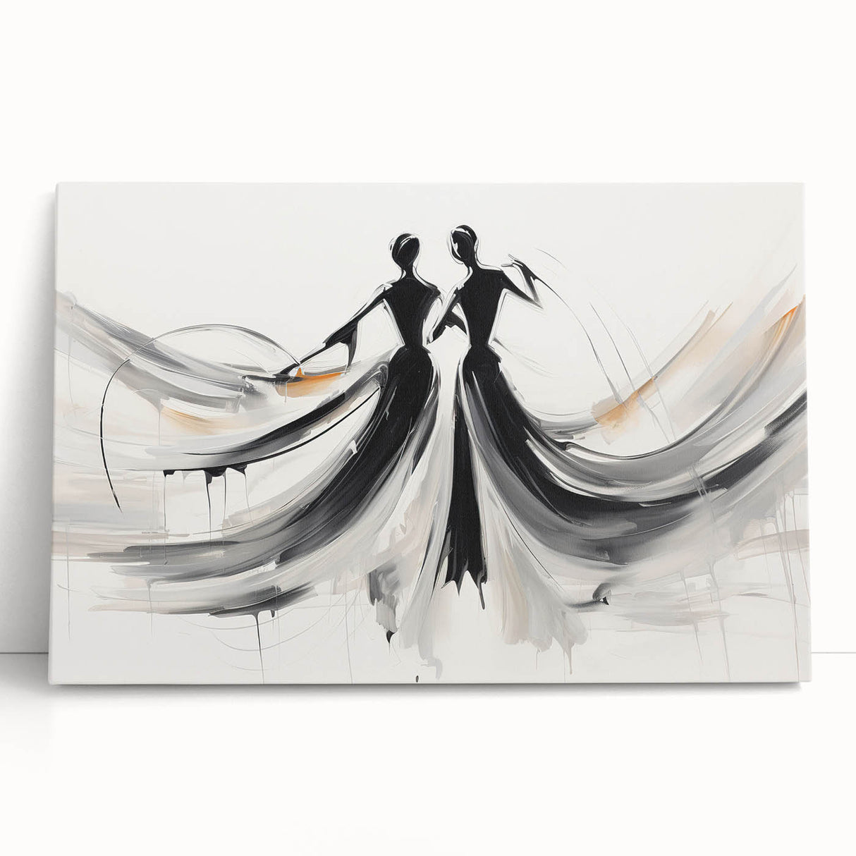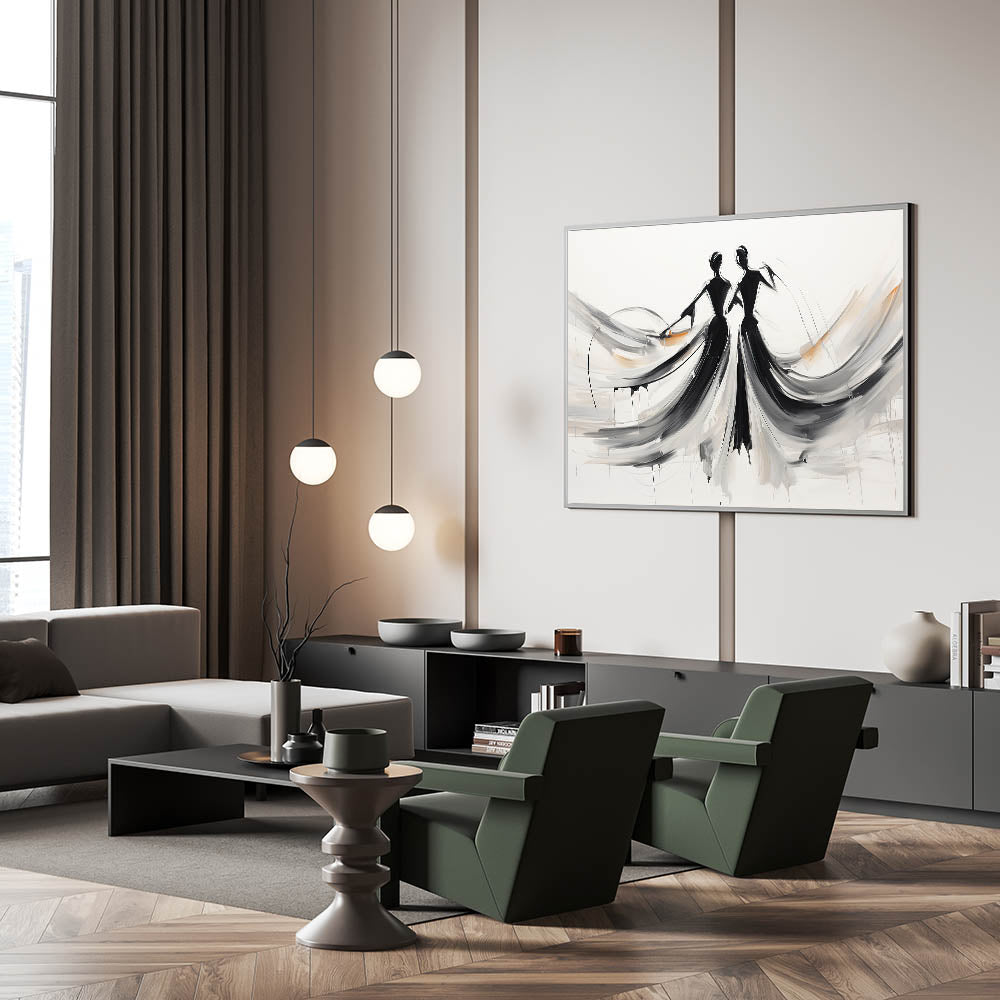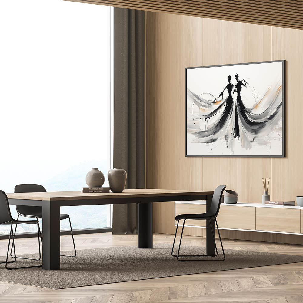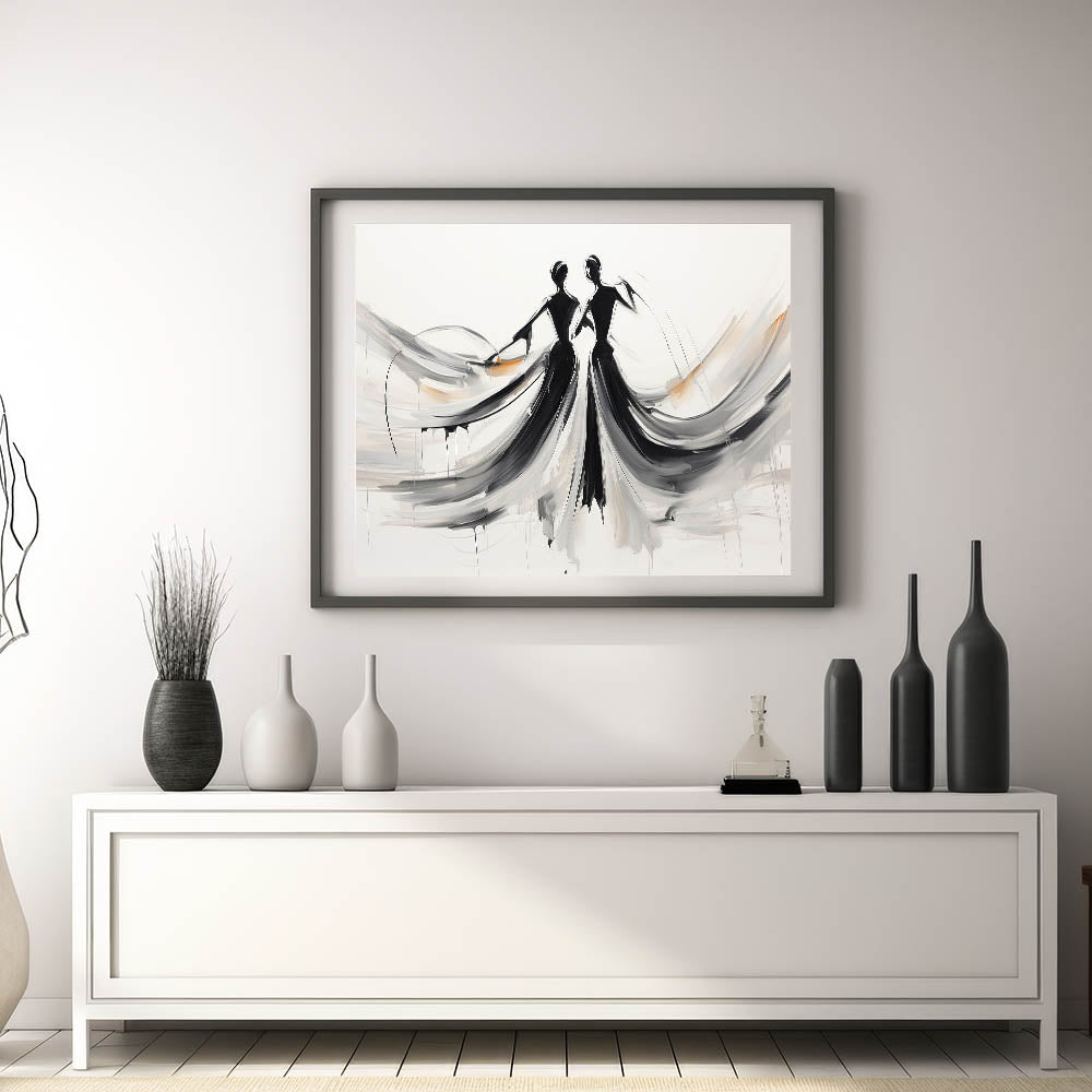 Bring movement and sophistication to your space with this stunning abstract wall art, featuring two fluid figures in flowing black and white gowns. The expressive brushstrokes and minimalist color palette create a modern yet timeless aesthetic, making it an ideal wall art for living room décor. The subtle touches of warm neutral tones add depth, enhancing its artistic elegance.