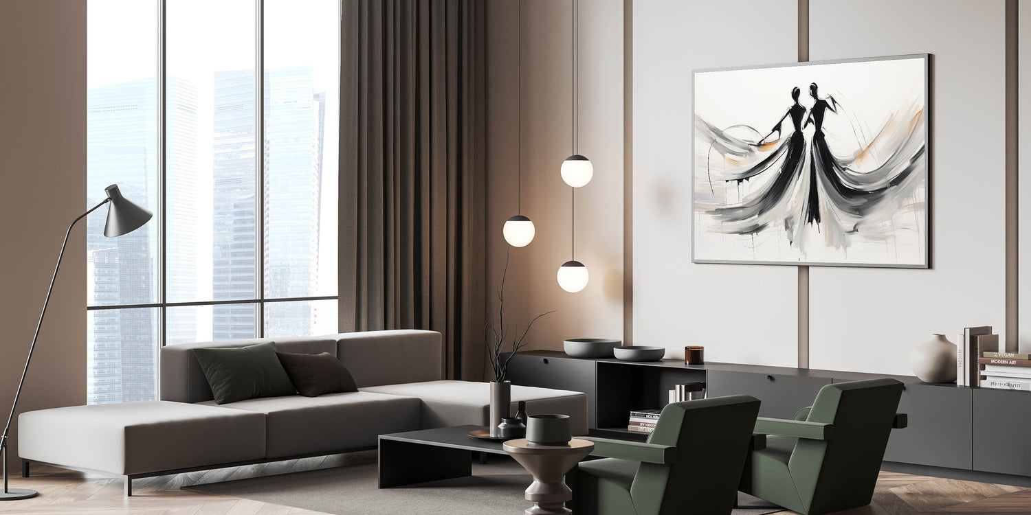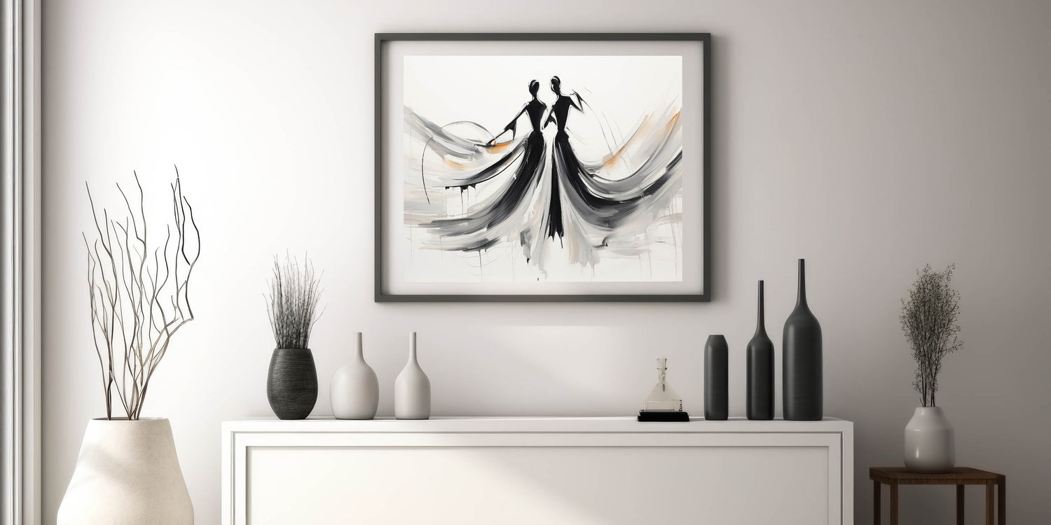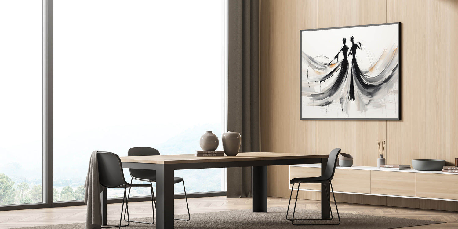 Bring movement and sophistication to your space with this stunning abstract wall art, featuring two fluid figures in flowing black and white gowns. The expressive brushstrokes and minimalist color palette create a modern yet timeless aesthetic, making it an ideal wall art for living room décor. The subtle touches of warm neutral tones add depth, enhancing its artistic elegance.
