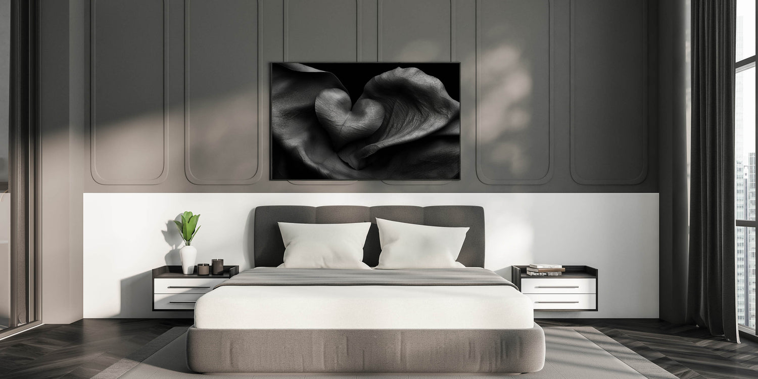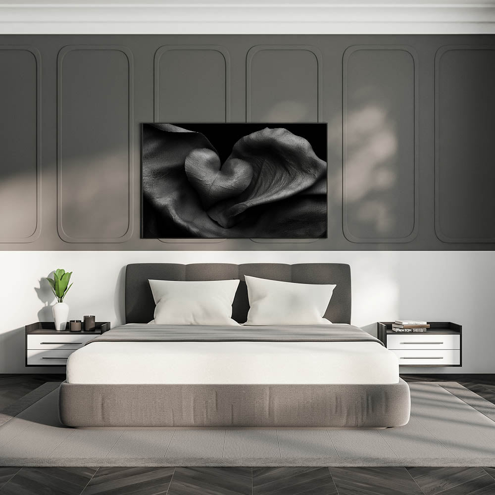 Bring sophistication and romance to your bedroom with this elegant black heart abstract wall art. The fluid fabric-like textures gracefully fold to form a subtle yet striking heart shape, symbolizing elegance, love, and depth. The monochrome palette with rich shadows and highlights makes this artwork a perfect statement piece for modern and luxury bedroom decor.