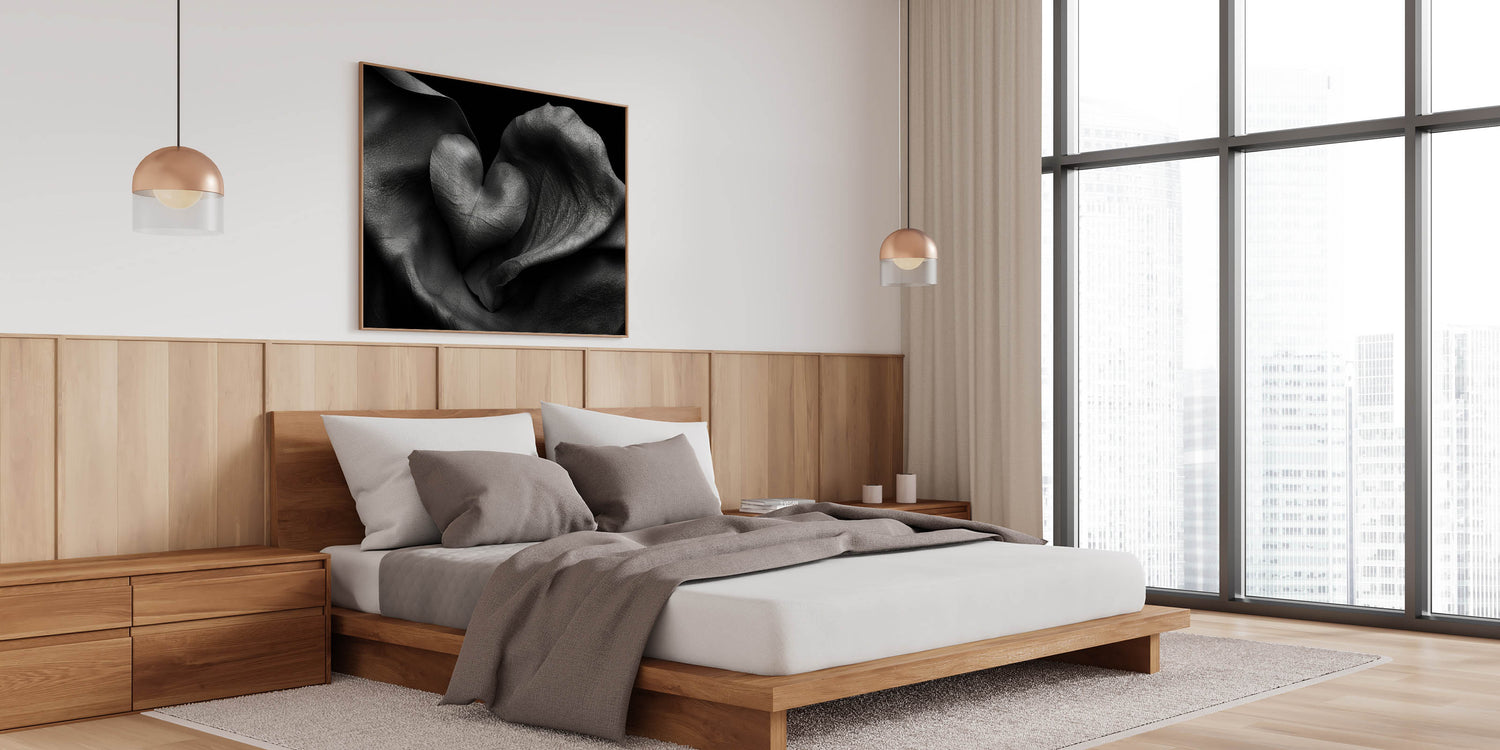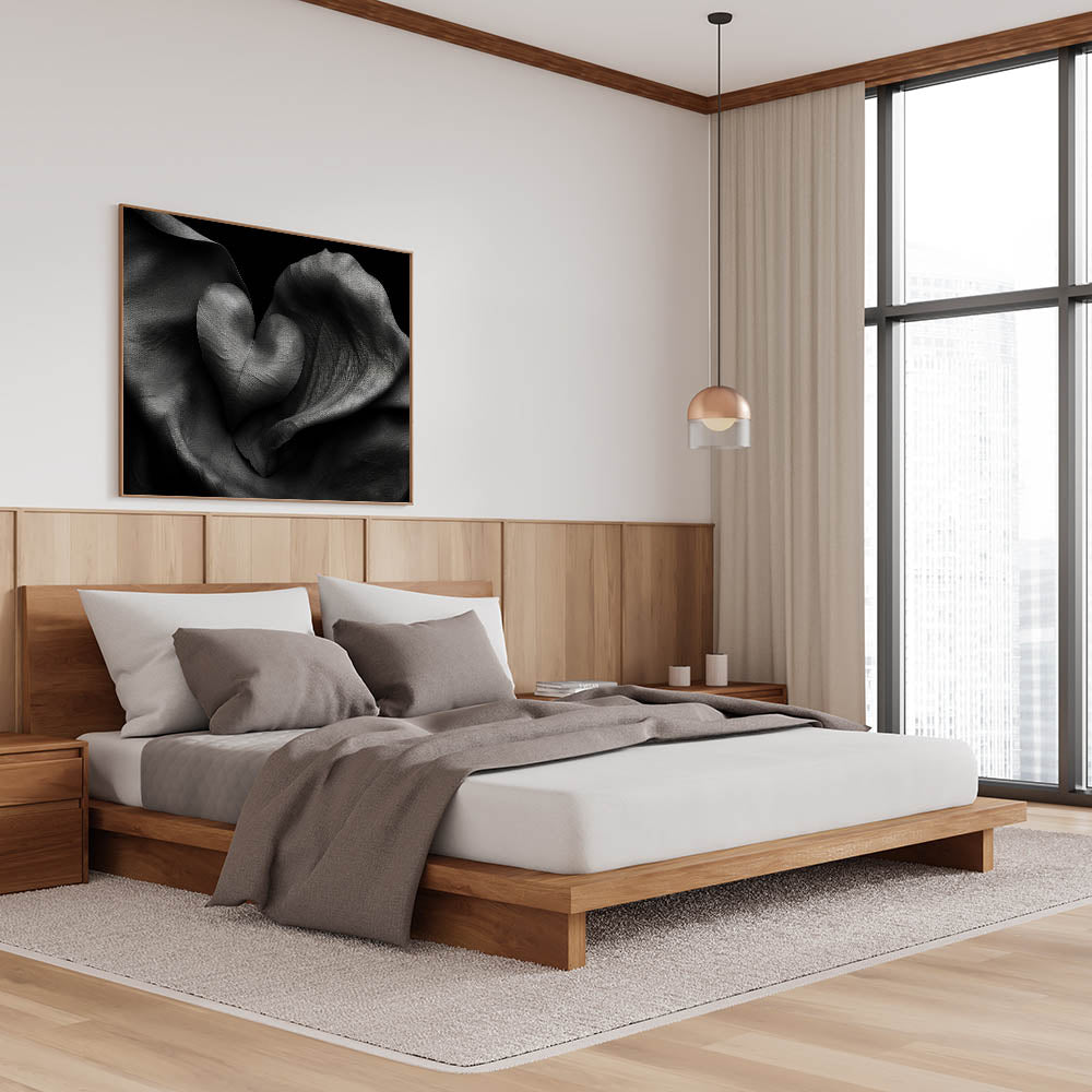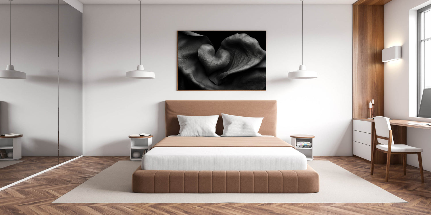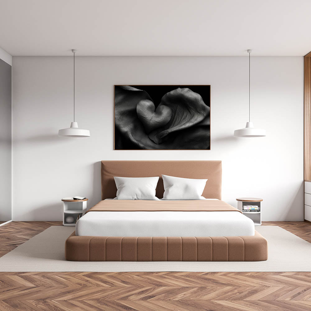 Perfect for those seeking framed bedroom art, canvas prints for bedroom spaces, or acrylic bedroom wall art, this large bedroom wall decor blends soft elegance with modern sophistication. Its luxurious textures and heart-shaped composition make it an ideal choice for modern bedroom wall decor, adding warmth and style.