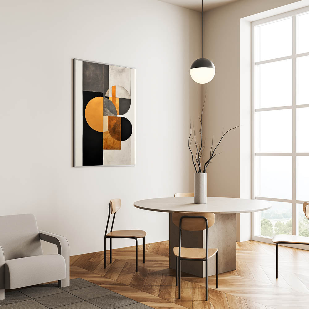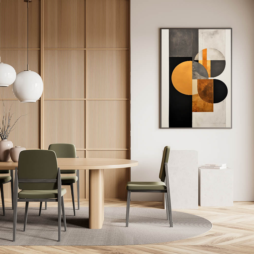 Upgrade your dining space with this elegant dining room art print, featuring a luxurious geometric design in black, gold, and gray. The intricate composition of overlapping circles and sharp angles creates a visually dynamic piece, blending modern minimalism with opulent sophistication. Perfect for contemporary and high-end interiors, this artwork brings a refined aesthetic to your dining room wall décor.