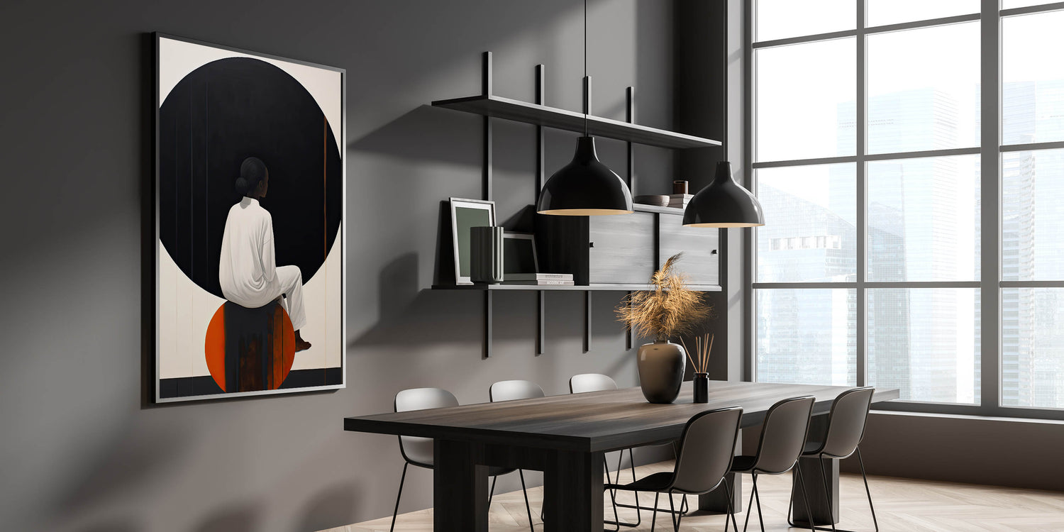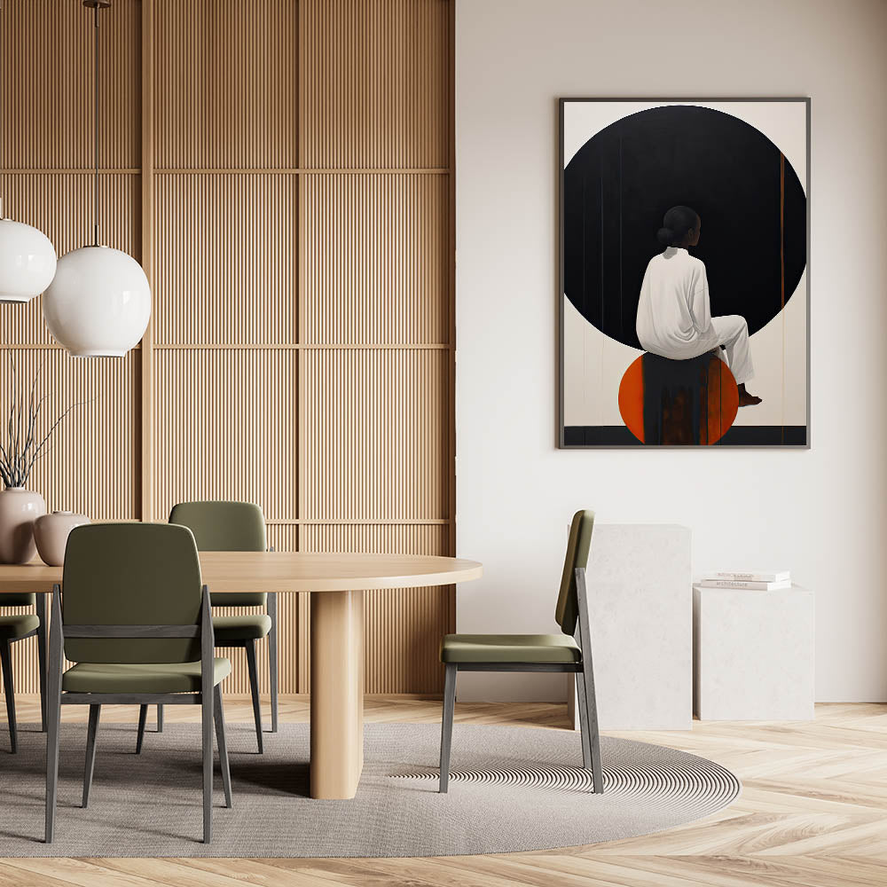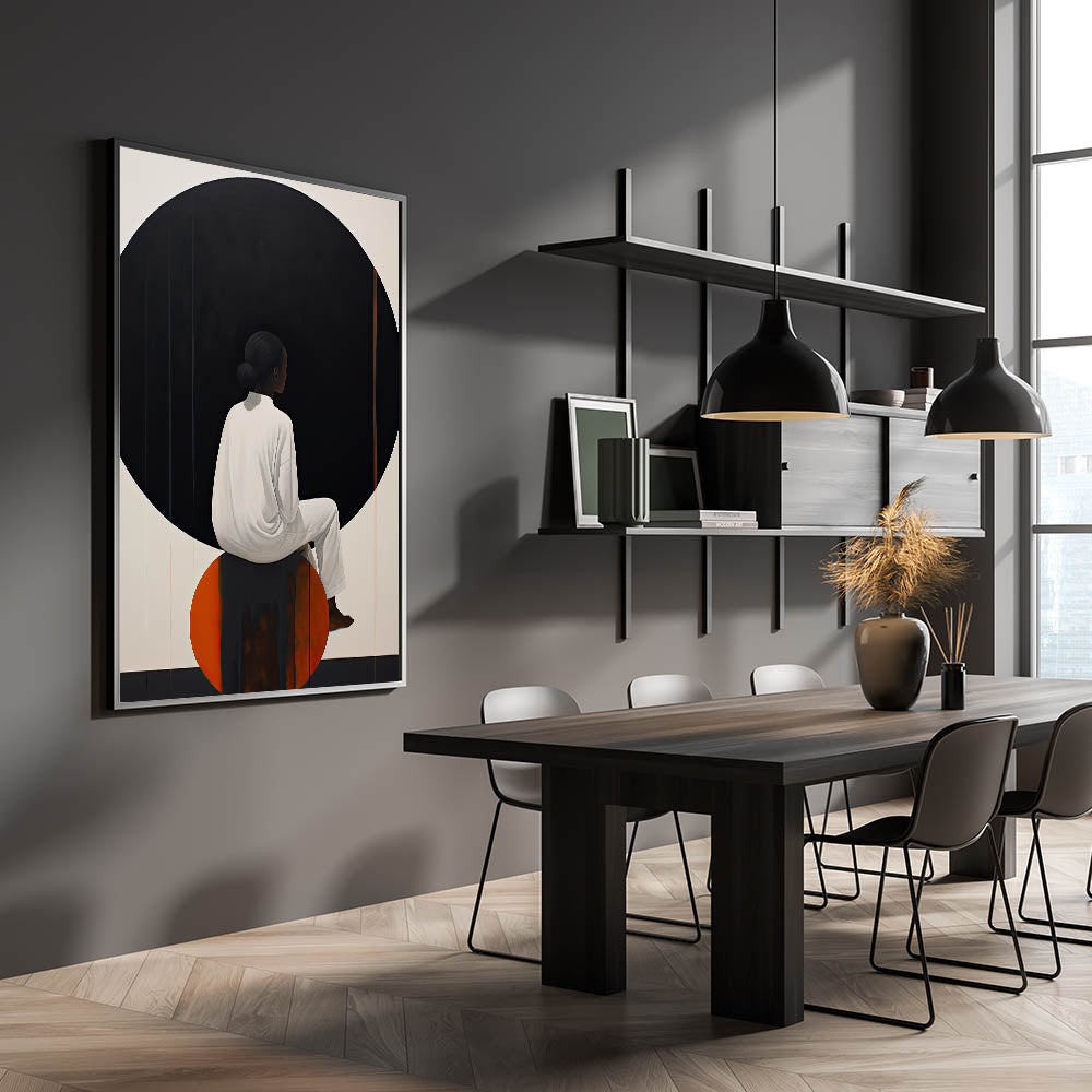 Create a striking focal point in your dining space with this elegant dining room wall art. Featuring a serene female figure against a bold abstract black and white backdrop, complemented by deep orange tones, this piece blends modern artistry with sophistication. Perfect for those who appreciate contemporary dining art pieces, this design effortlessly enhances any modern dining room art collection.