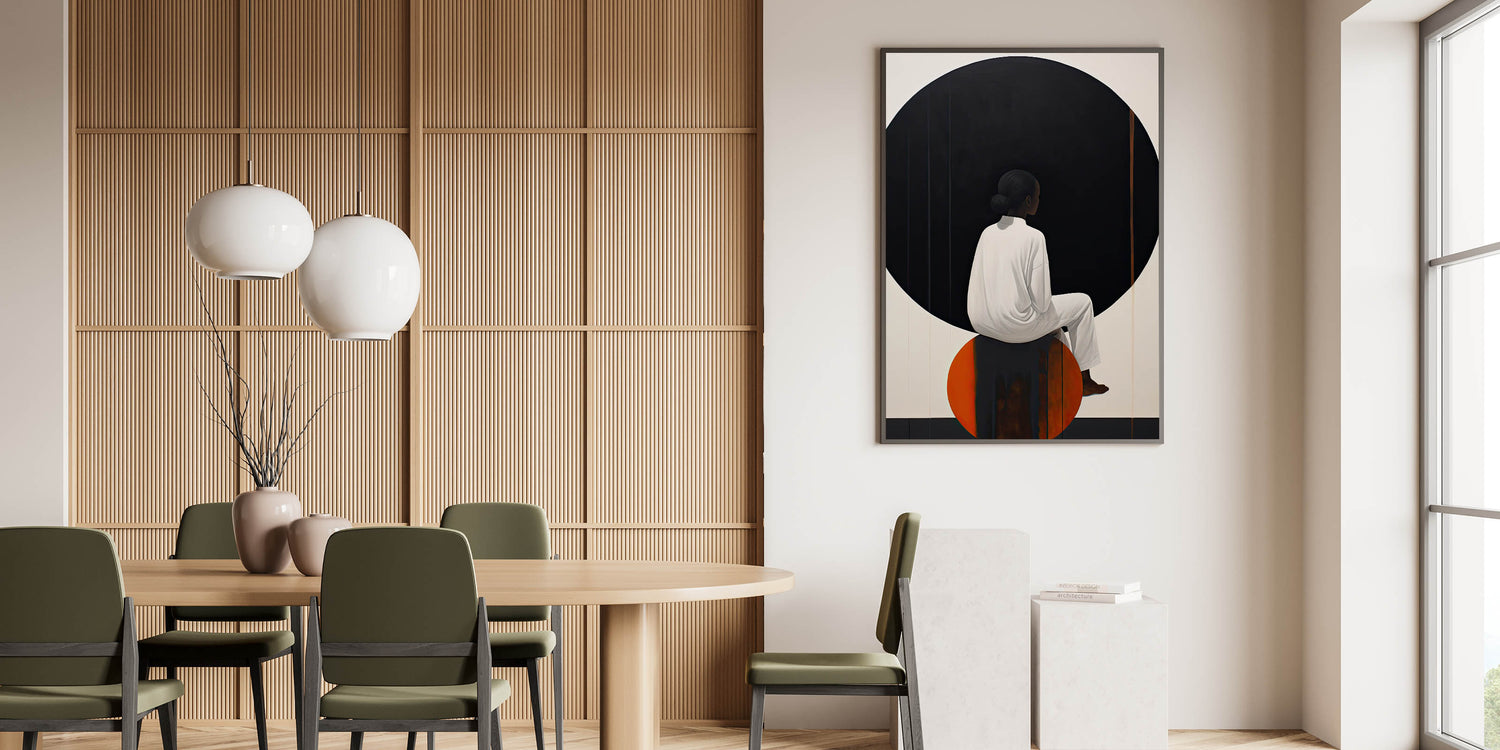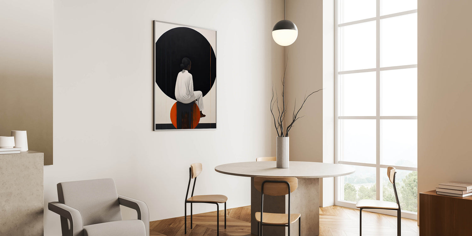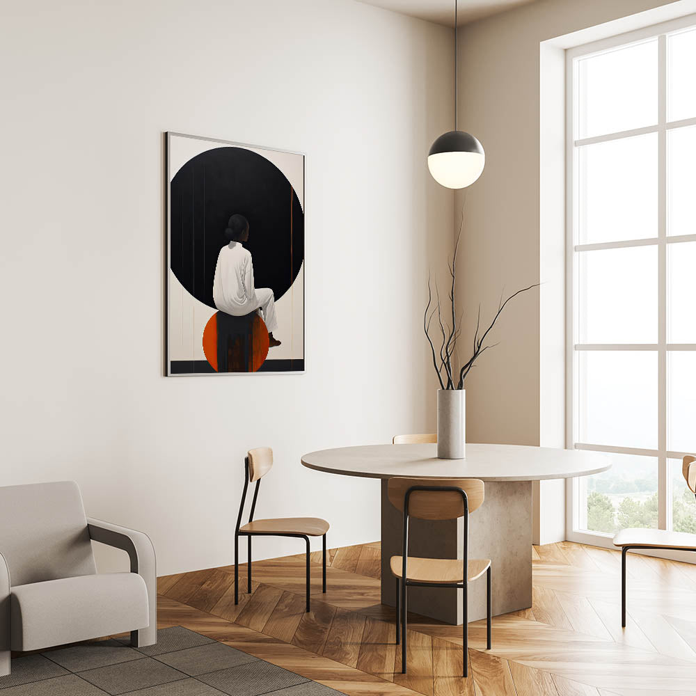 Create a striking focal point in your dining space with this elegant dining room wall art. Featuring a serene female figure against a bold abstract black and white backdrop, complemented by deep orange tones, this piece blends modern artistry with sophistication. Perfect for those who appreciate contemporary dining art pieces, this design effortlessly enhances any modern dining room art collection.