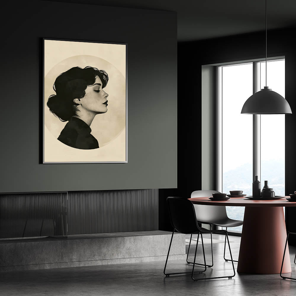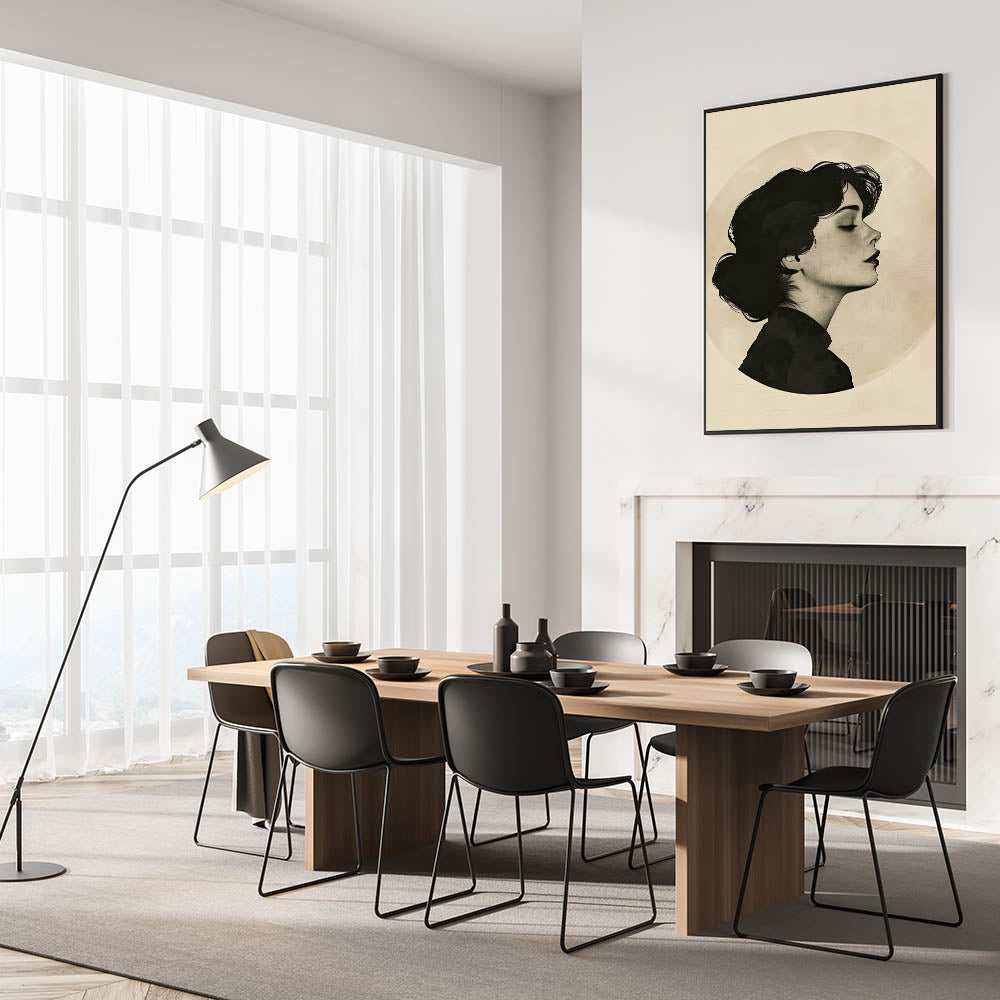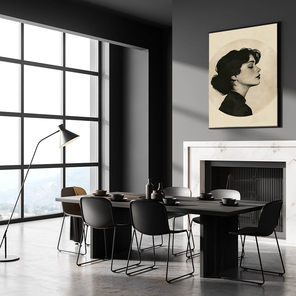 Enhance your dining space with this elegant dining room wall art, featuring a striking black and white portrait with a vintage yet modern aesthetic. This contemporary dining art piece adds a touch of sophistication, blending minimalist tones with artistic depth. Its neutral palette makes it a versatile choice for any dining room wall decor, creating a timeless and elegant ambiance.