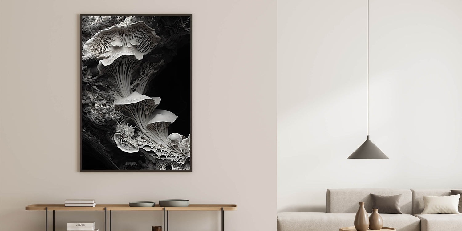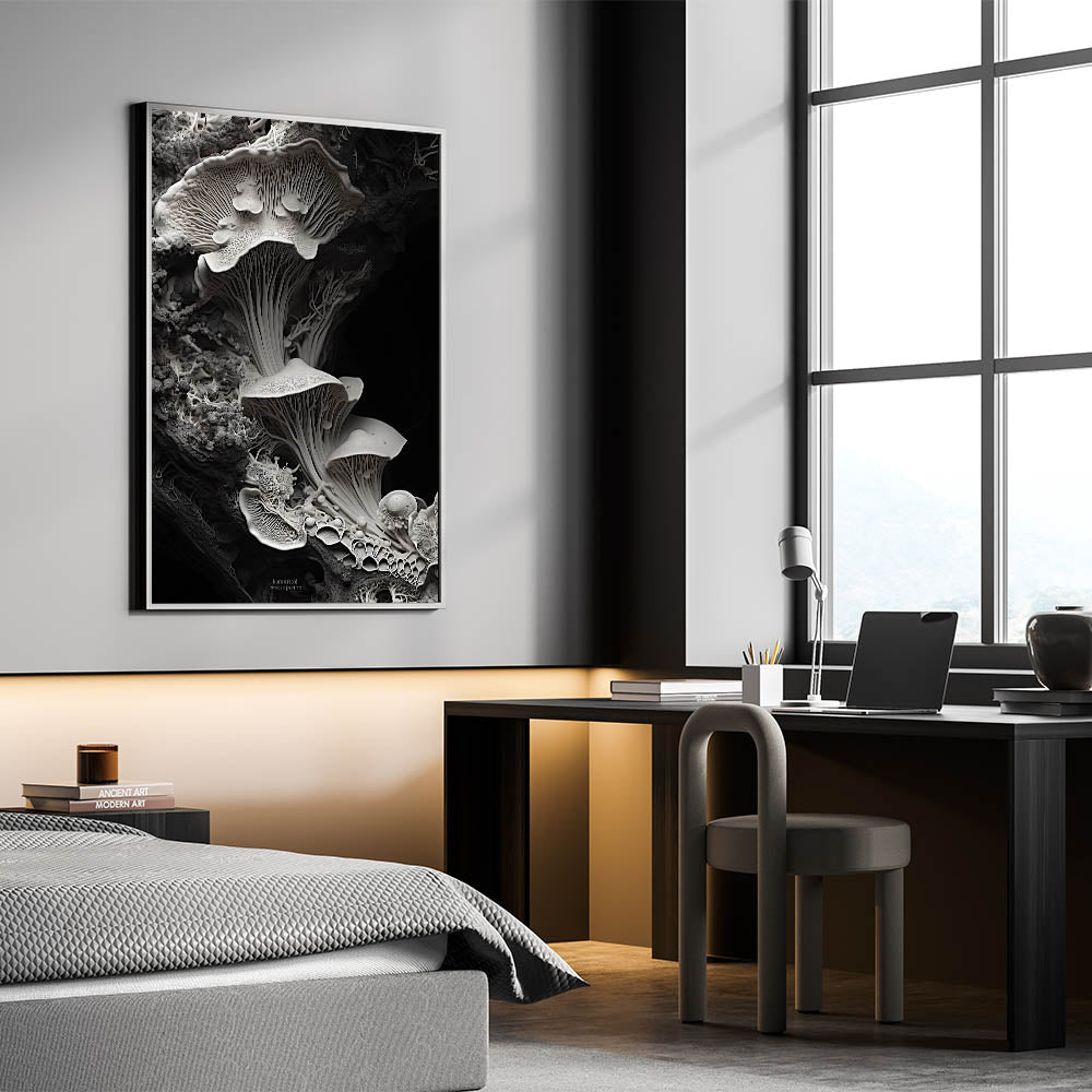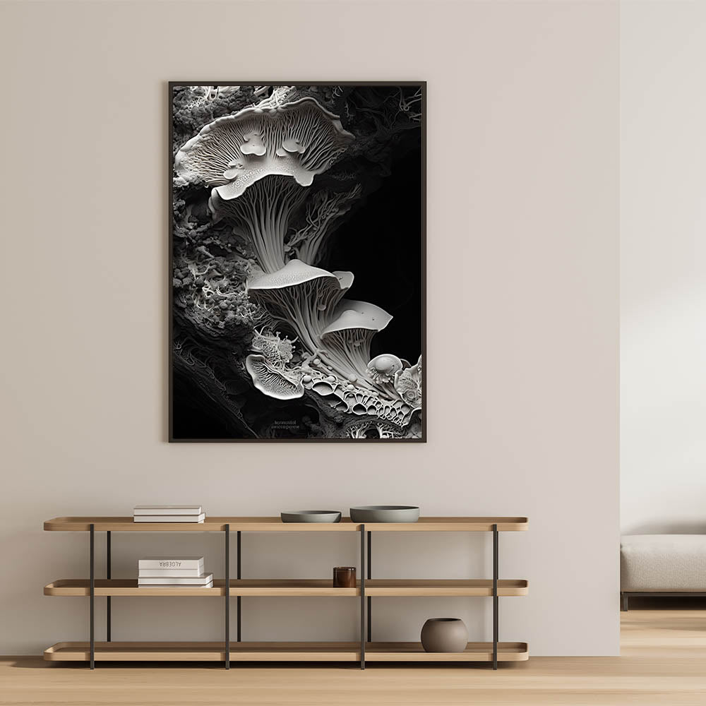Capture the serene elegance of nature with this monochrome mushroom macro wall art. This exquisite piece features a detailed closeup of mushrooms, highlighting their delicate gills and intricate structures. The grayscale palette emphasizes the fine textures and contrasts beautifully with the dark, shadowed background, creating a timeless and sophisticated look.