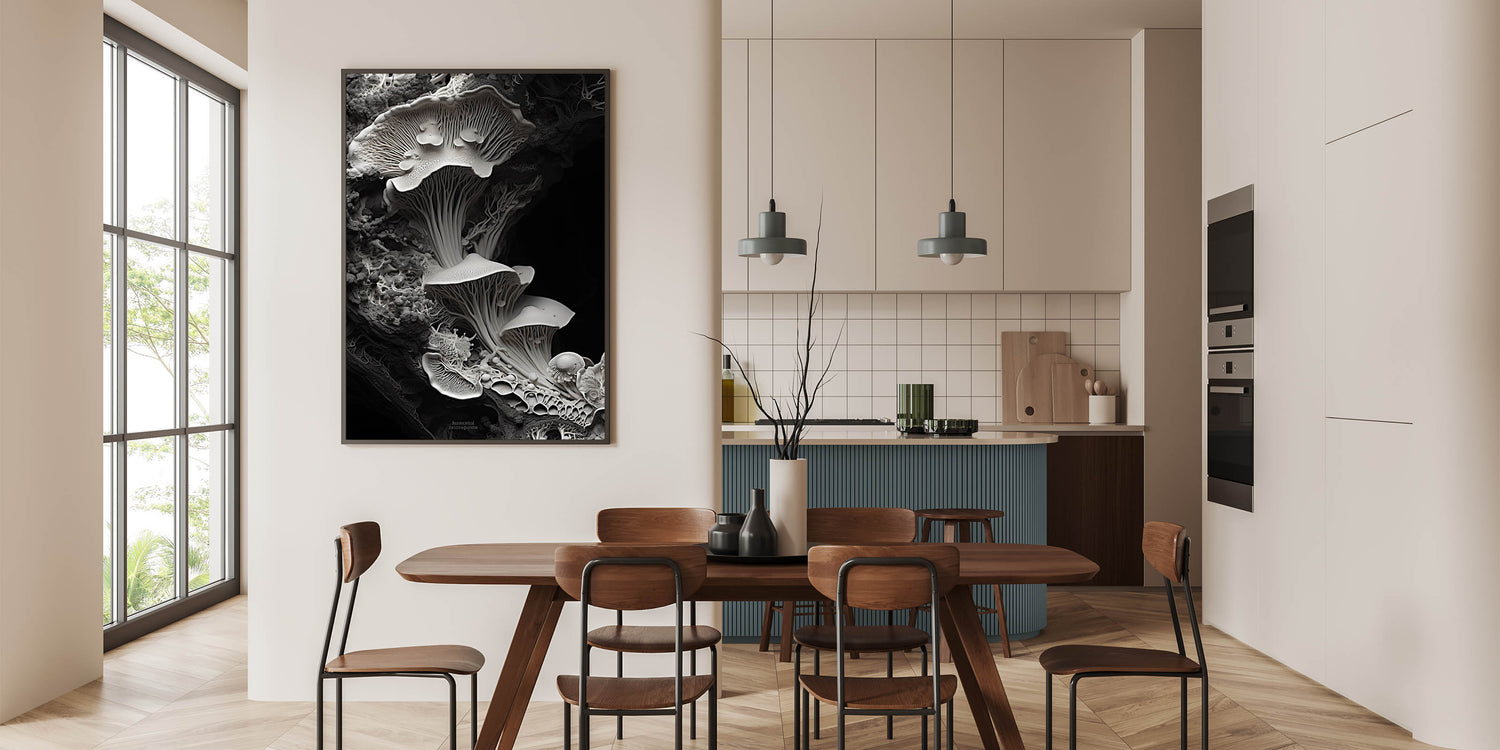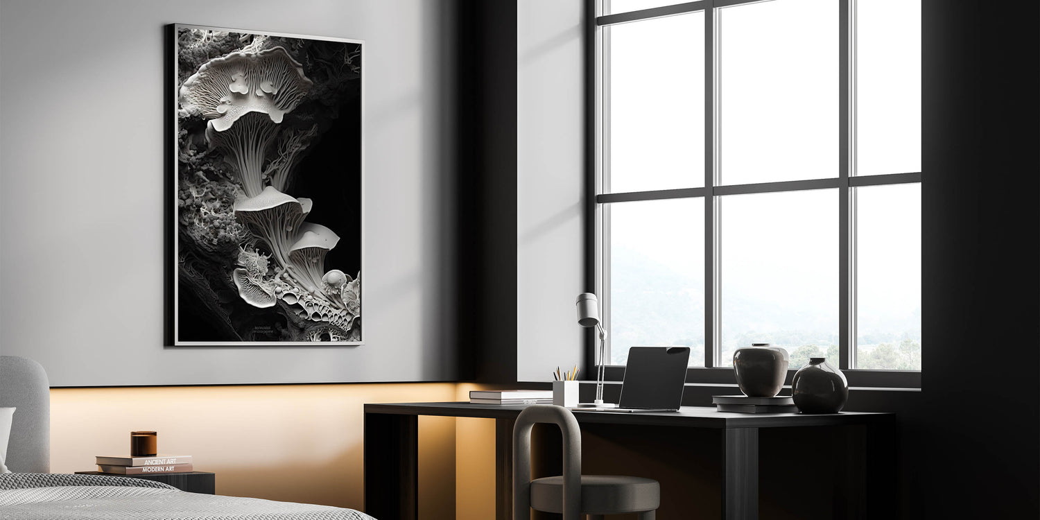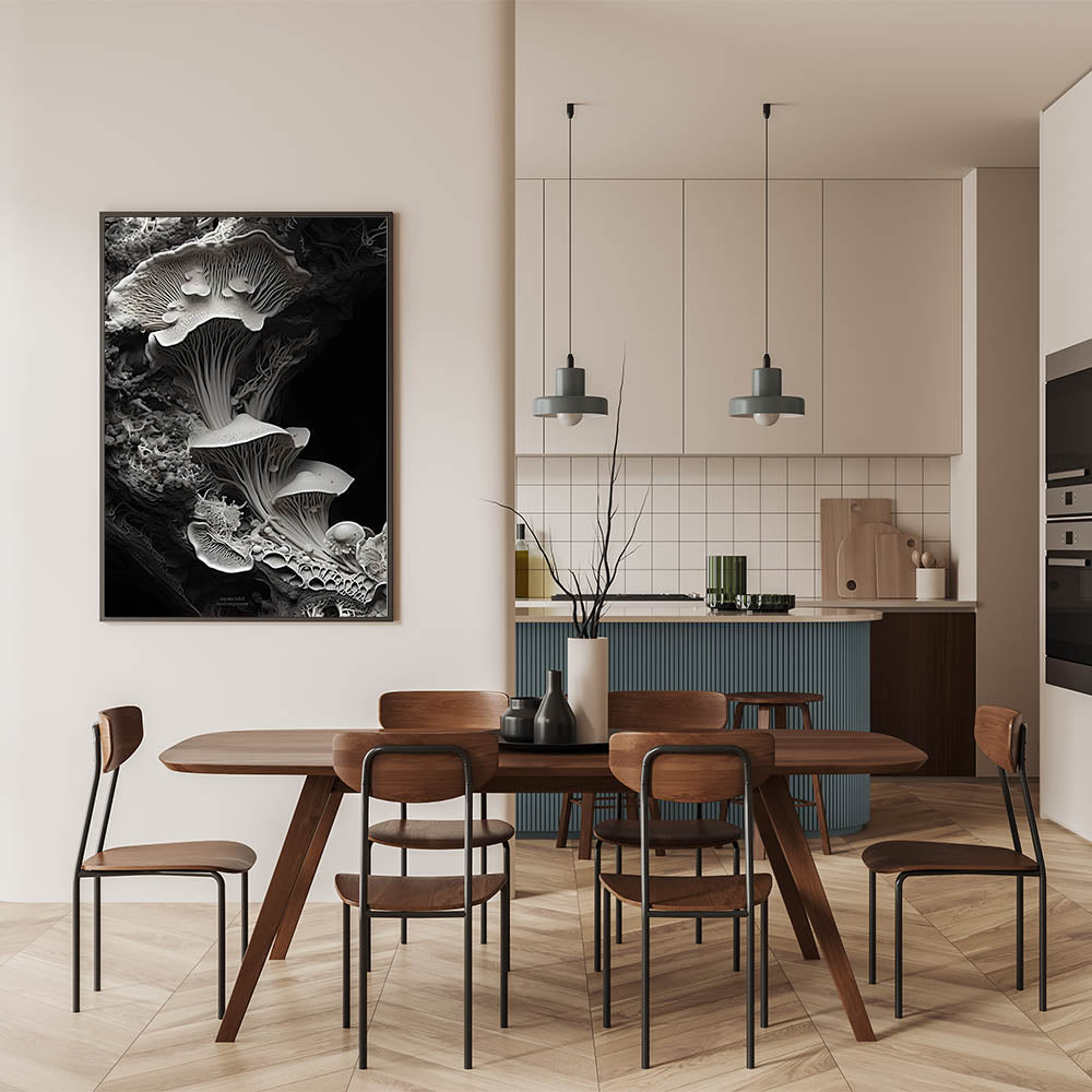 Capture the serene elegance of nature with this monochrome mushroom macro wall art. This exquisite piece features a detailed closeup of mushrooms, highlighting their delicate gills and intricate structures. The grayscale palette emphasizes the fine textures and contrasts beautifully with the dark, shadowed background, creating a timeless and sophisticated look.