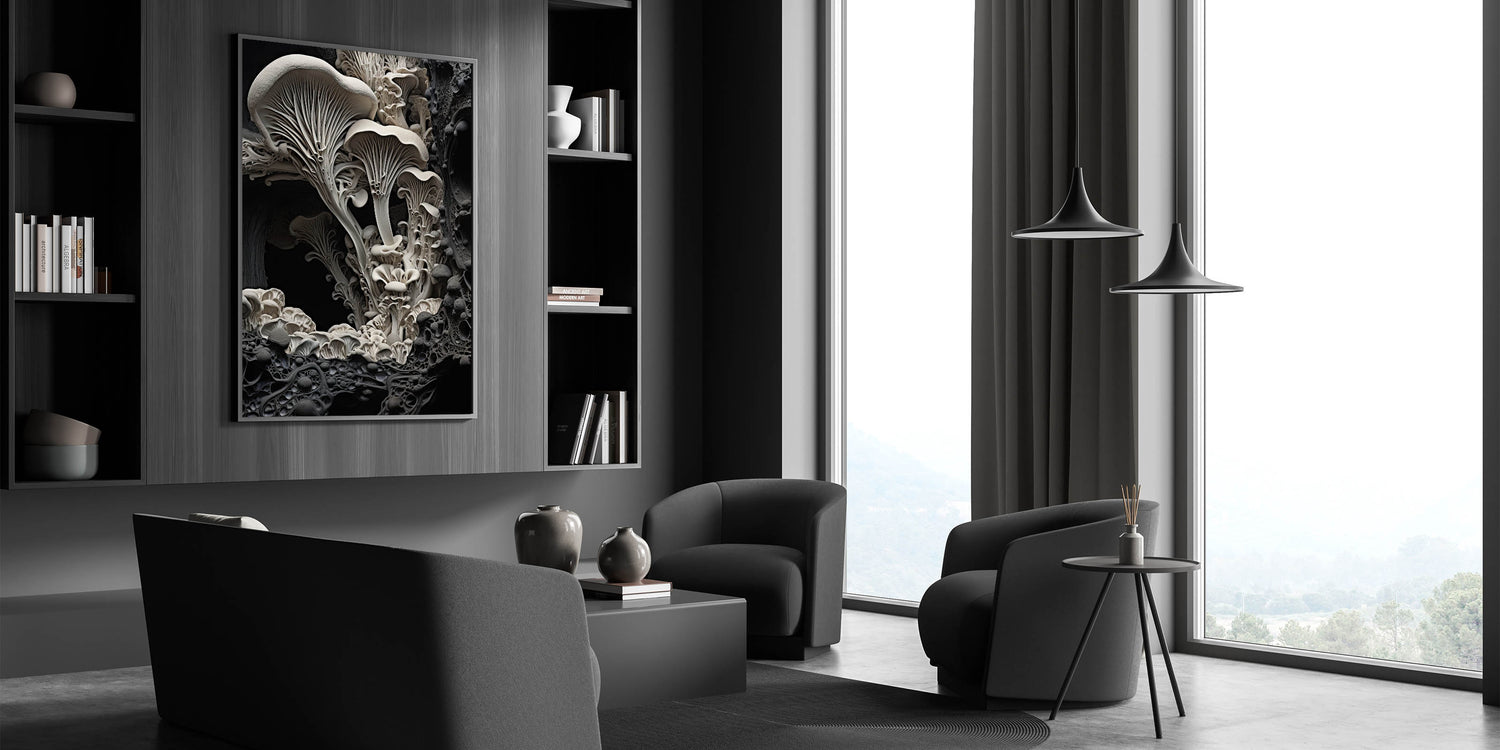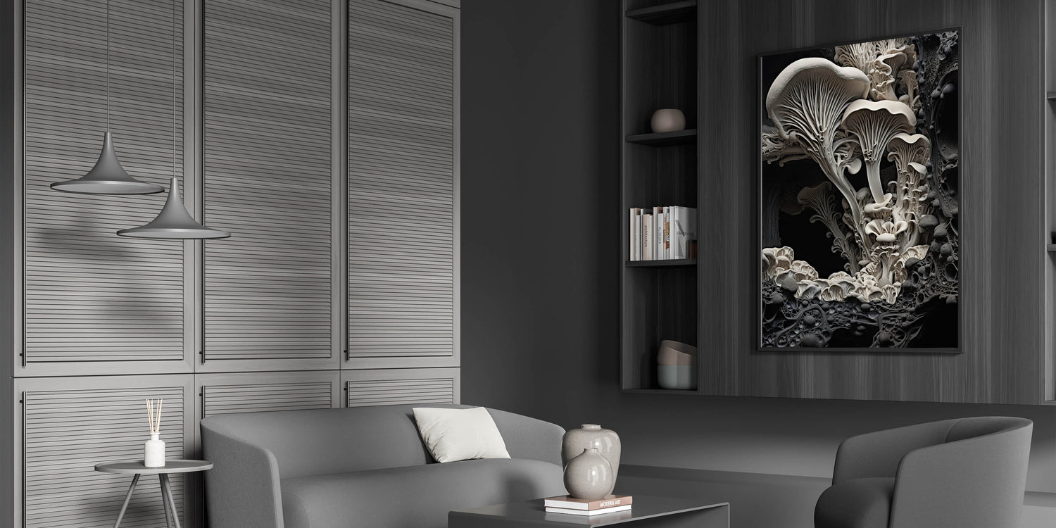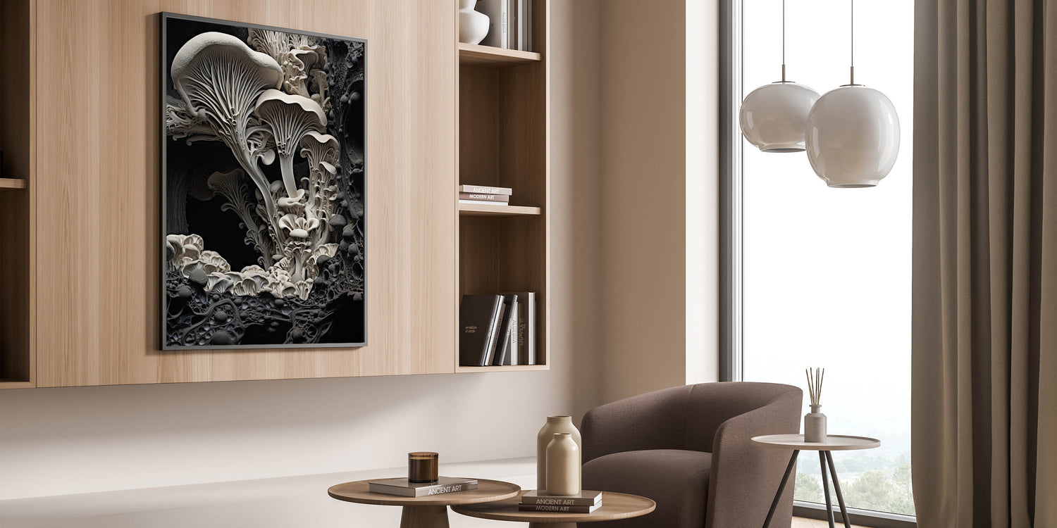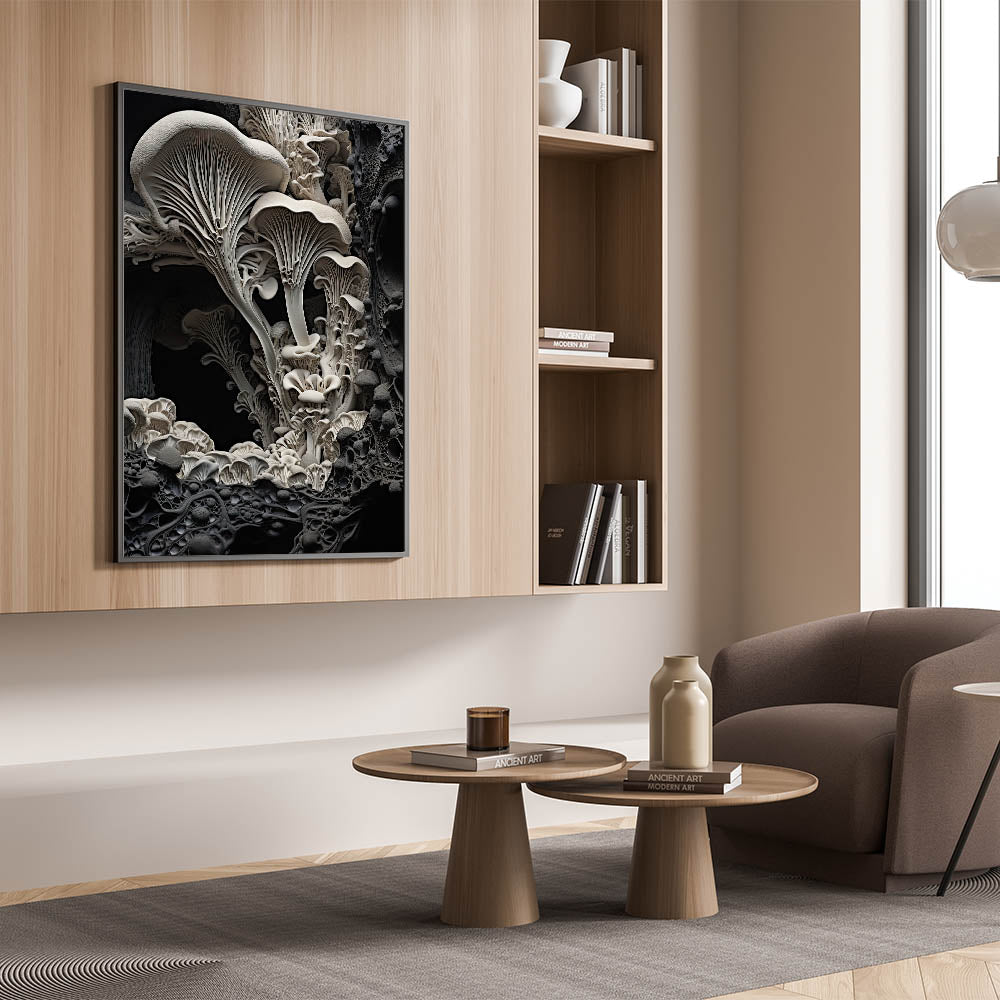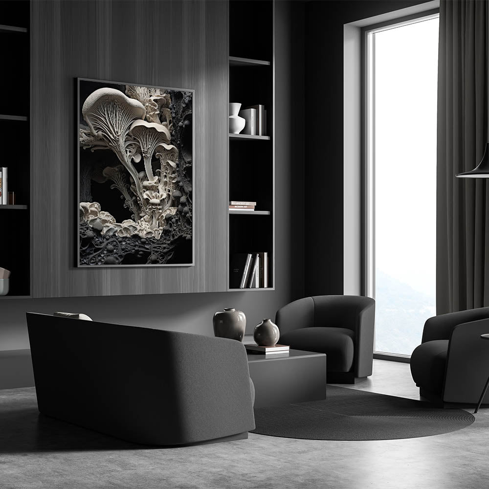 Transform your living space with this stunning nature closeup wall art, featuring an intricate high-resolution macro photograph of elegant mushrooms. Perfect for nature enthusiasts, this design showcases the delicate details and textures of fungi, making it a captivating focal point for modern interiors.