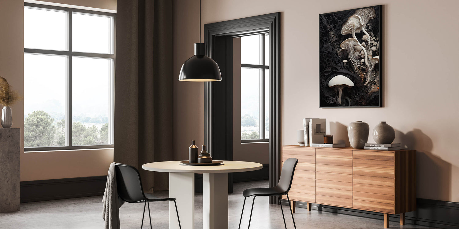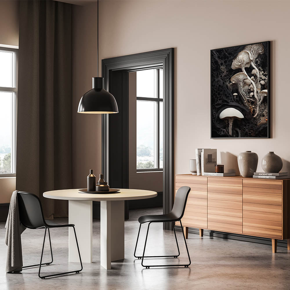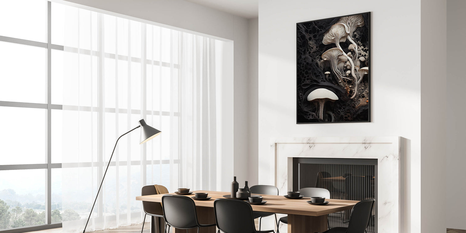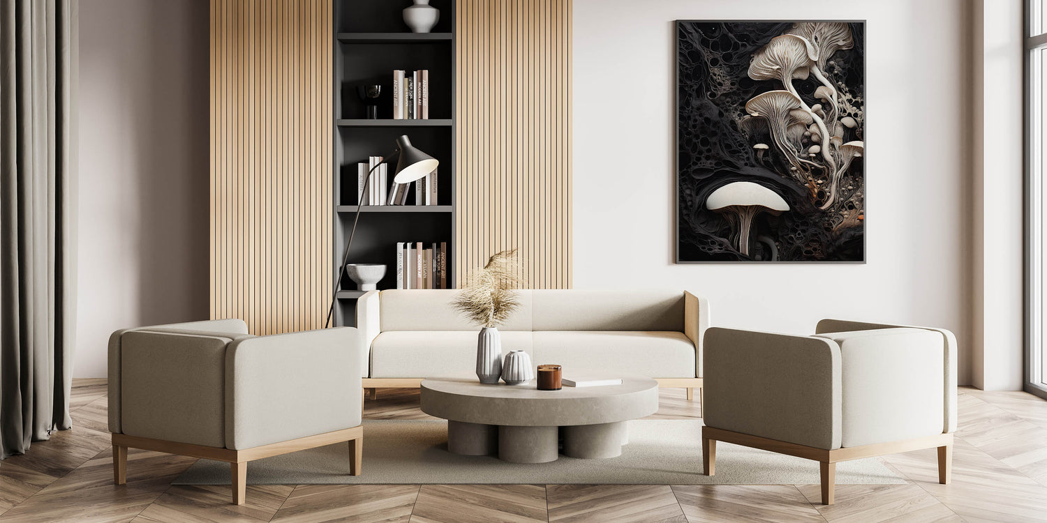 Experience the serene beauty of nature with this elegant mushroom cluster macro wall art. Featuring a detailed closeup of delicate mushrooms, the artwork showcases the graceful flow of stems and the intricate gills, highlighted by a soft cream and beige palette. The deep black background provides a striking contrast, bringing out the fine textures and adding a touch of drama to the piece.