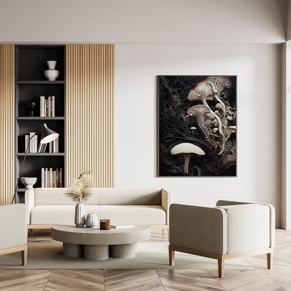 Elegant Mushroom Cluster Macro Art – Cream and Black Nature Wall Decor