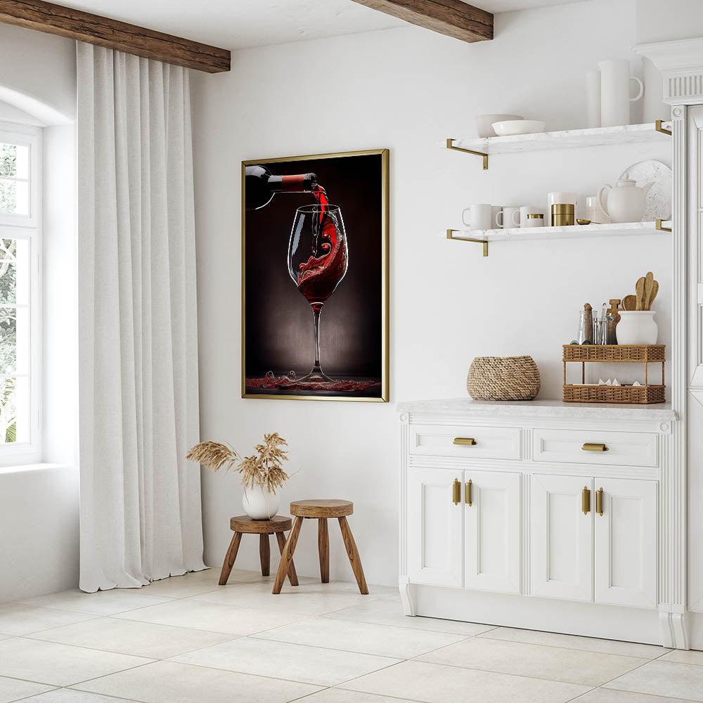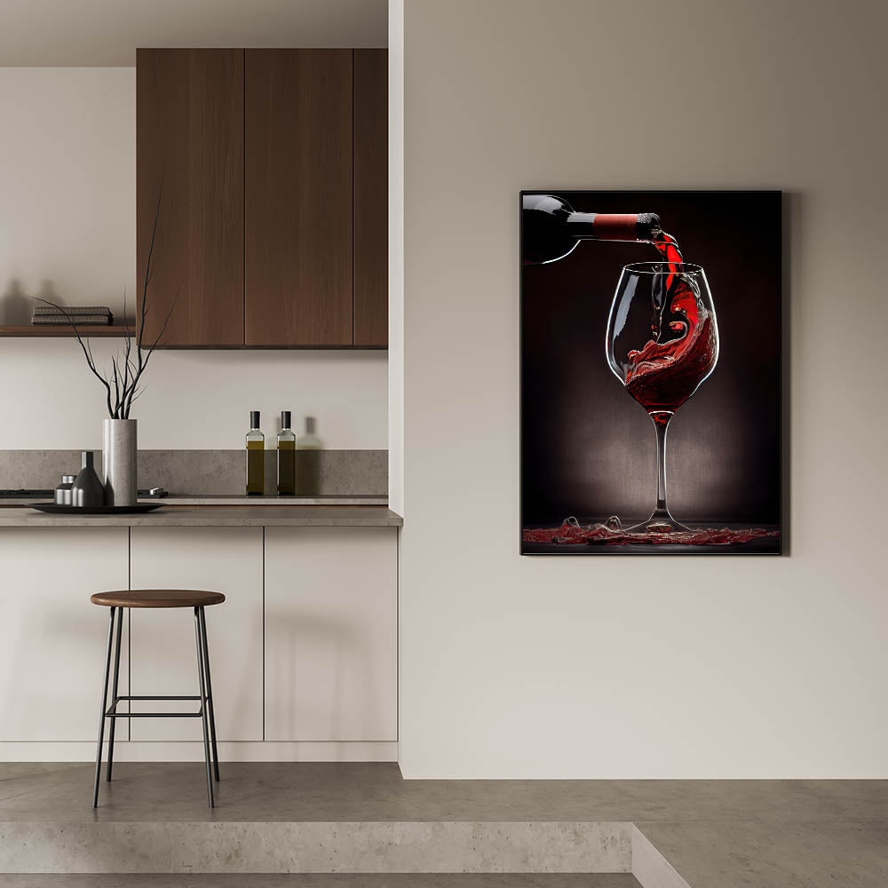 Enhance your kitchen wall decor with this exquisite modern kitchen art, featuring a captivating red wine pour in stunning detail. The deep burgundy hues contrast beautifully against the dark background, creating a sense of luxury and elegance. This kitchen artwork is perfect for wine enthusiasts and those who appreciate the finer details of contemporary decor.
