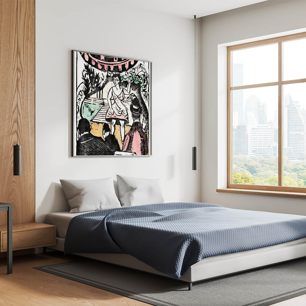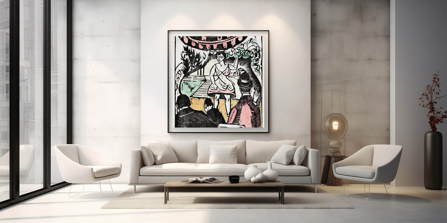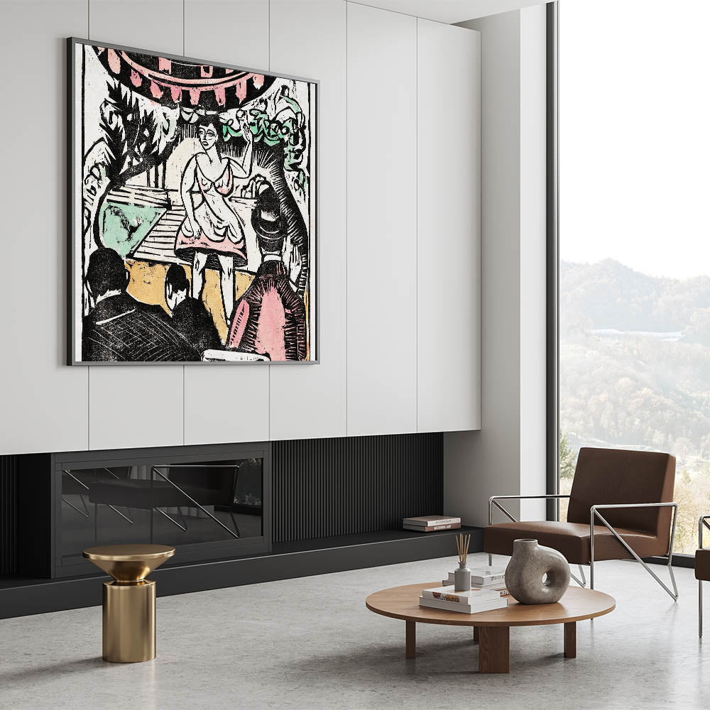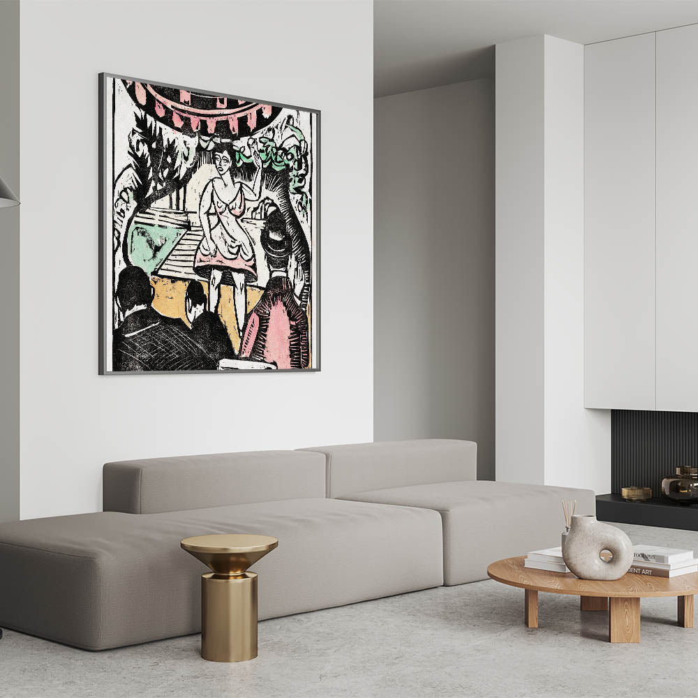 Step into the dynamic world of Expressionism with Ernst Ludwig Kirchner's "Little Variety Act with Singer." This striking piece captures the energy and vibrancy of a lively performance scene, rendered with bold lines and expressive details. The soft pastel hues of pink, green, and yellow contrast beautifully with the stark black elements, creating a captivating composition that embodies Kirchner's distinctive style.