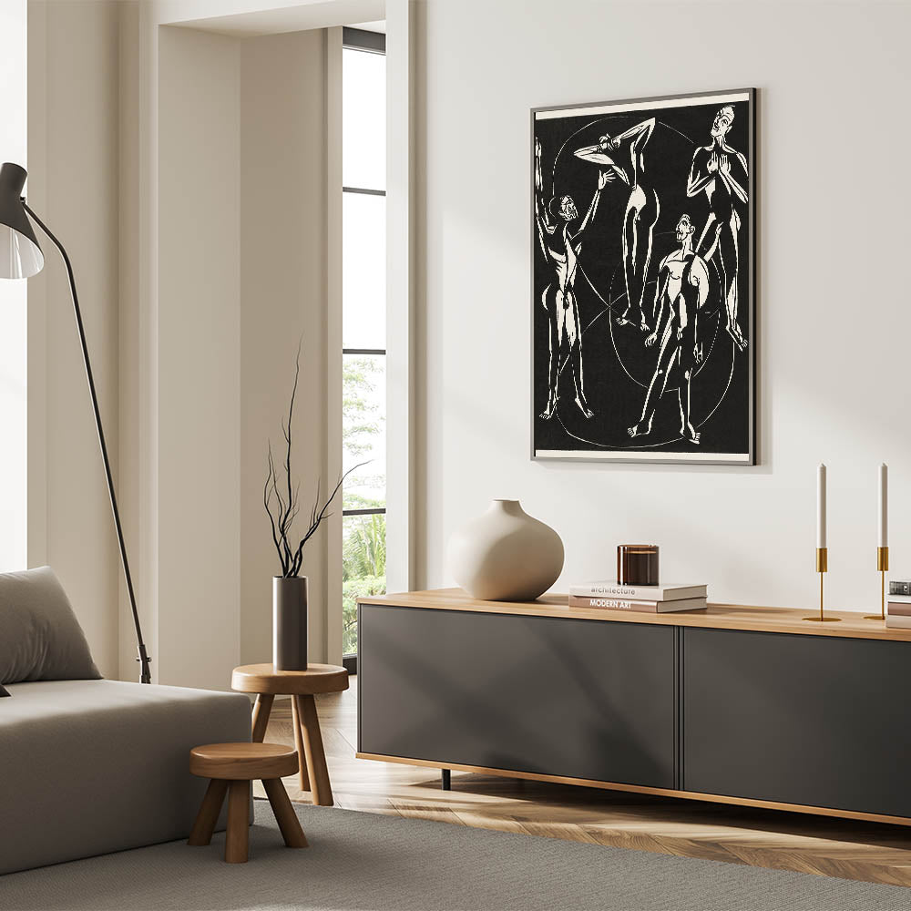Explore the raw emotional intensity of Ernst Ludwig Kirchner’s Feelings. This bold Expressionist artwork captures the essence of human emotion through dynamic black-and-white contrasts and angular forms. The abstract figures convey movement and interconnectedness, inviting viewers to reflect on the complexity of human experiences. Kirchner’s striking woodcut technique adds depth and texture, making this piece a compelling focal point for any modern or minimalist space.