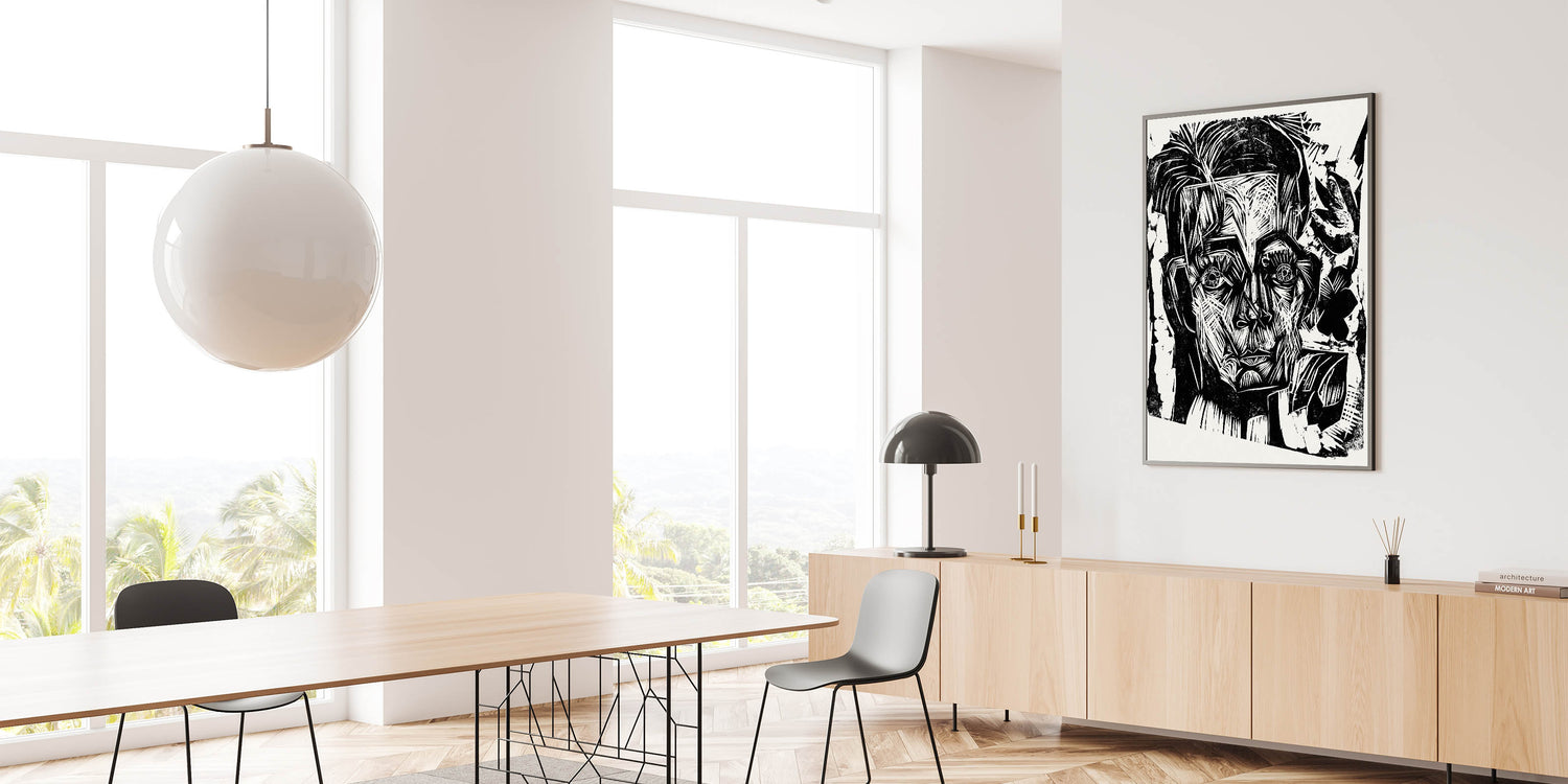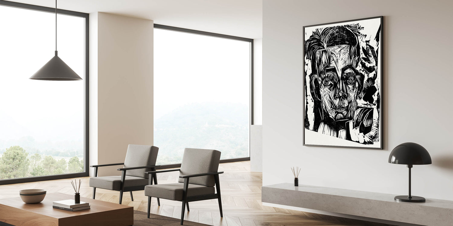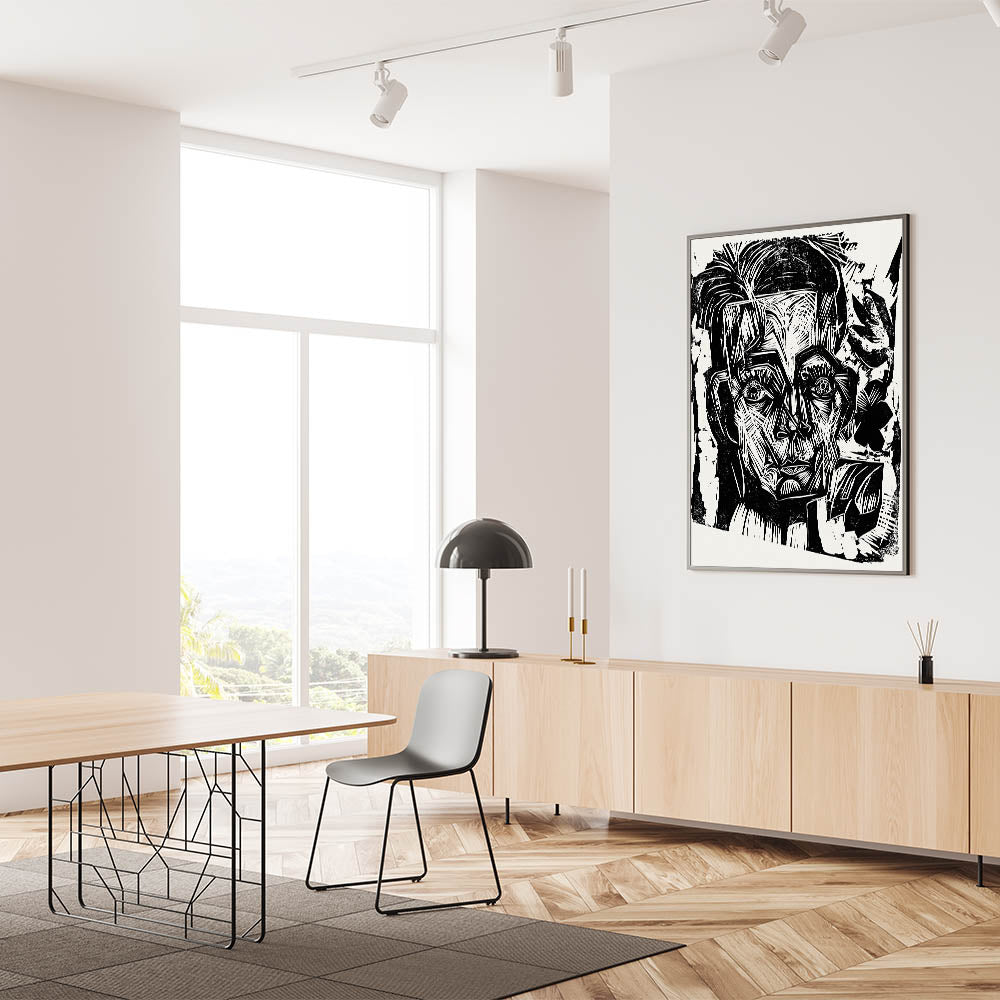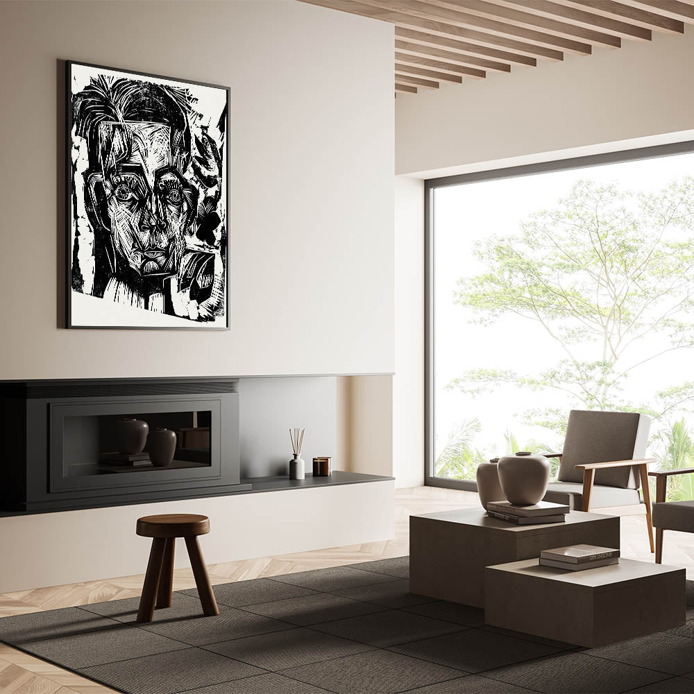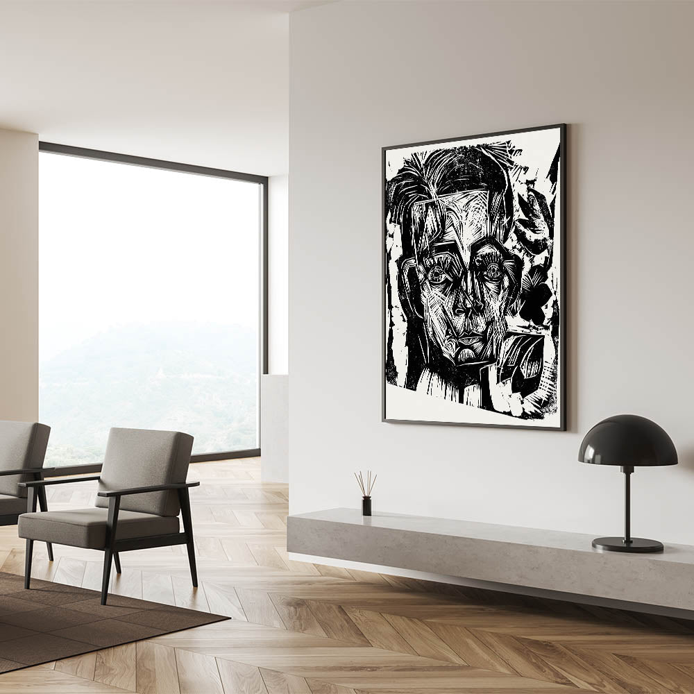 Add a touch of drama and intrigue to your space with this stunning Expressionist Art piece. This bold monochrome portrait, rendered in a woodcut style, captures the raw emotion and depth characteristic of the Expressionist movement. The sharp, angular lines and intricate detailing make it a standout artwork for modern and contemporary spaces.