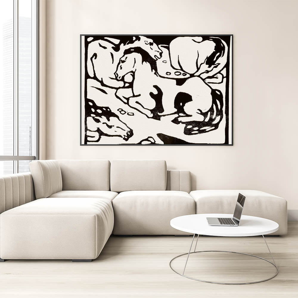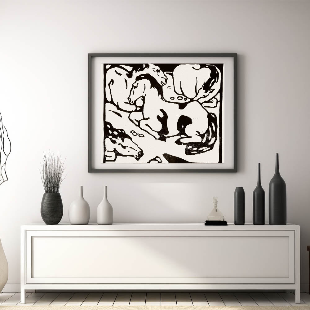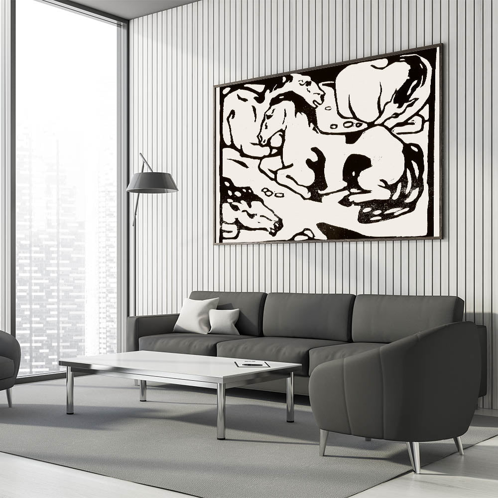 Bring a touch of modern artistry to your home with this captivating Expressionist piece, Resting Horses, inspired by the renowned Franz Marc. This design celebrates the harmony of nature and form, rendered in bold monochromatic tones that emphasize the powerful imagery of resting horses. Perfect for art enthusiasts, this piece is a striking example of Expressionism's emotive and abstract qualities.