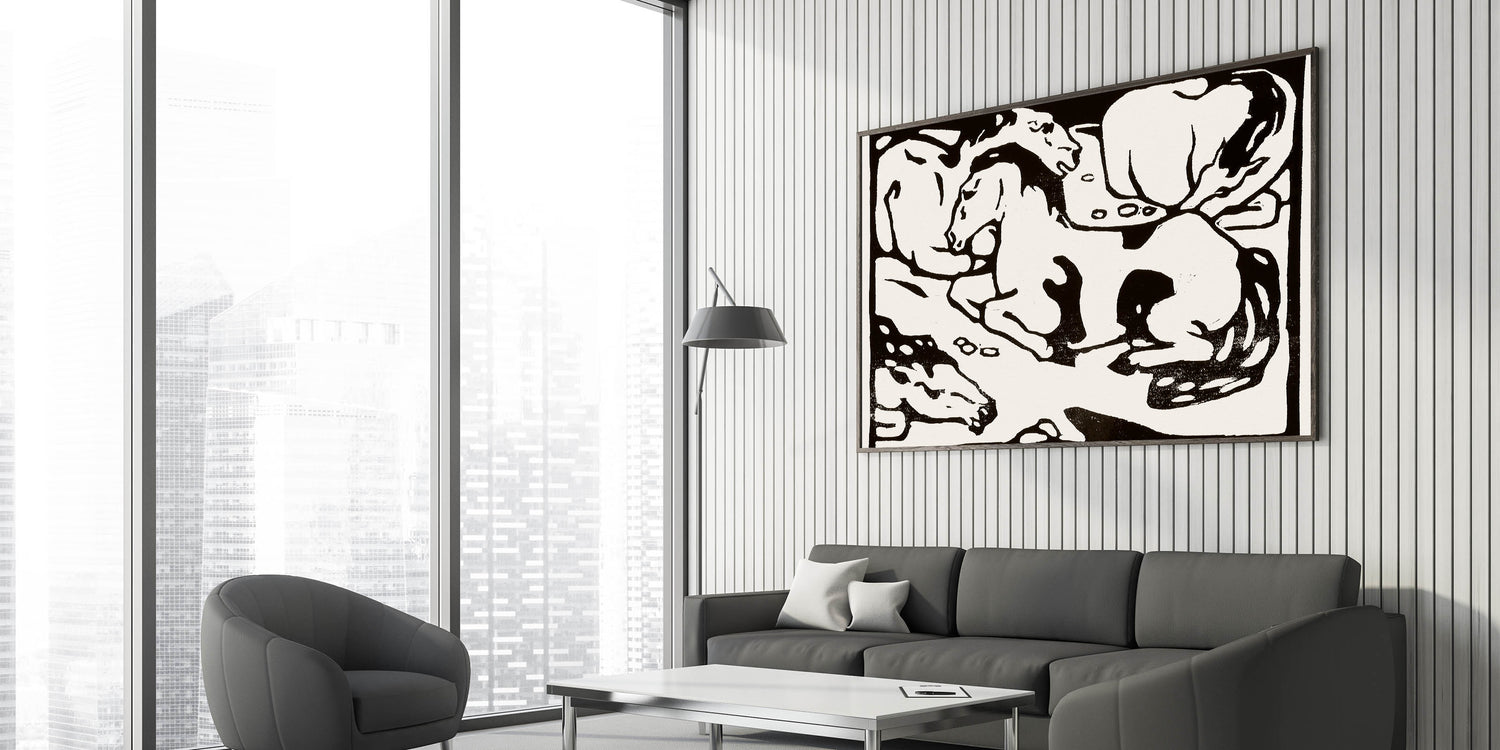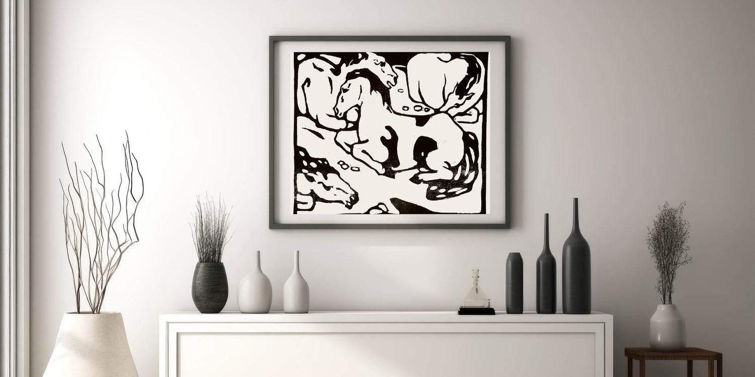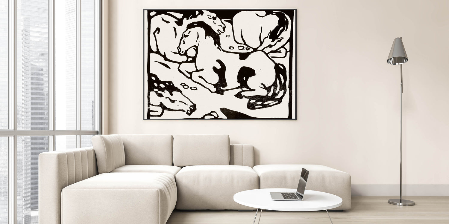 Bring a touch of modern artistry to your home with this captivating Expressionist piece, Resting Horses, inspired by the renowned Franz Marc. This design celebrates the harmony of nature and form, rendered in bold monochromatic tones that emphasize the powerful imagery of resting horses. Perfect for art enthusiasts, this piece is a striking example of Expressionism's emotive and abstract qualities.