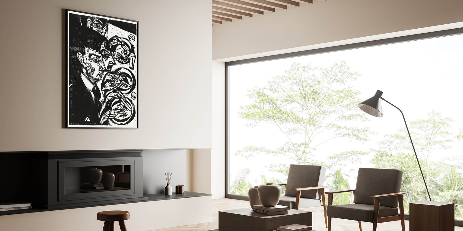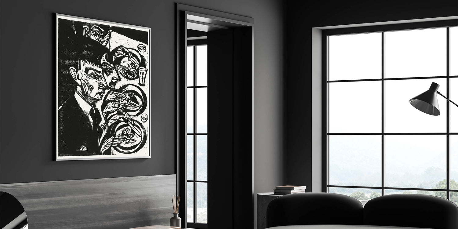 Make a bold statement with this striking Expressionist dinner scene wall art. Rendered in dramatic black and white, this piece captures the raw emotion and intensity of the human experience. The intricate woodcut-style lines create a powerful narrative, perfect for adding depth and character to your space.