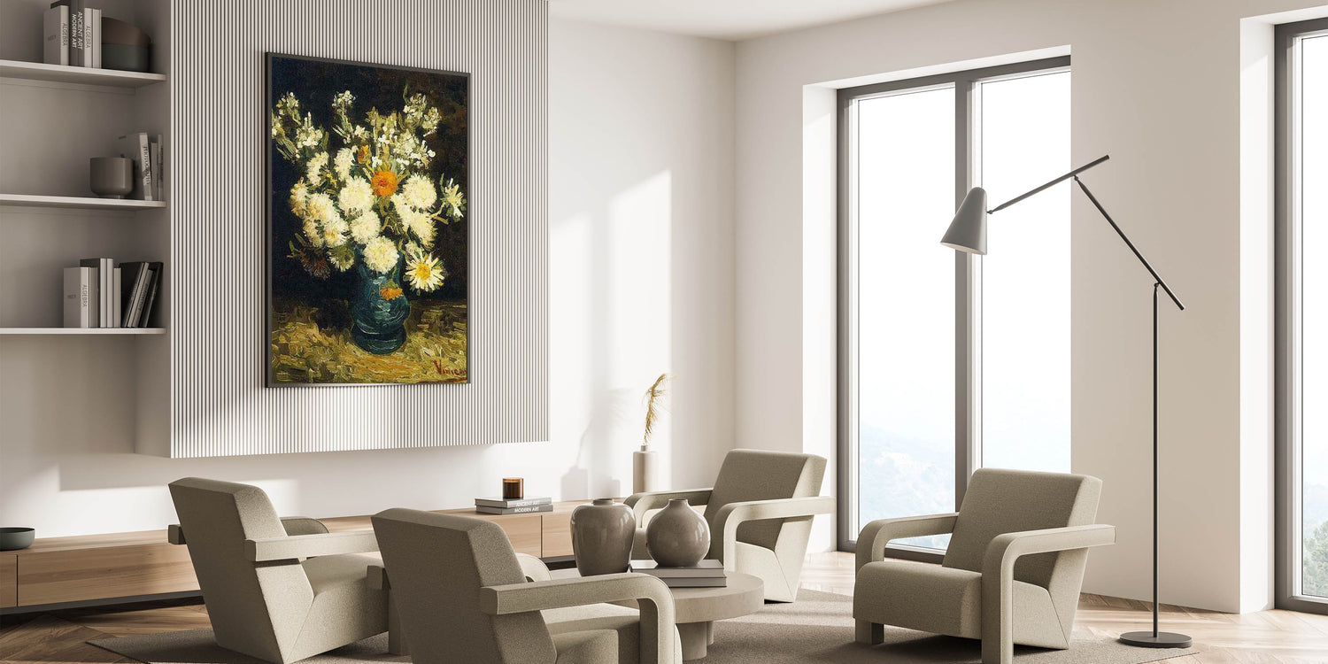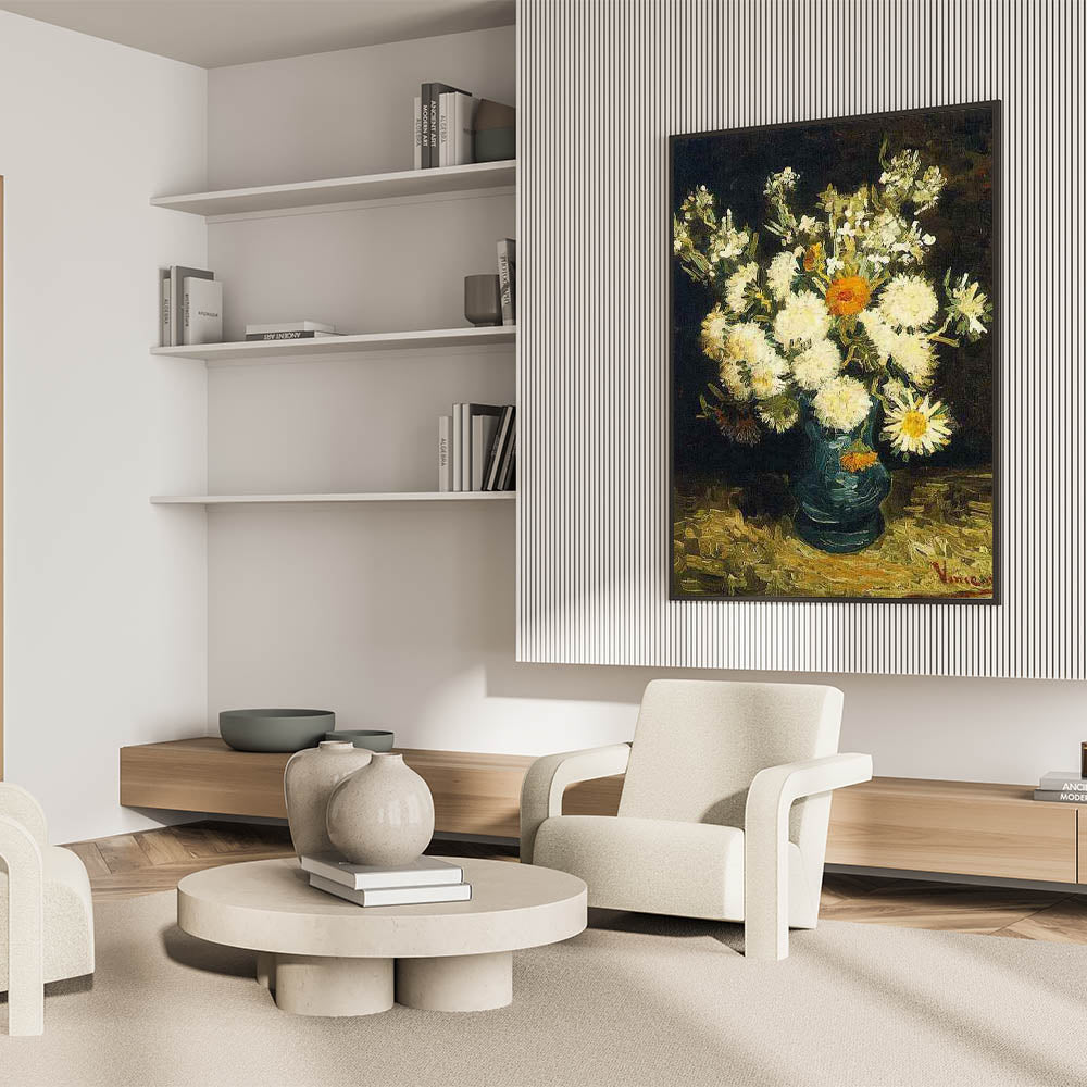 Experience the timeless beauty of famous van Gogh paintings with this exquisite depiction of chrysanthemums in a vase. Set against a dark, textured background, the white and orange blooms radiate warmth and elegance, making it a striking addition to any room. This artwork is ideal for those who appreciate Vincent van Gogh’s ability to capture the beauty of nature in a captivating way.